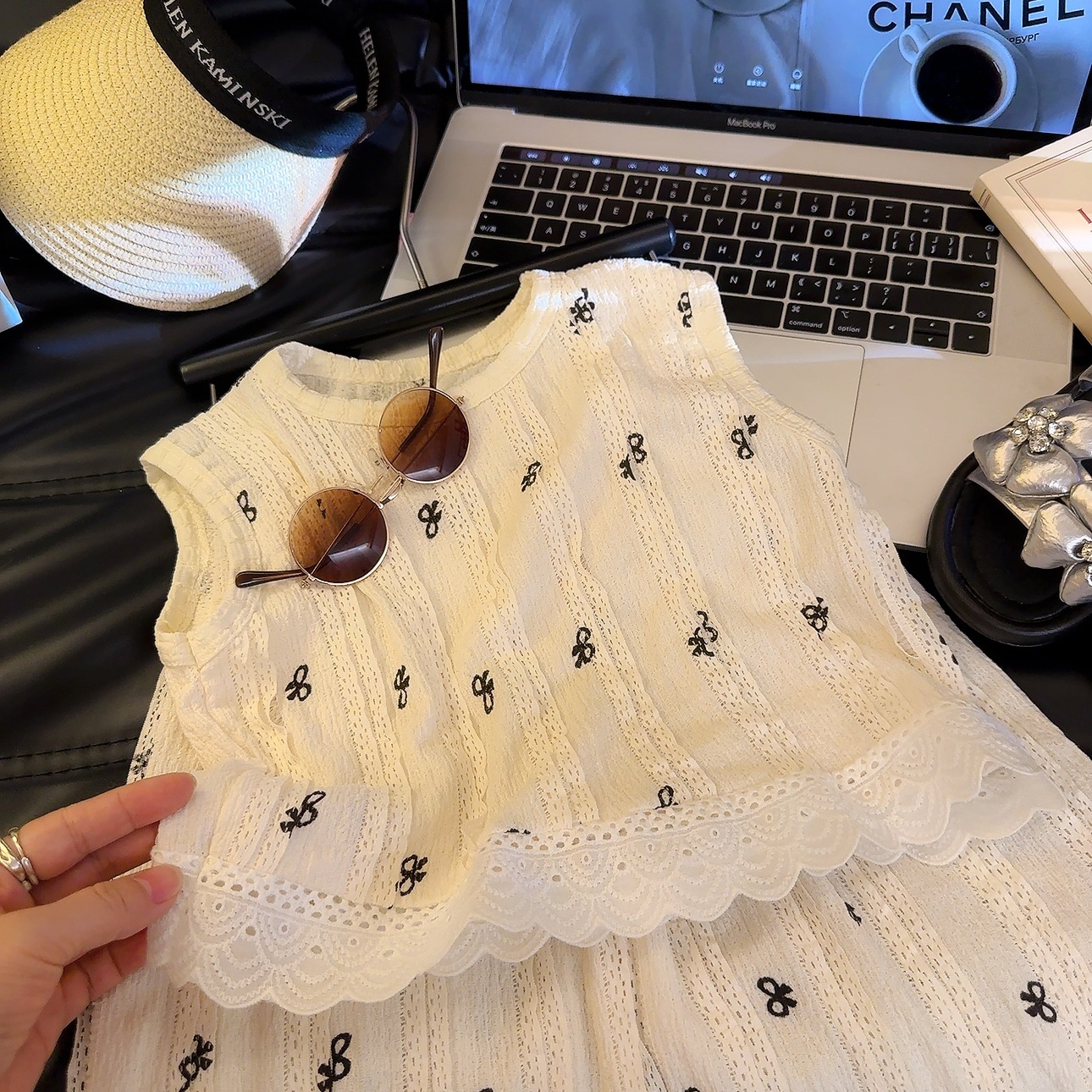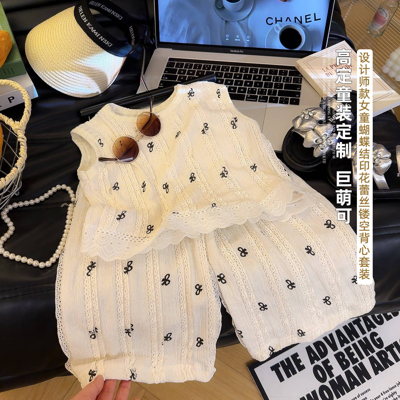 여름 신작 어린이 중공 레이스 조끼 정장 소녀 한국 스타일 유행 탑 와이드 레그 팬츠 패션 아동 의류 A스토어 가기