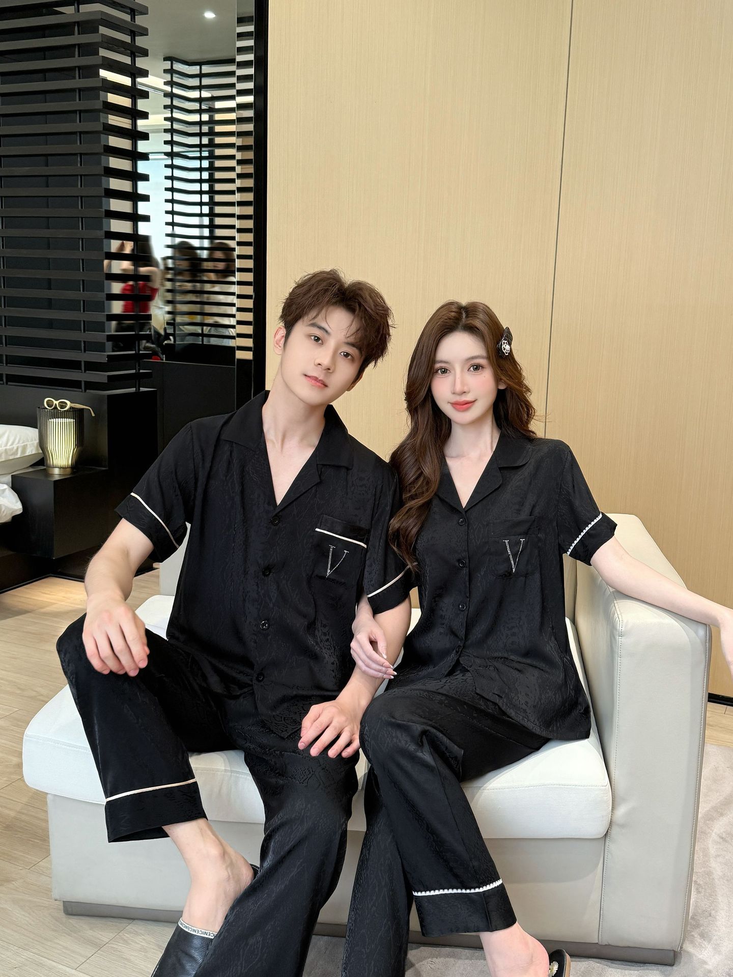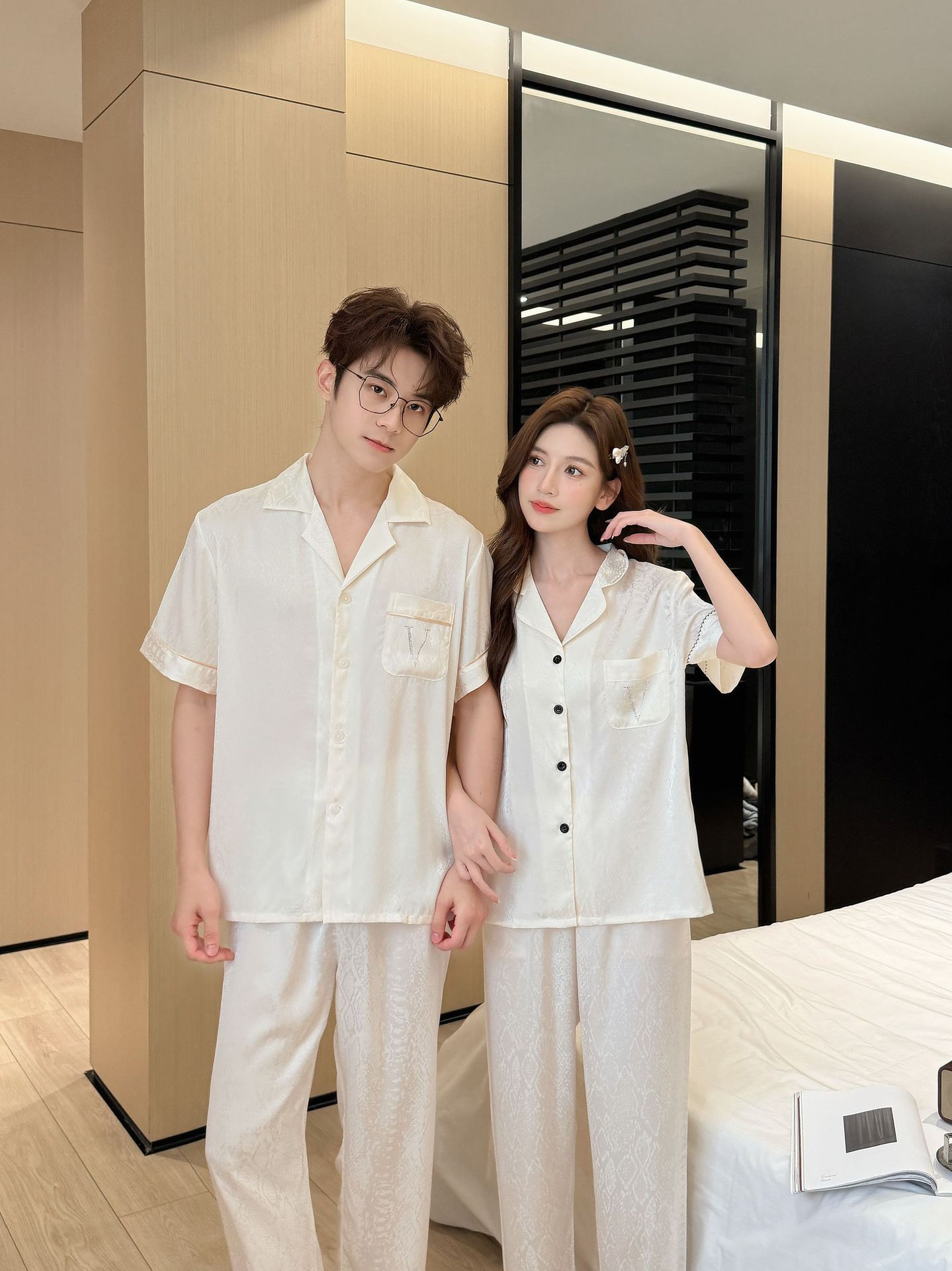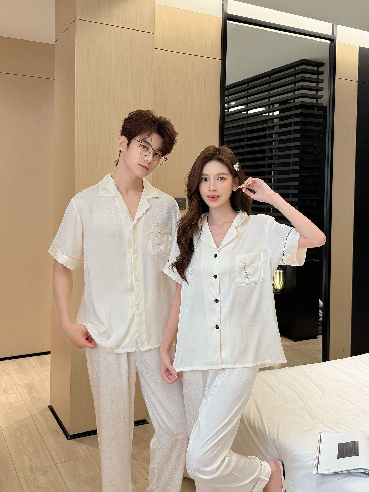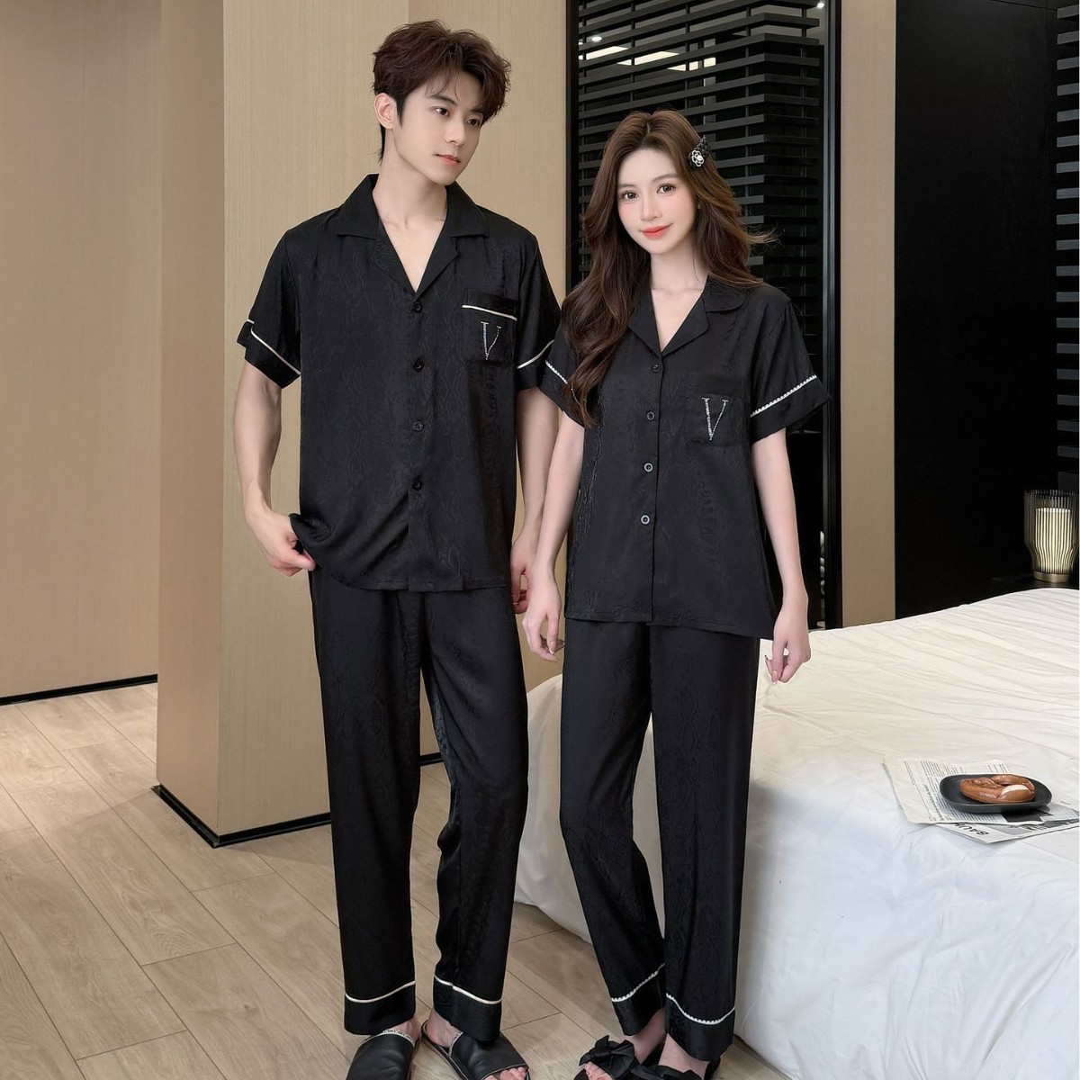 여름 신작 커플 핫 다이아몬드 V 자카드 여성 잠옷 반팔 바지 시크릿 하이 럭셔리 남성 플러스 사이즈 홈웨어