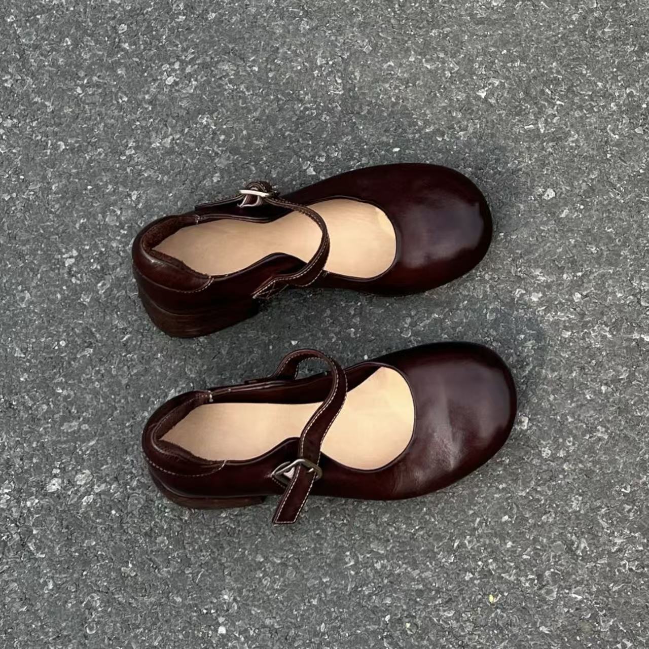 여름 신상품! 여성을 위한 복고풍 라운드 토 원 스트랩 메리 제인 신발 2025 문학적 기질 얕은 입 부드러운 밑창 작은 가죽 신발