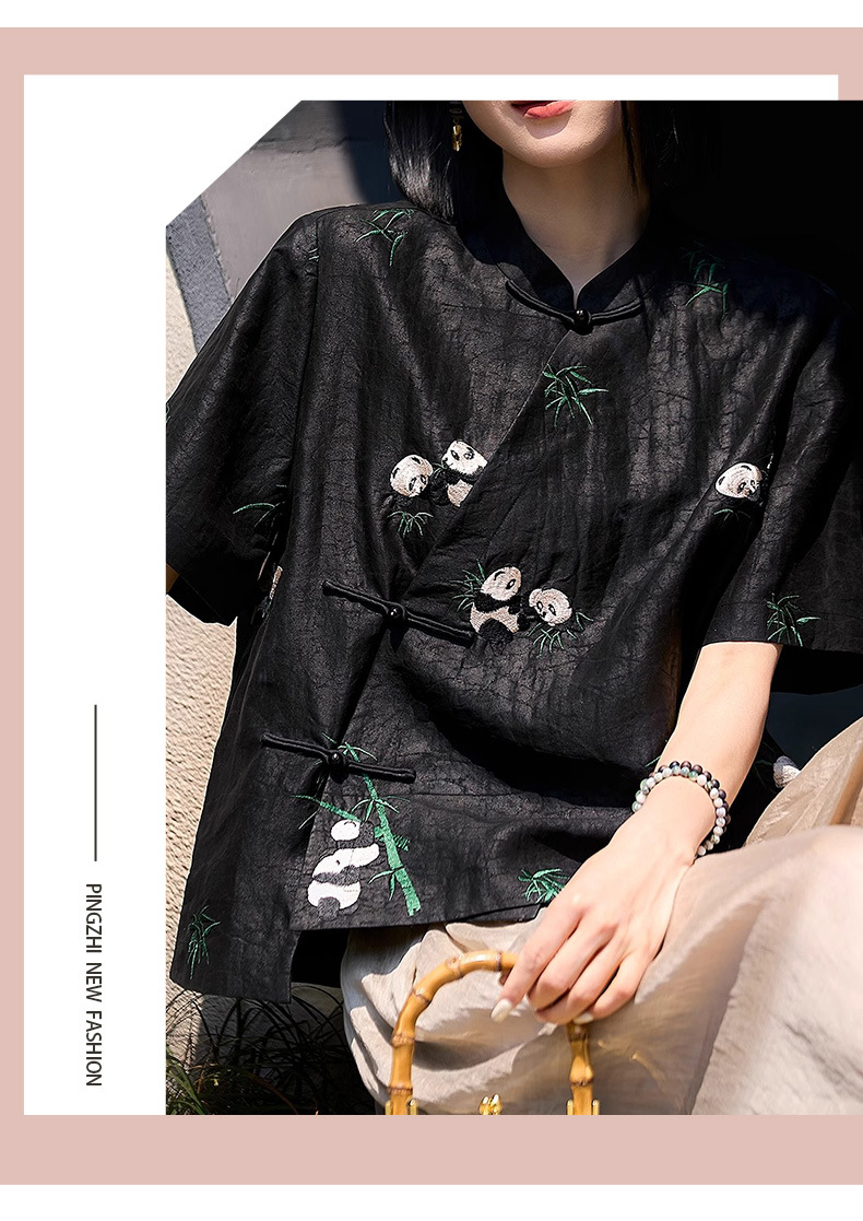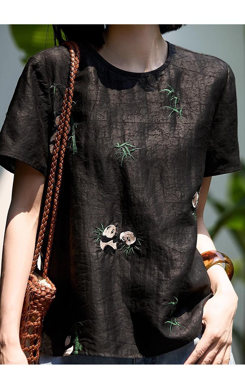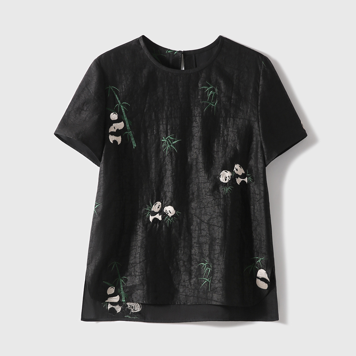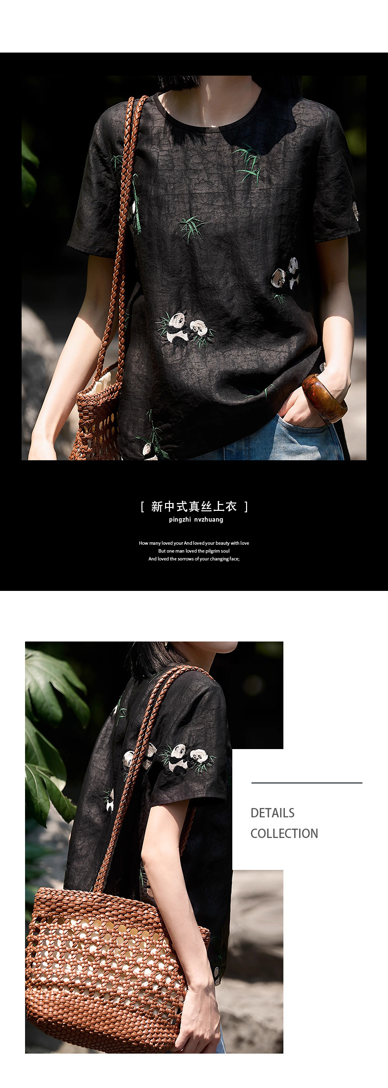 22MM 향기로운 구름 원사/거북이 패턴 팬더 자수 새로운 중국 스타일 실크 탑 티셔츠 뽕나무 실크 여성 여름 새 스타일