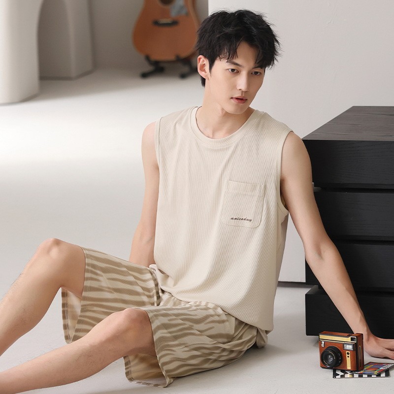 아이스 실크 스레드 남성 잠옷 여름 얇은 라운드 넥 조끼 반바지 청소년 캐주얼 루즈 핫 스타일 홈웨어스토어 가기