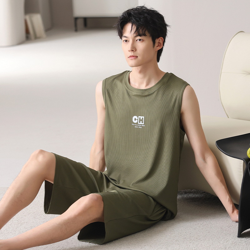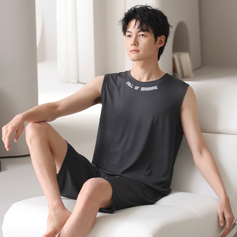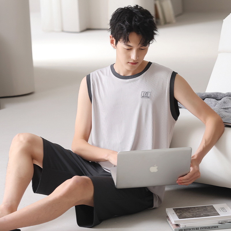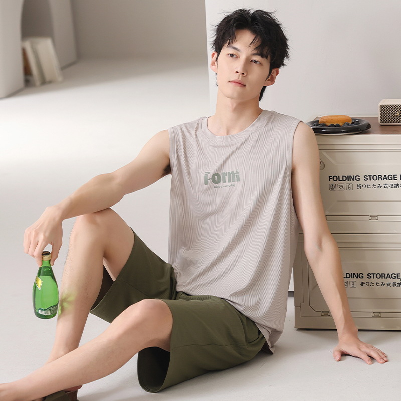 아이스 실크 스레드 남성 잠옷 여름 얇은 라운드 넥 조끼 반바지 청소년 캐주얼 루즈 핫 스타일 홈웨어