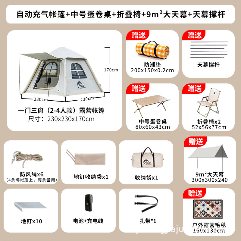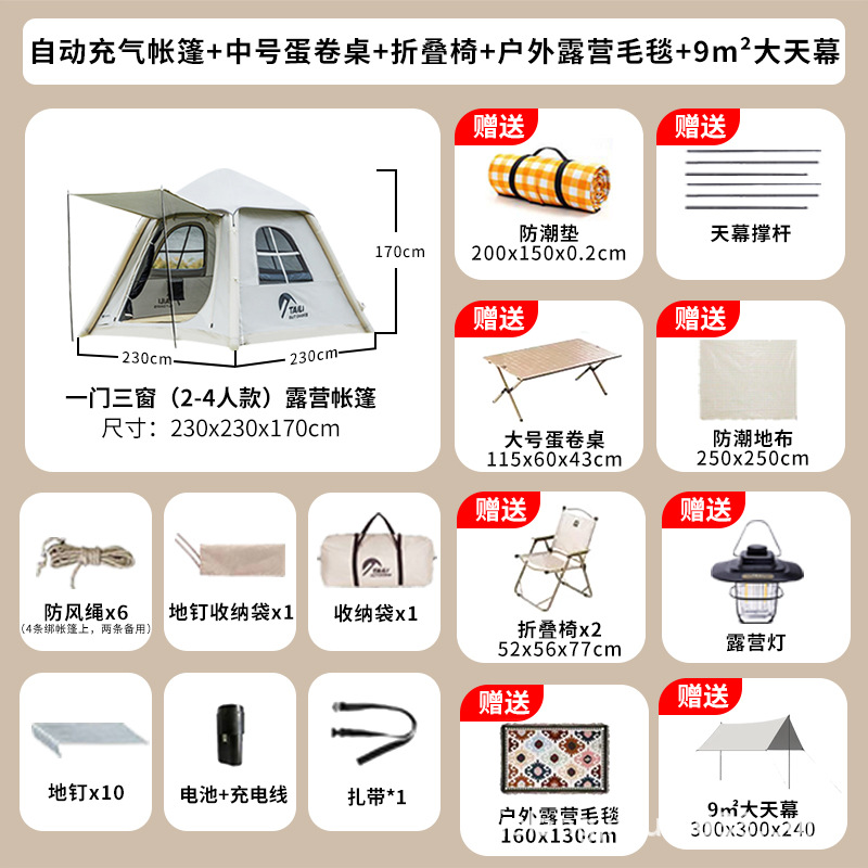 • [패키지 9] 자동 팽창식 텐트 + 대형 계란말이 테이블 + 접이식 의자 * 2 + 야외 캠핑 담요 + 캠핑 조명 + 캐노피 + 방습 바닥 천 + 캐노피 폴 + 방습 매트