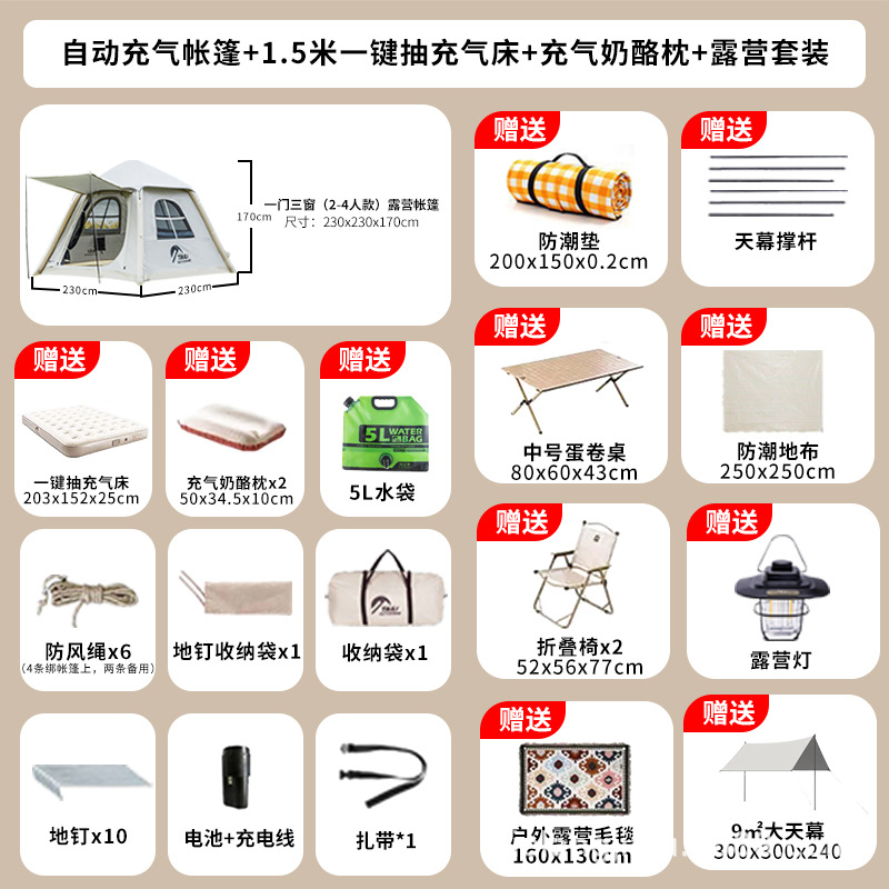 • [패키지 10] 자동 풍선 텐트 + 침대 1.5m 개 + 풍선 치즈 베개 * 2 + 캠핑 세트 + 방습 바닥 천 + 캐노피 폴 + 방습 매트