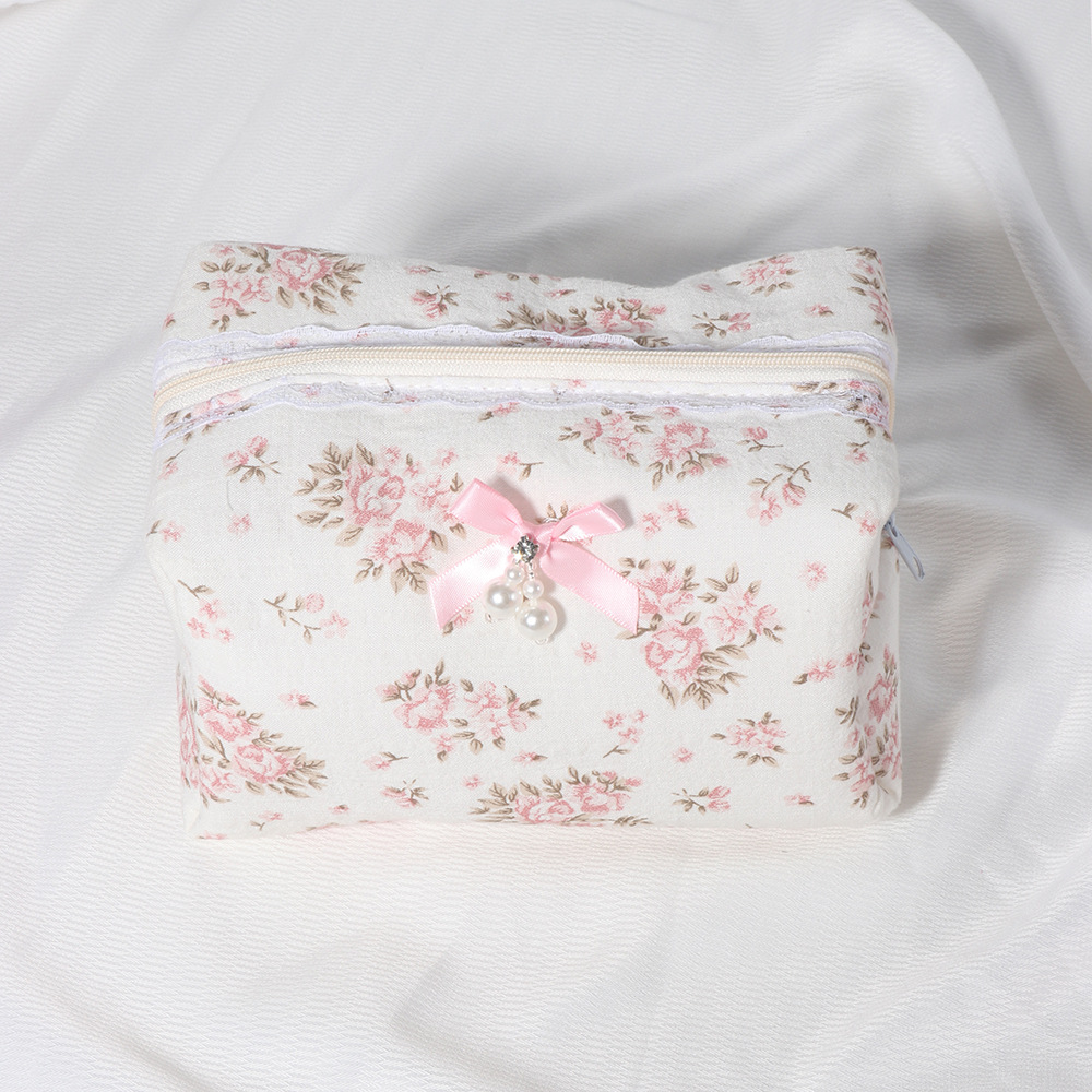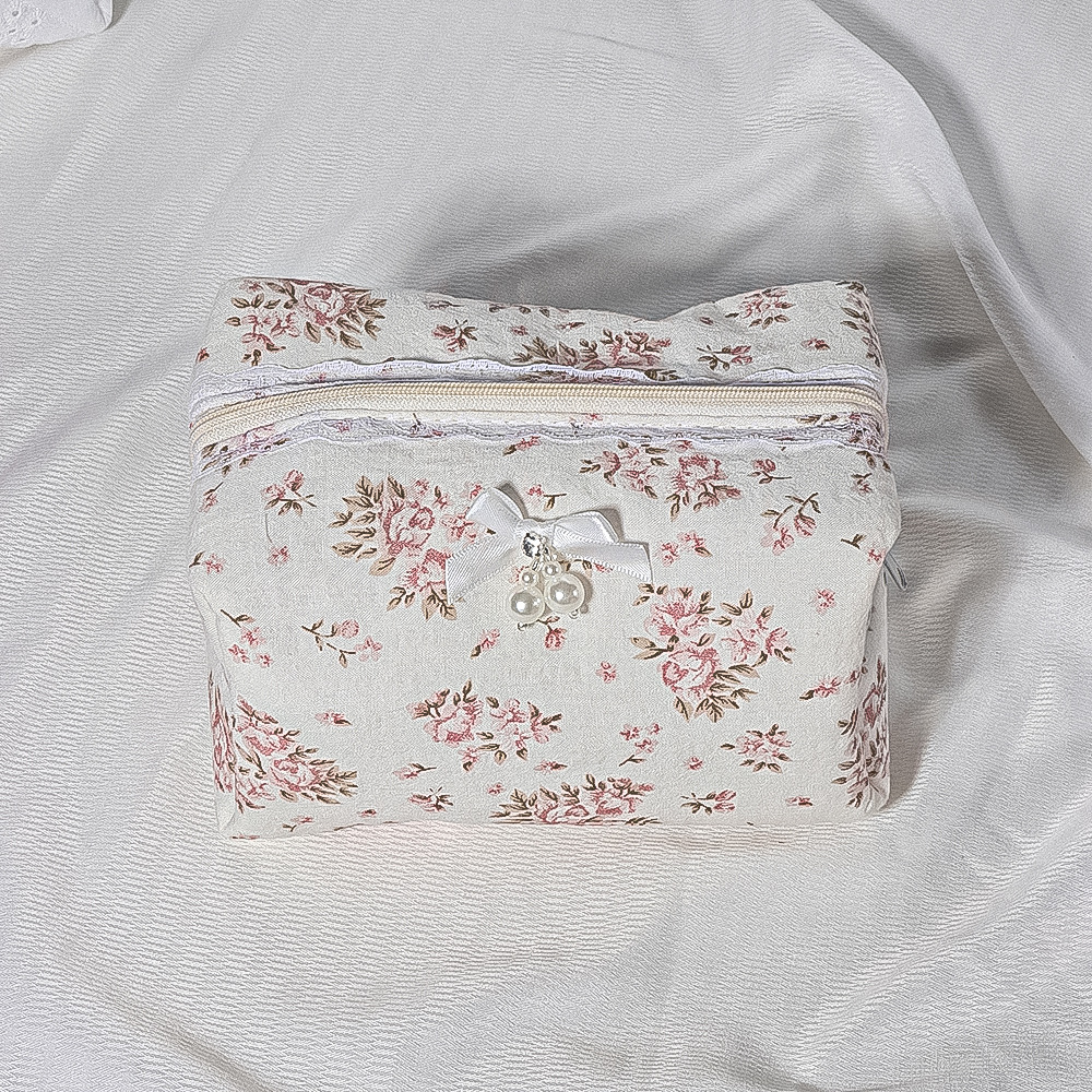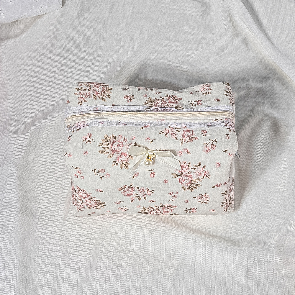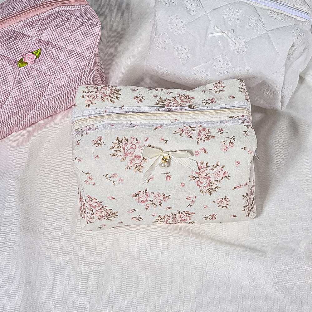 • 퀼팅 레이스 화장품 가방 + 리본 작은 흰색 구슬