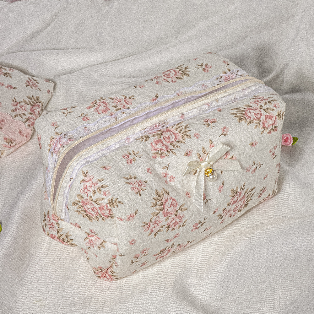 • 퀼팅 레이스 화장품 가방 + 리본 핑크 더블 비즈
