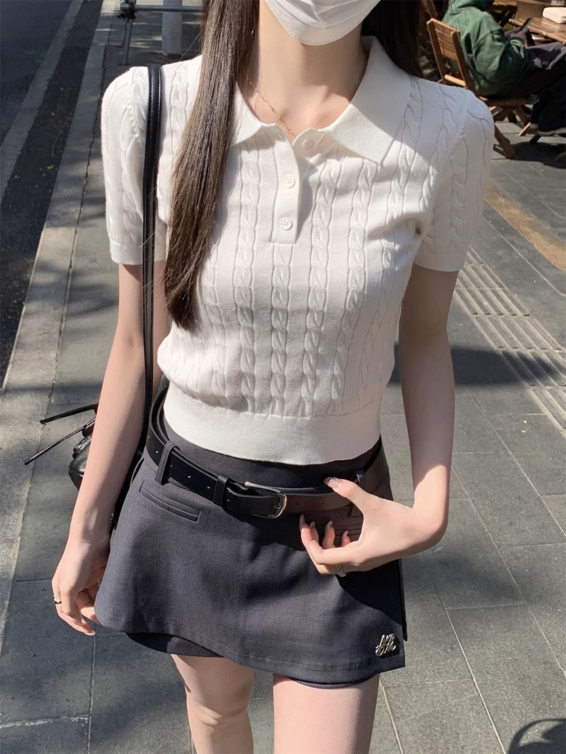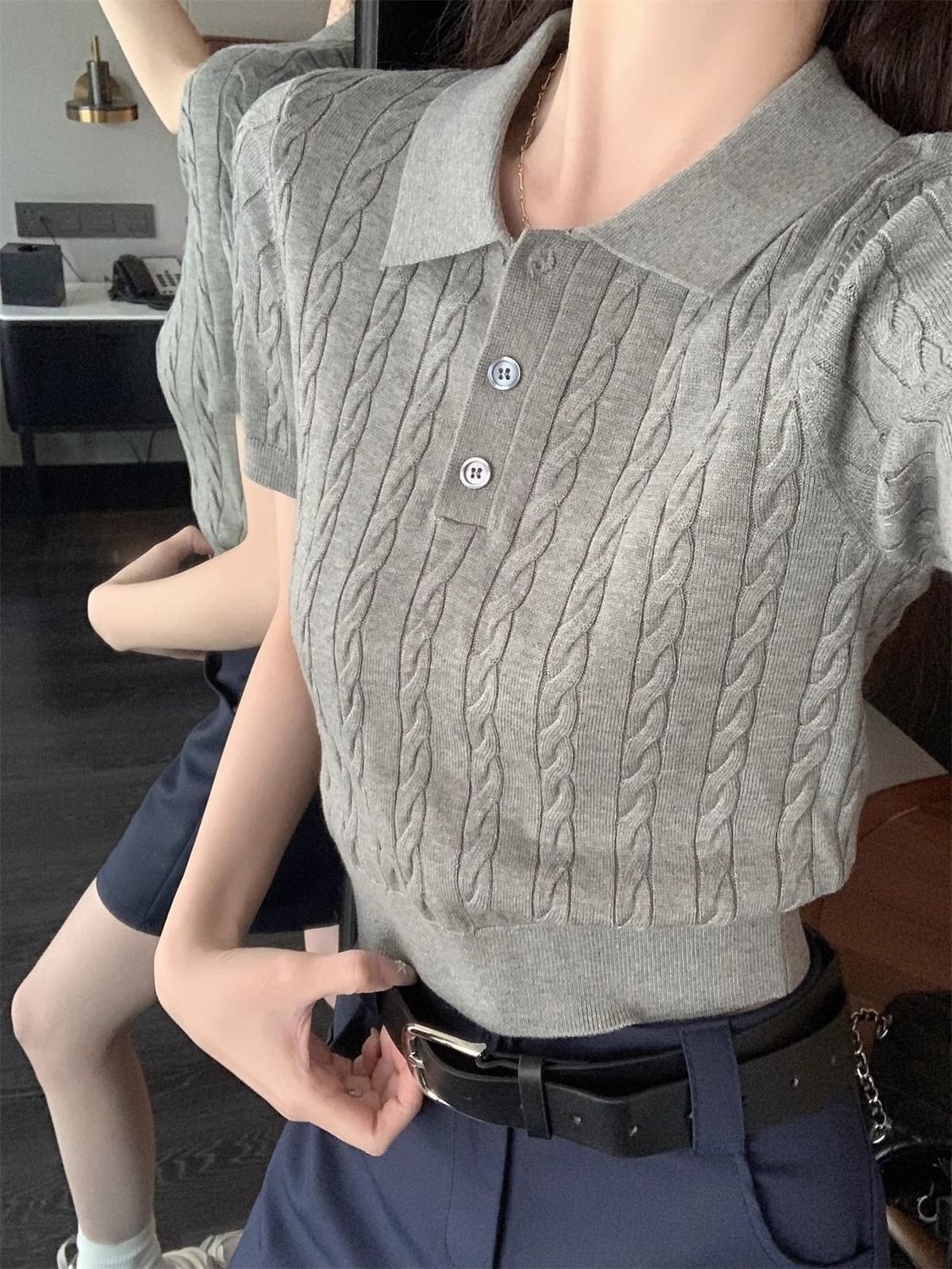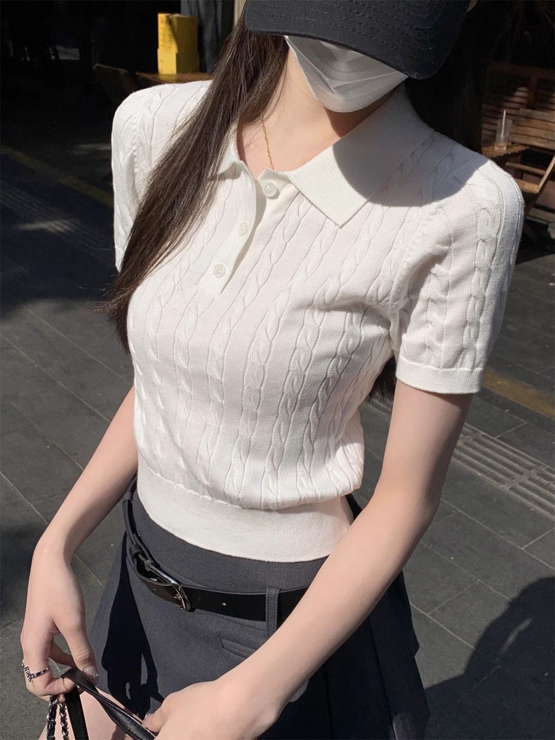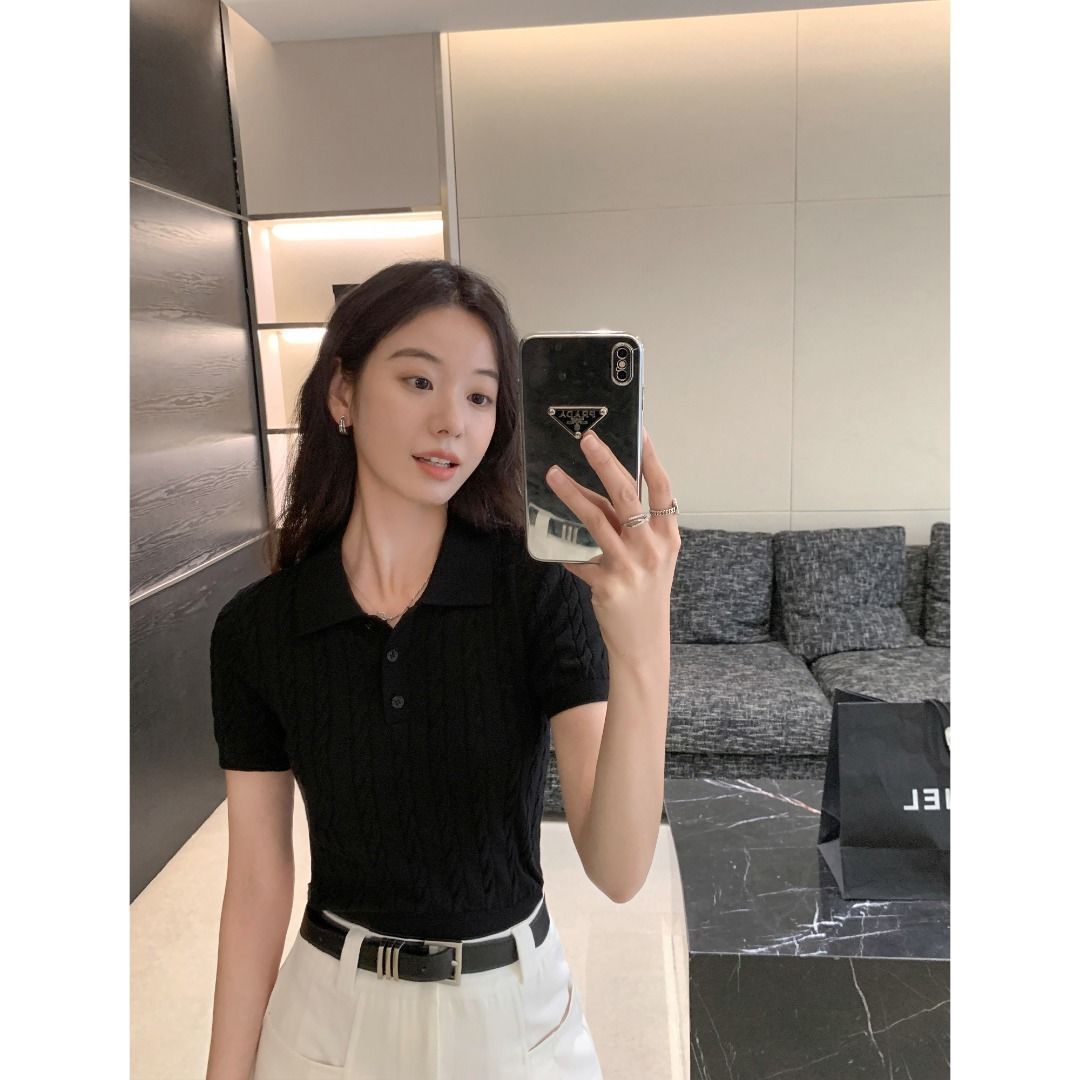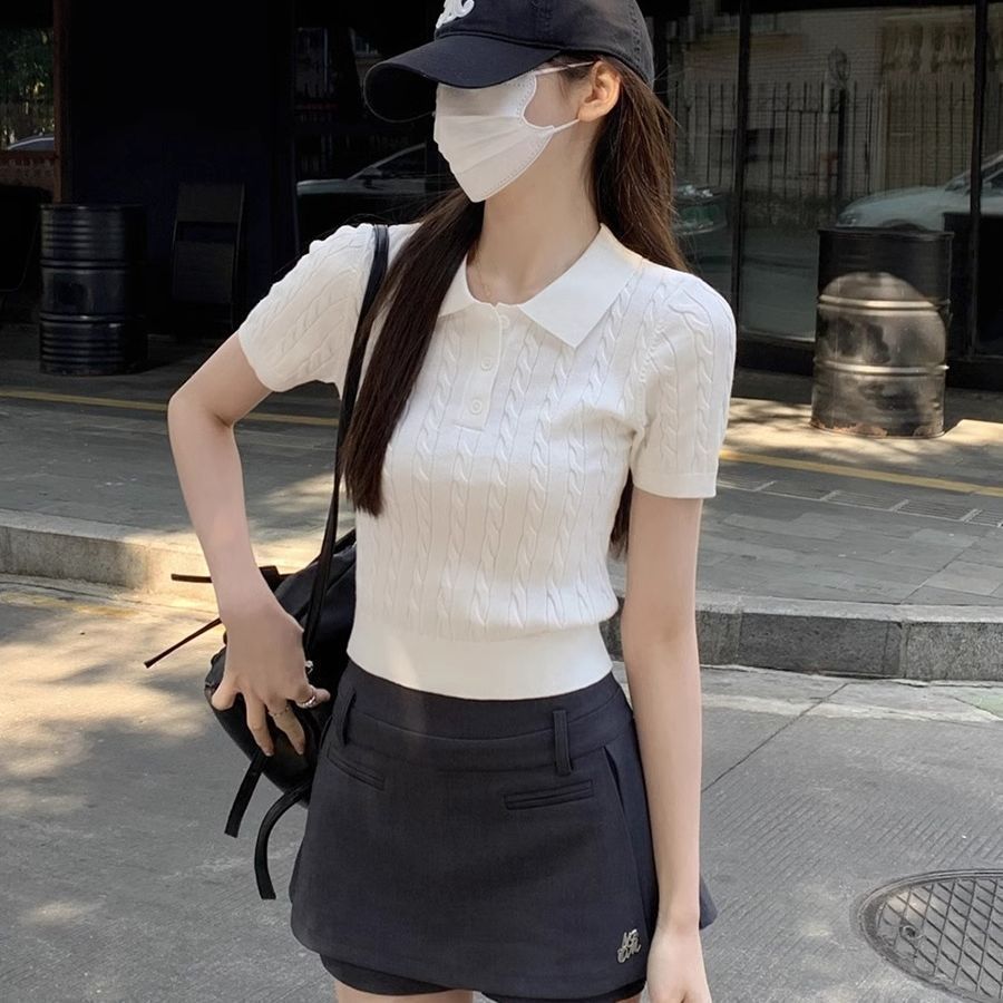 한국 트위스트 니트 스웨터 여성용 오른쪽 어깨 반팔 티셔츠 여름 얇은 틈새 슬리밍 폴로 칼라 탑 여성용스토어 가기