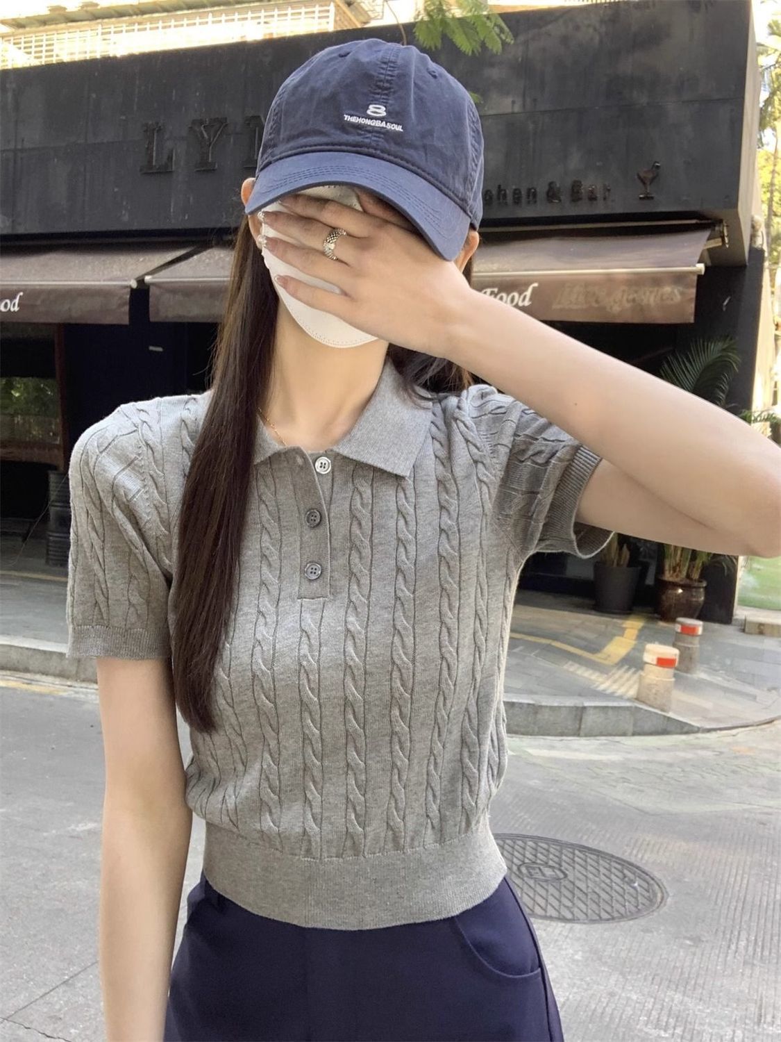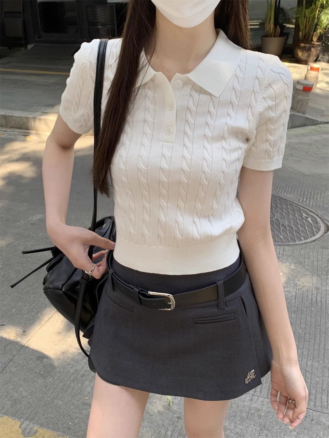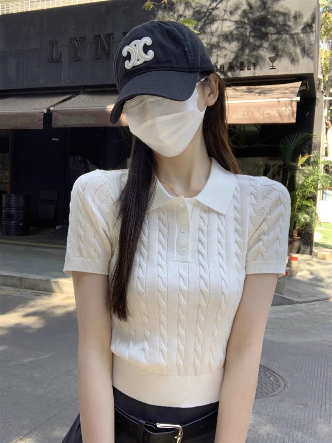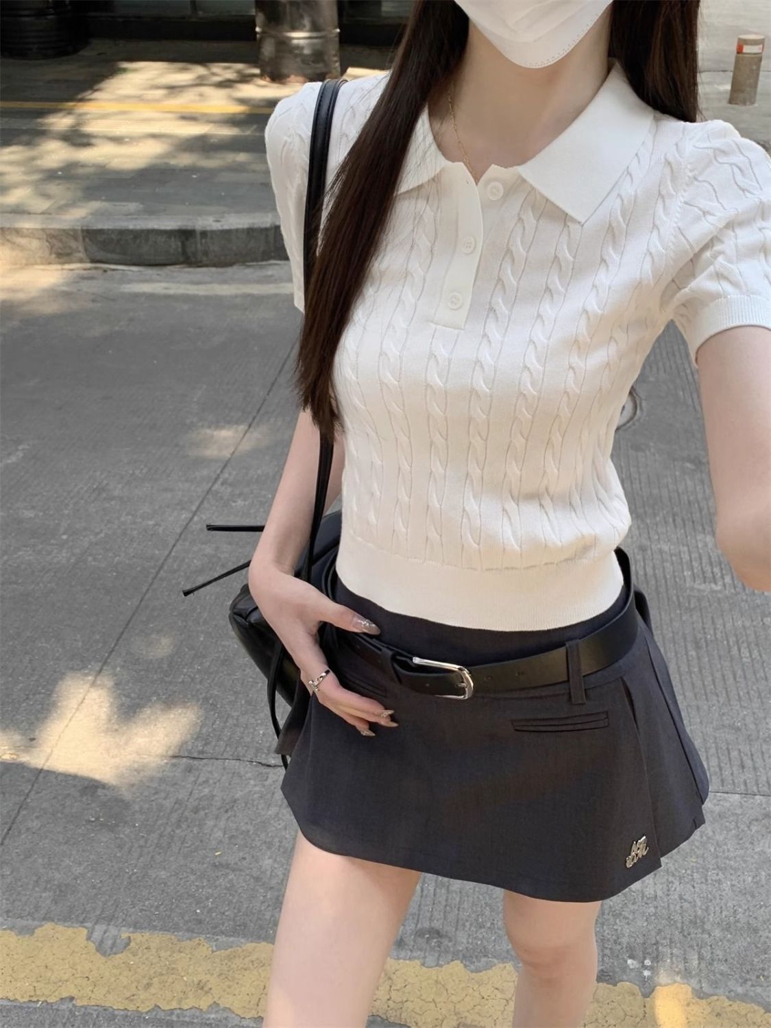 한국 트위스트 니트 스웨터 여성용 오른쪽 어깨 반팔 티셔츠 여름 얇은 틈새 슬리밍 폴로 칼라 탑 여성용스토어 가기