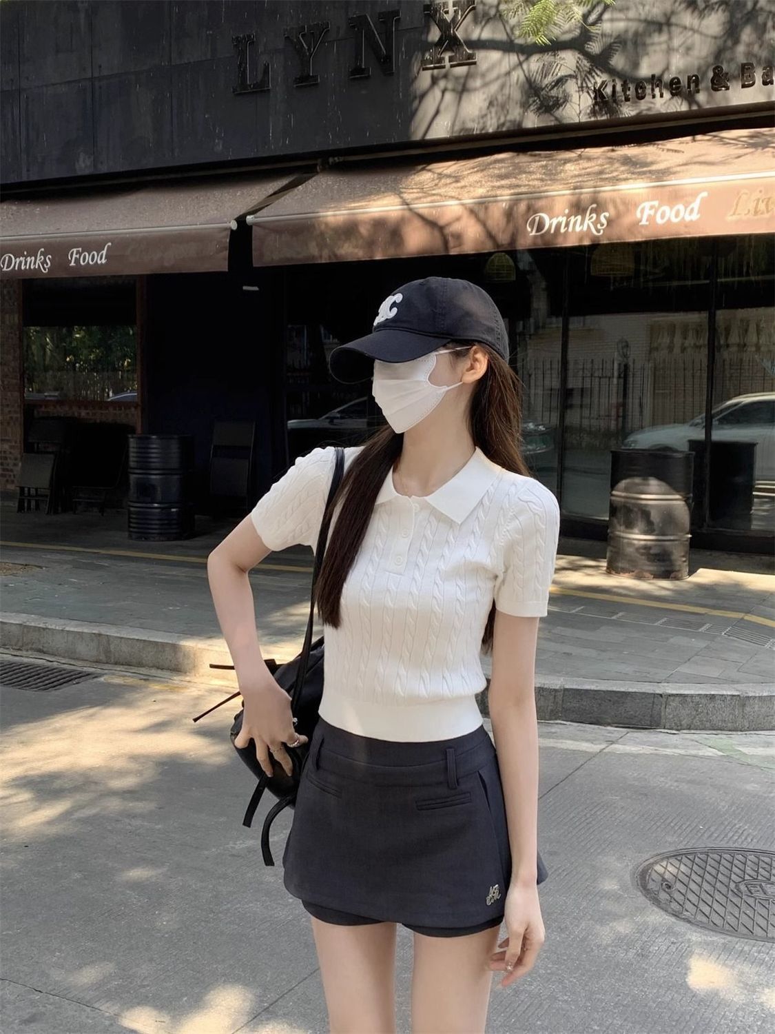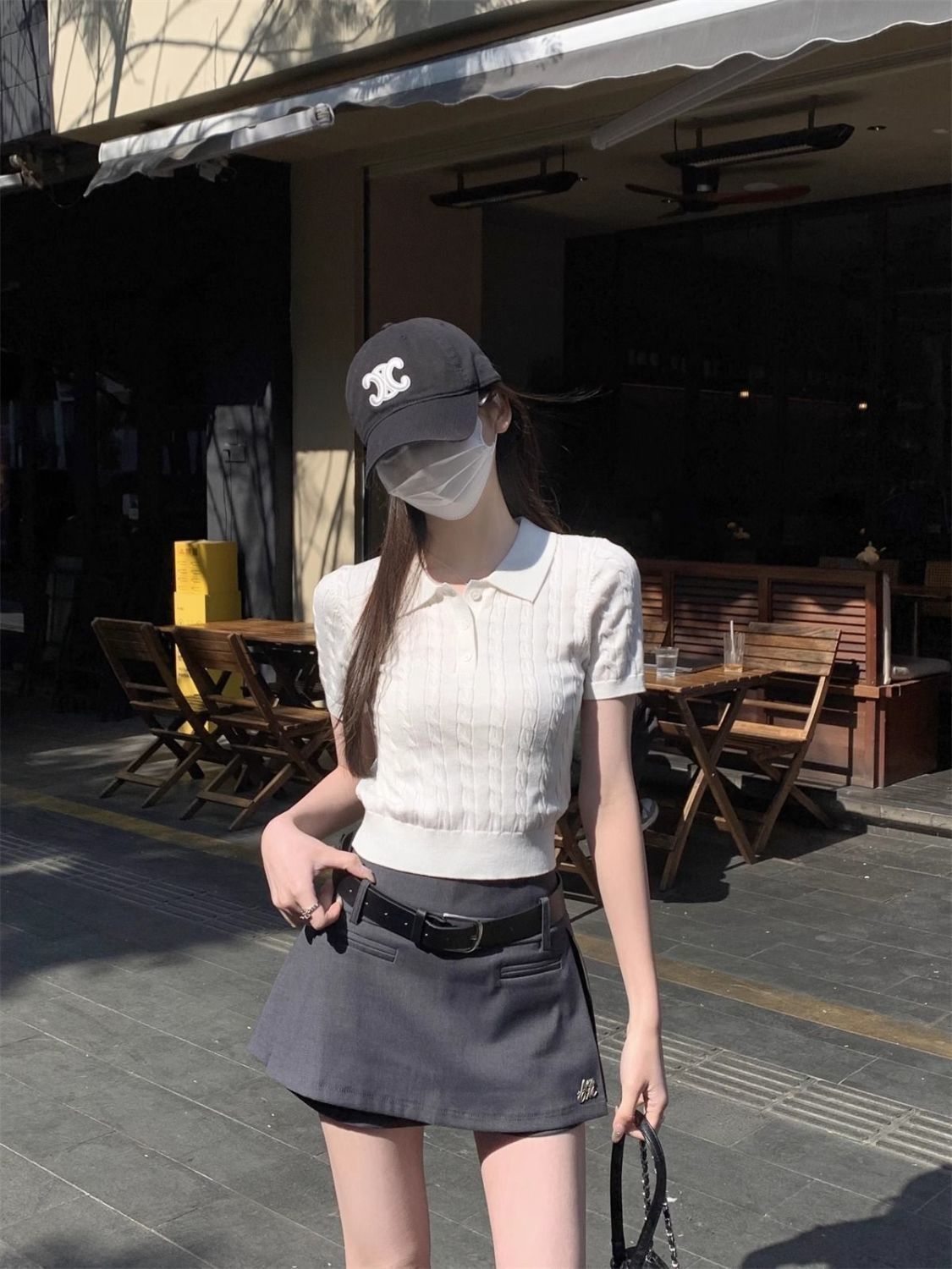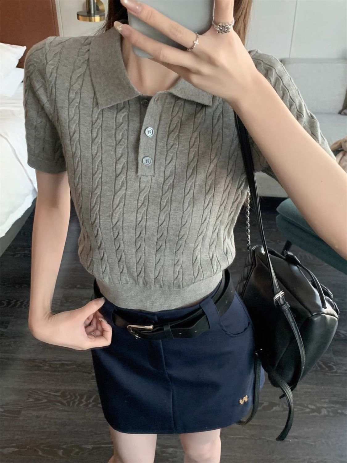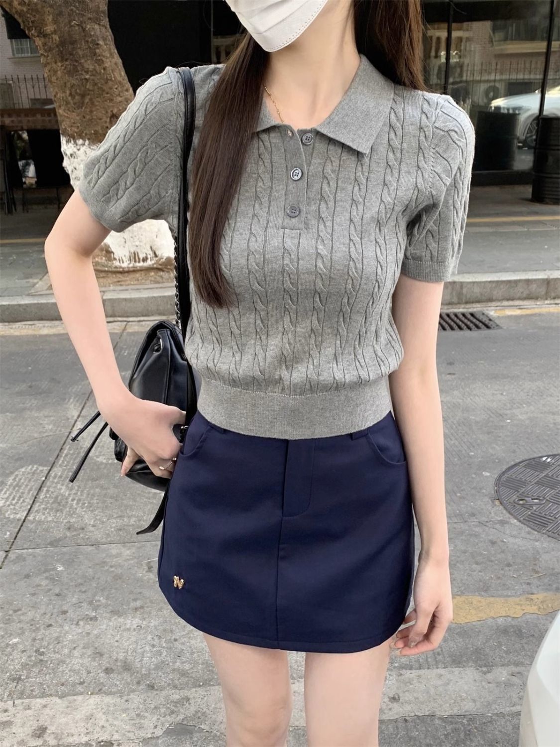 한국 트위스트 니트 스웨터 여성용 오른쪽 어깨 반팔 티셔츠 여름 얇은 틈새 슬리밍 폴로 칼라 탑 여성용스토어 가기