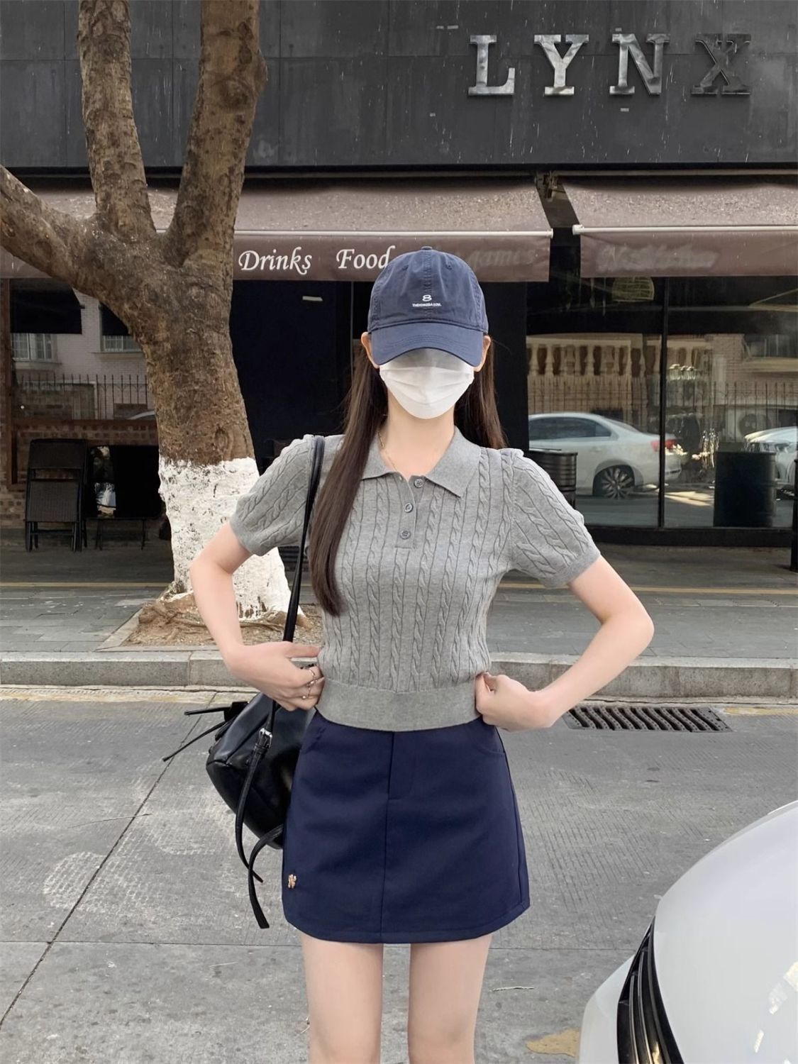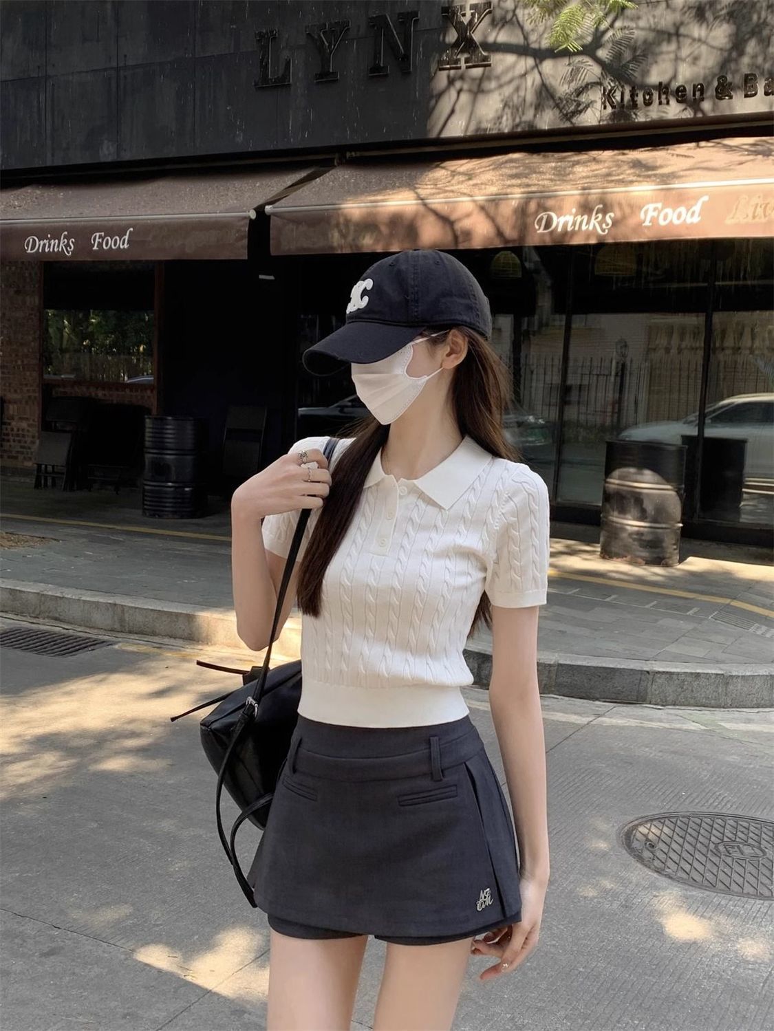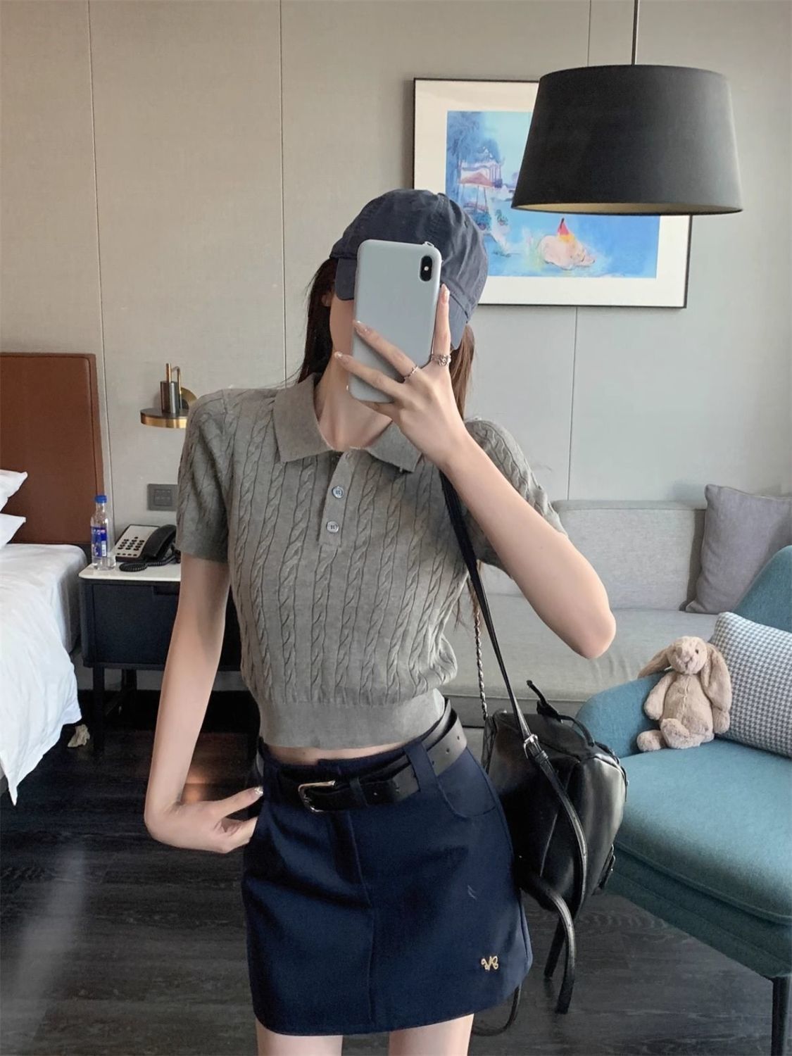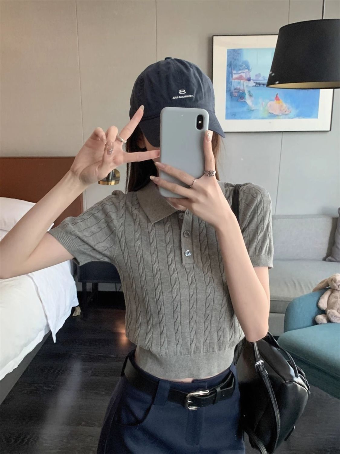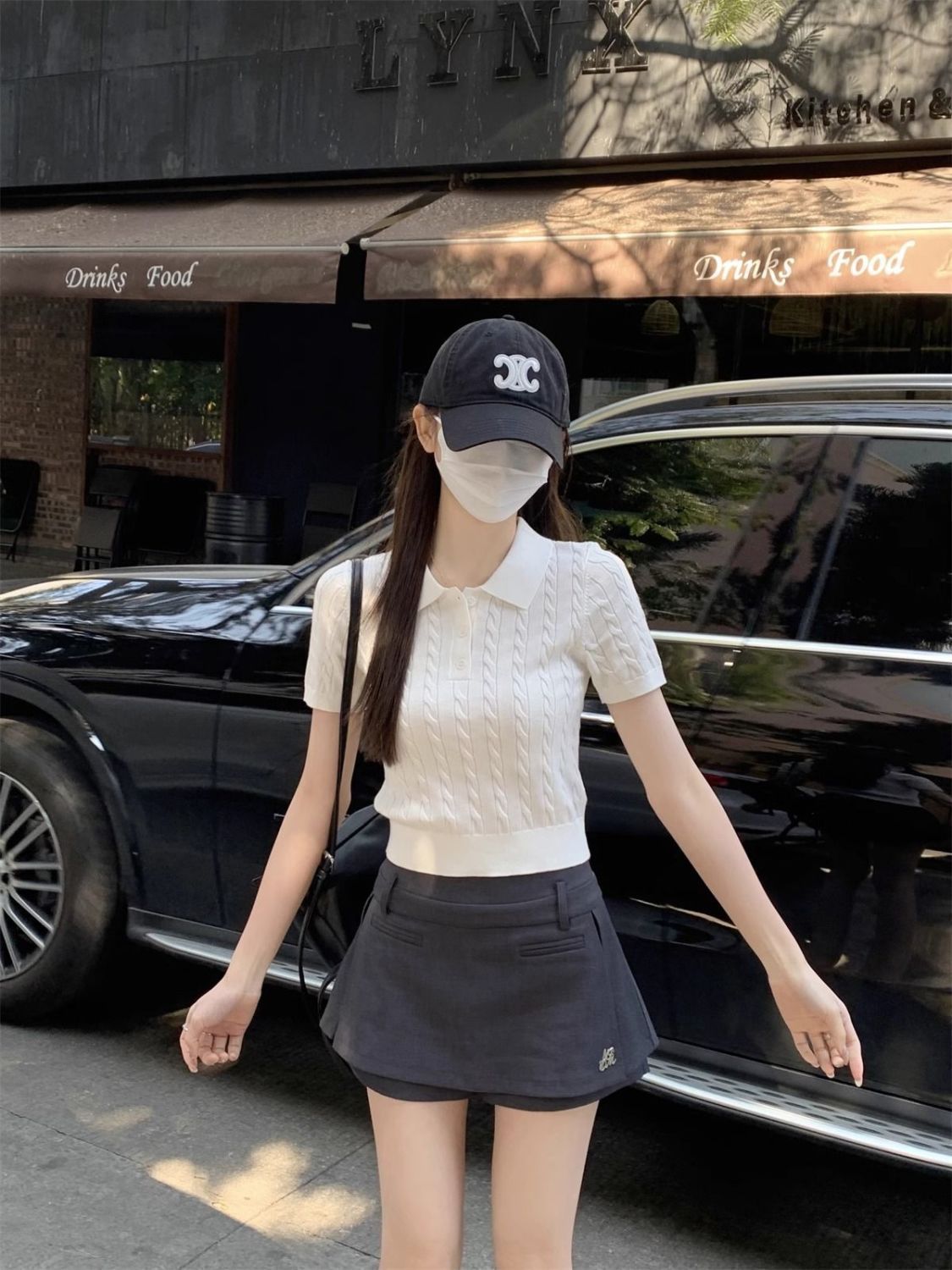 한국 트위스트 니트 스웨터 여성용 오른쪽 어깨 반팔 티셔츠 여름 얇은 틈새 슬리밍 폴로 칼라 탑 여성용스토어 가기