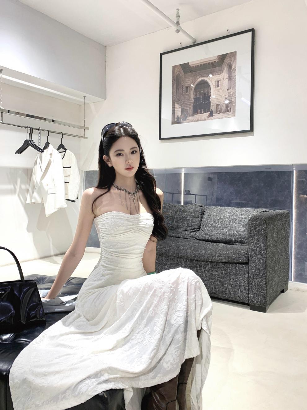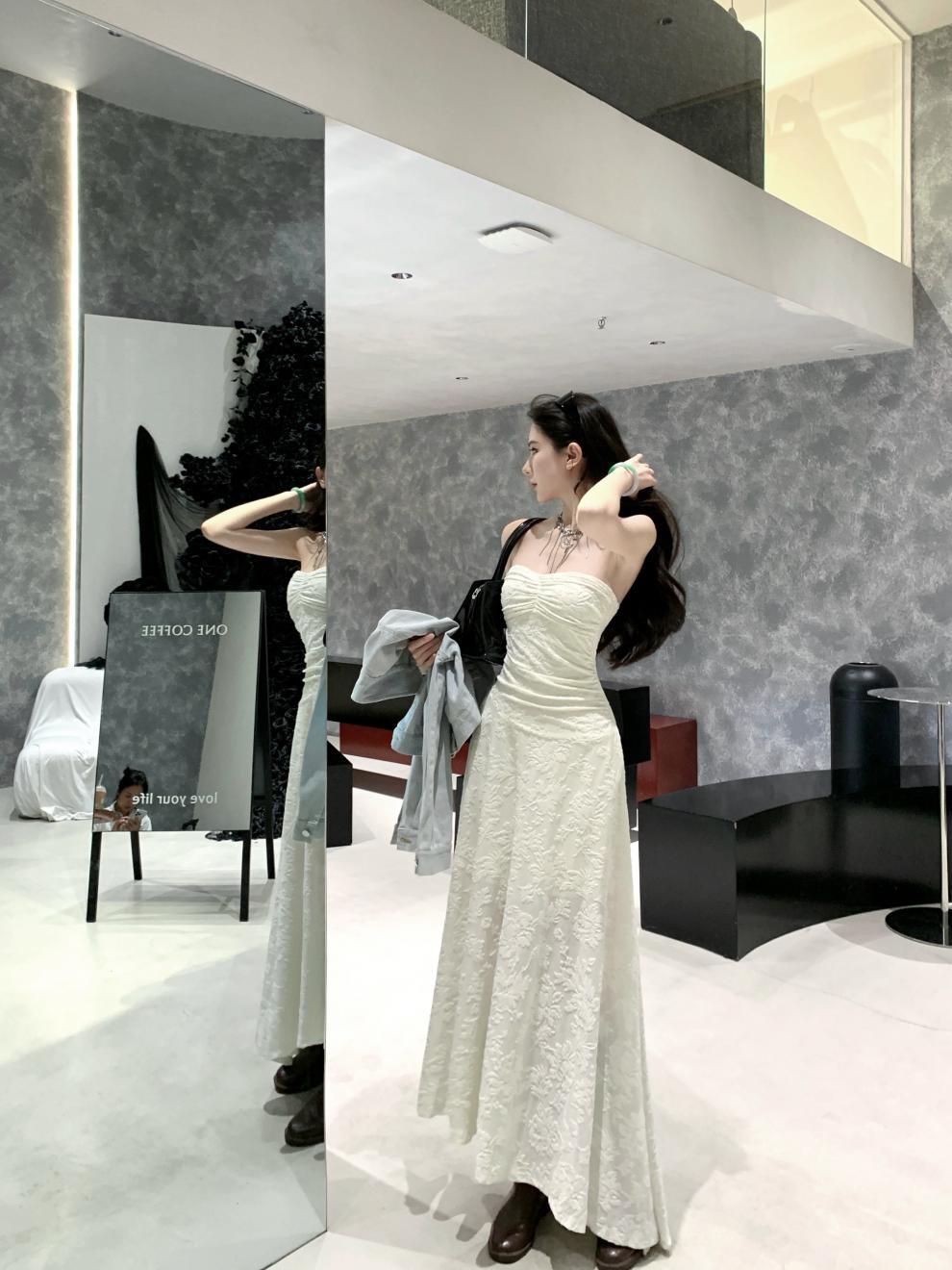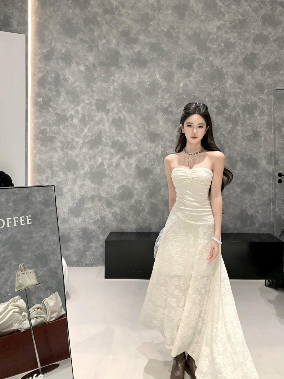 샤란시유 베이지 플리츠 고급스러운 느낌의 튜브탑 원피스, 허리를 잘록하게 잡아주는 슬리밍 효과의 여성용 봄 프렌치 패션 원피스스토어 가기