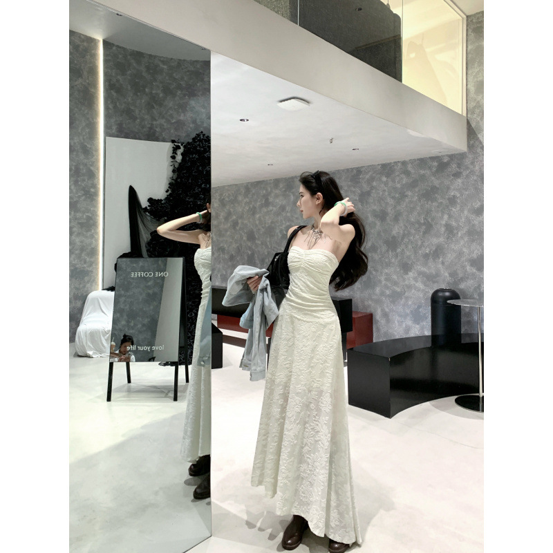 샤란시유 베이지 플리츠 고급스러운 느낌의 튜브탑 원피스, 허리를 잘록하게 잡아주는 슬리밍 효과의 여성용 봄 프렌치 패션 원피스