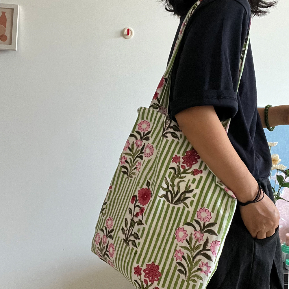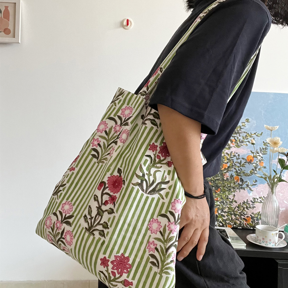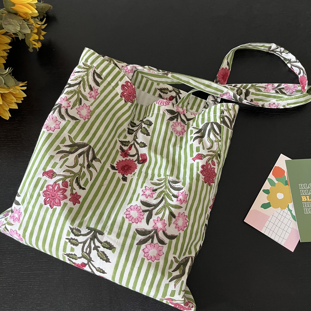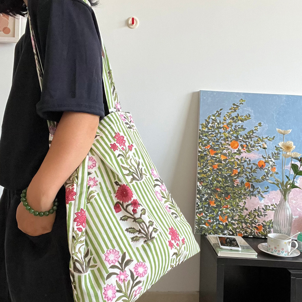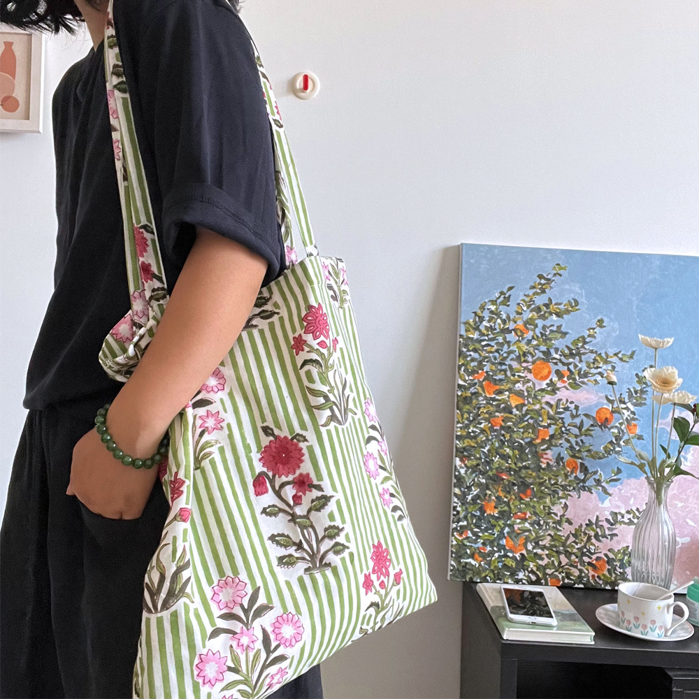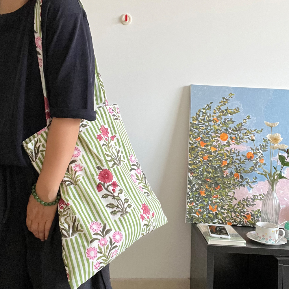 인도 전통 레플리카 염색 면 에코백, 녹색 줄무늬 꽃가방, 심플하고 활용도가 높은 얇은 스트랩 숄더백 토트백스토어 가기