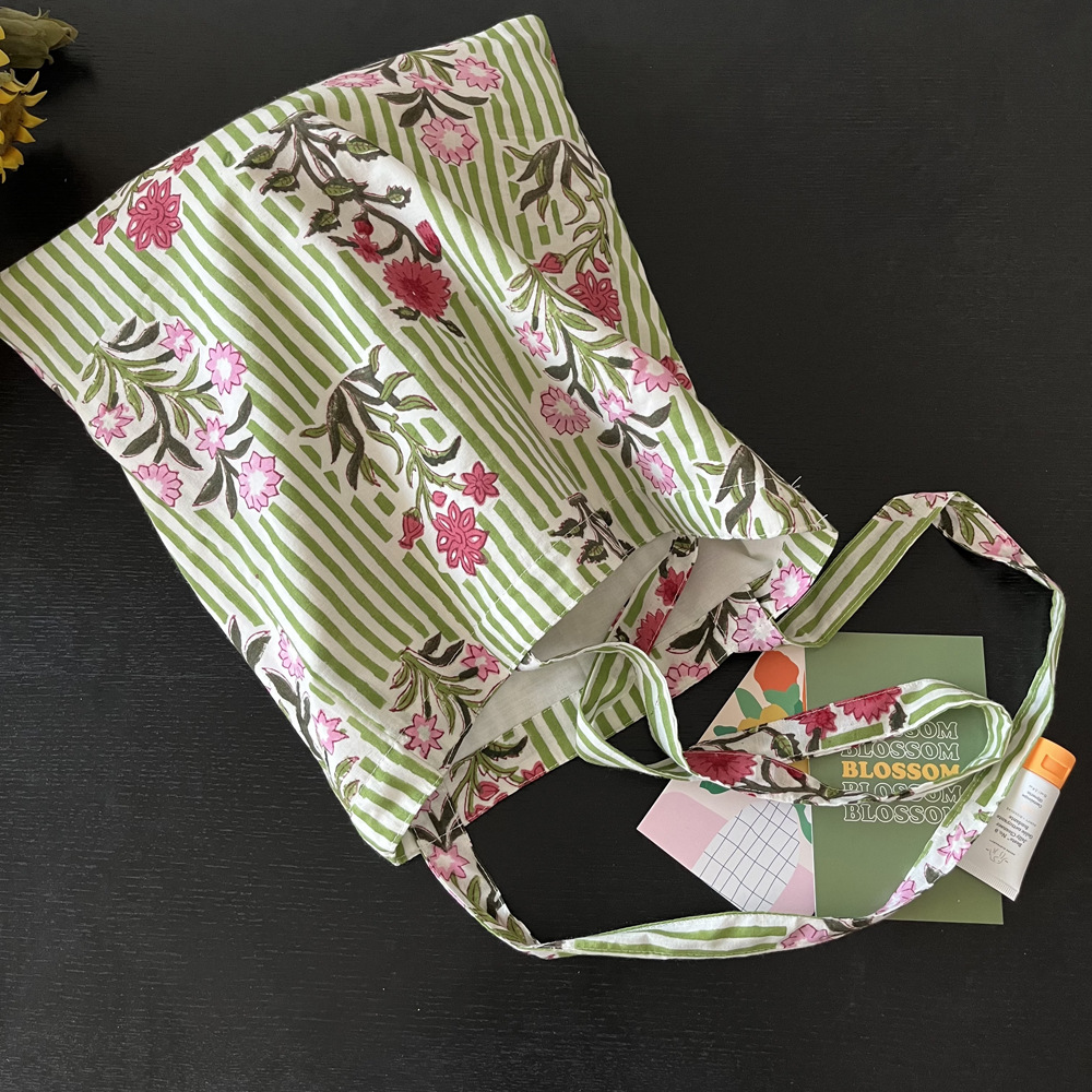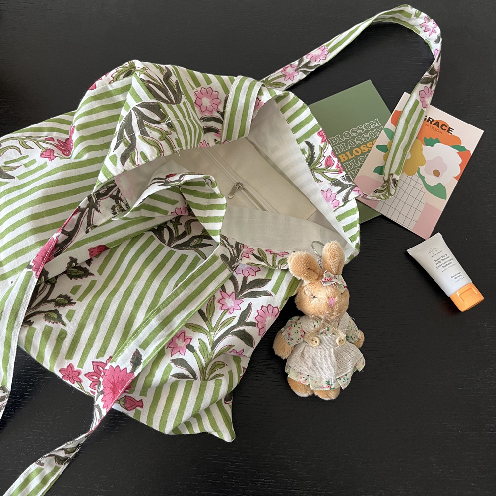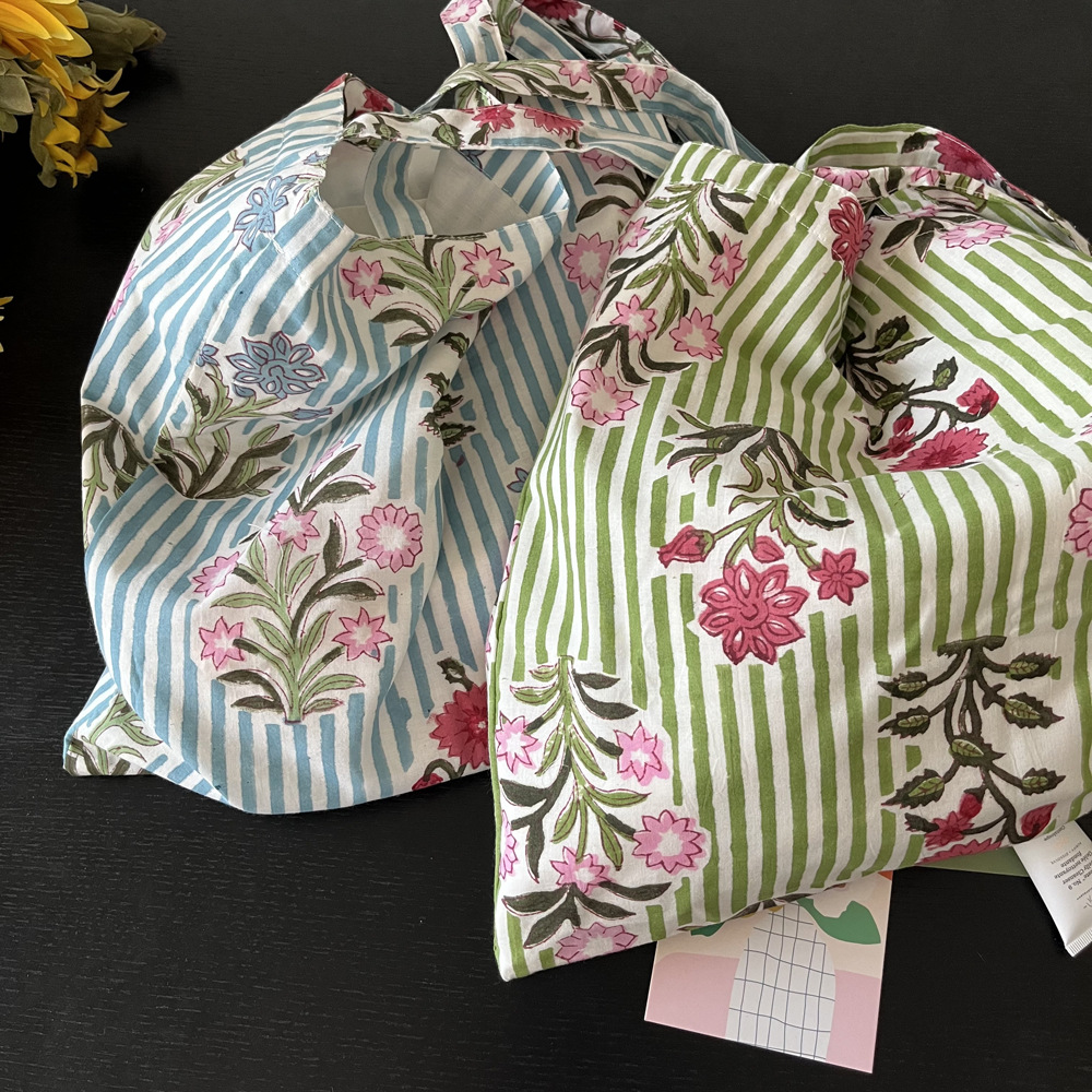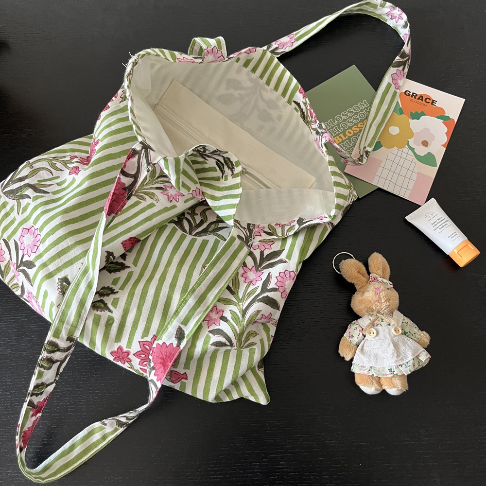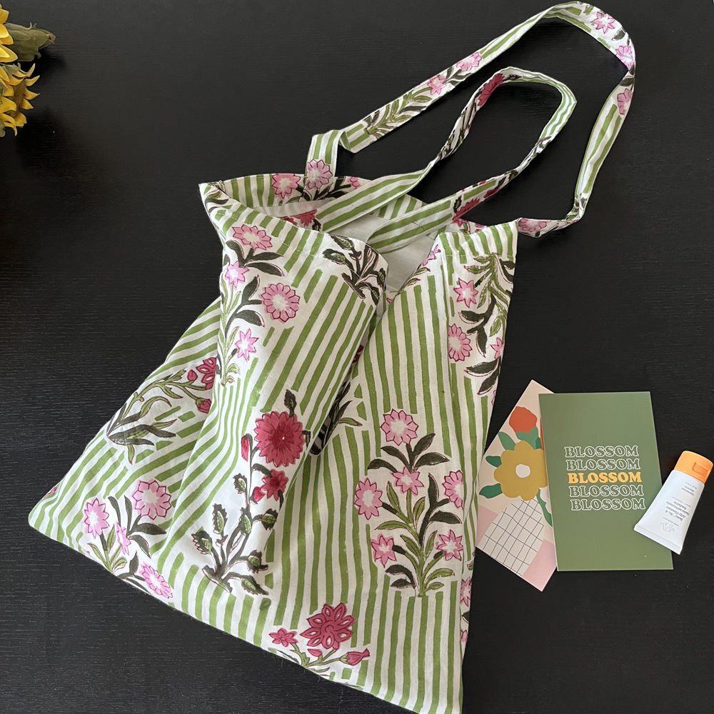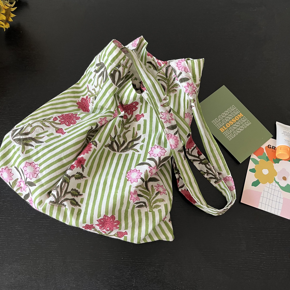 인도 전통 레플리카 염색 면 에코백, 녹색 줄무늬 꽃가방, 심플하고 활용도가 높은 얇은 스트랩 숄더백 토트백스토어 가기