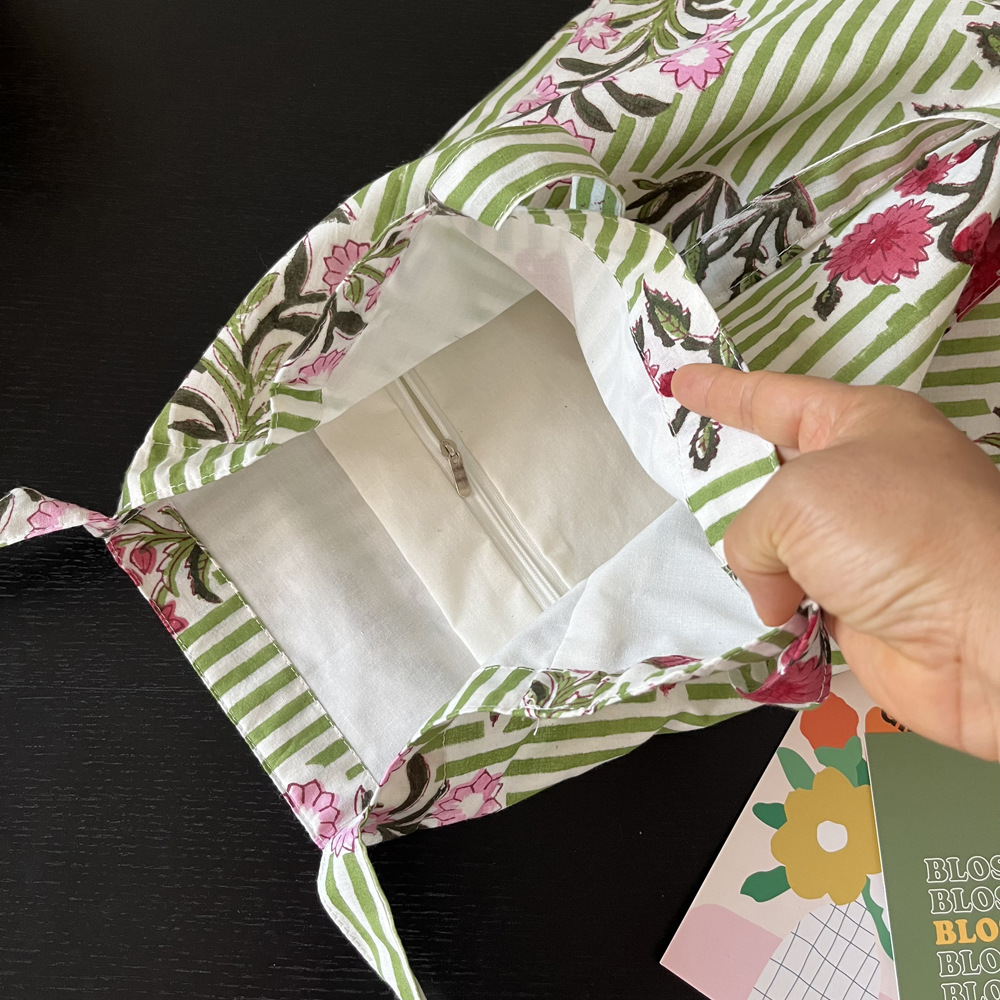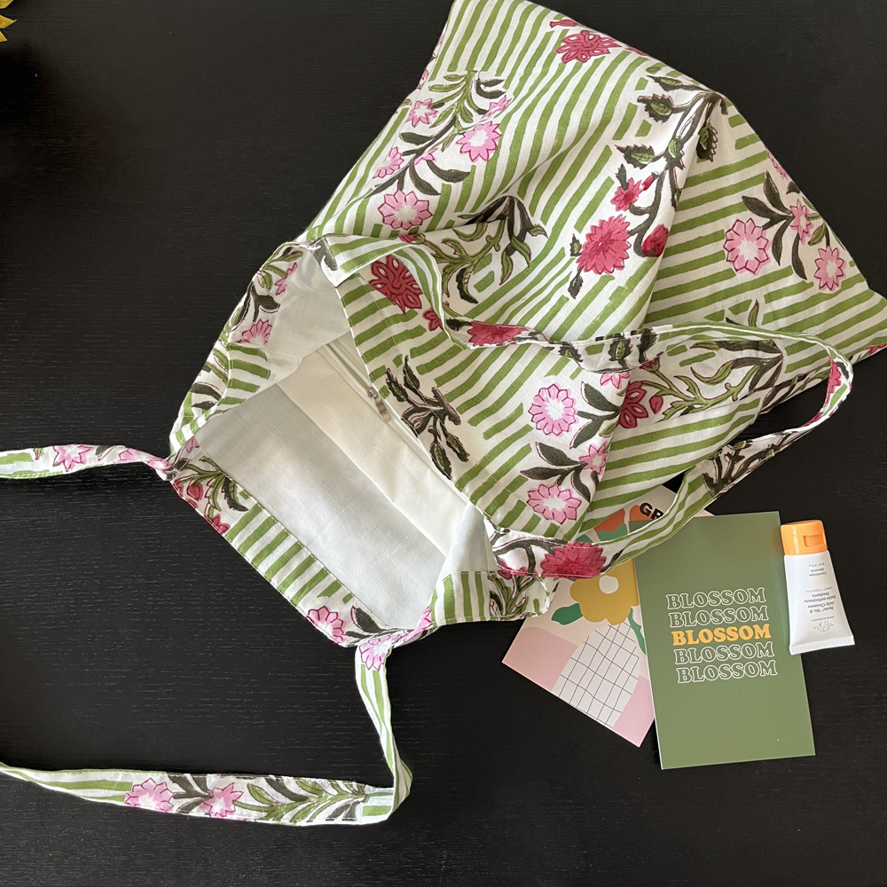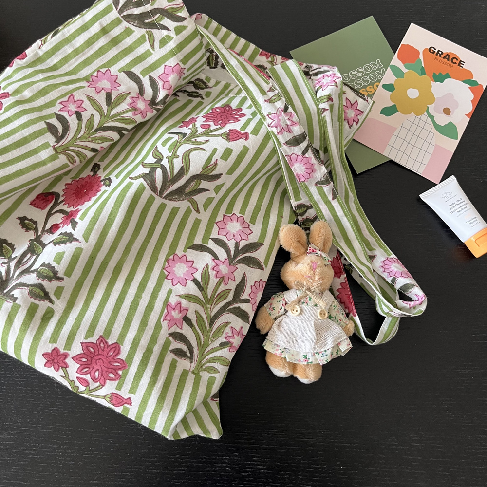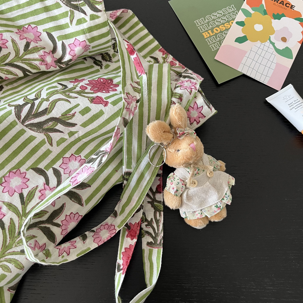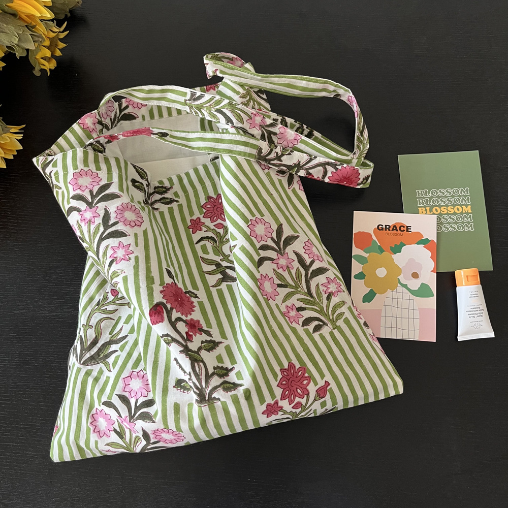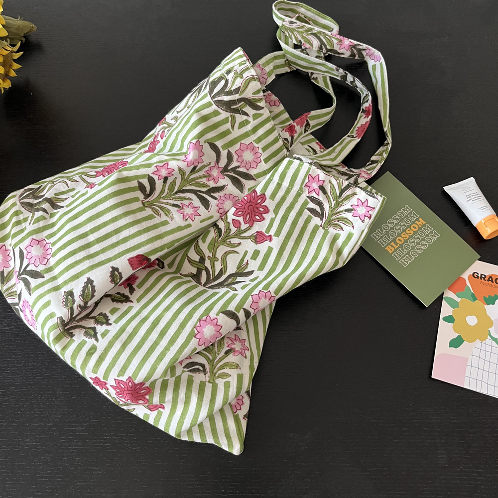 인도 전통 레플리카 염색 면 에코백, 녹색 줄무늬 꽃가방, 심플하고 활용도가 높은 얇은 스트랩 숄더백 토트백스토어 가기