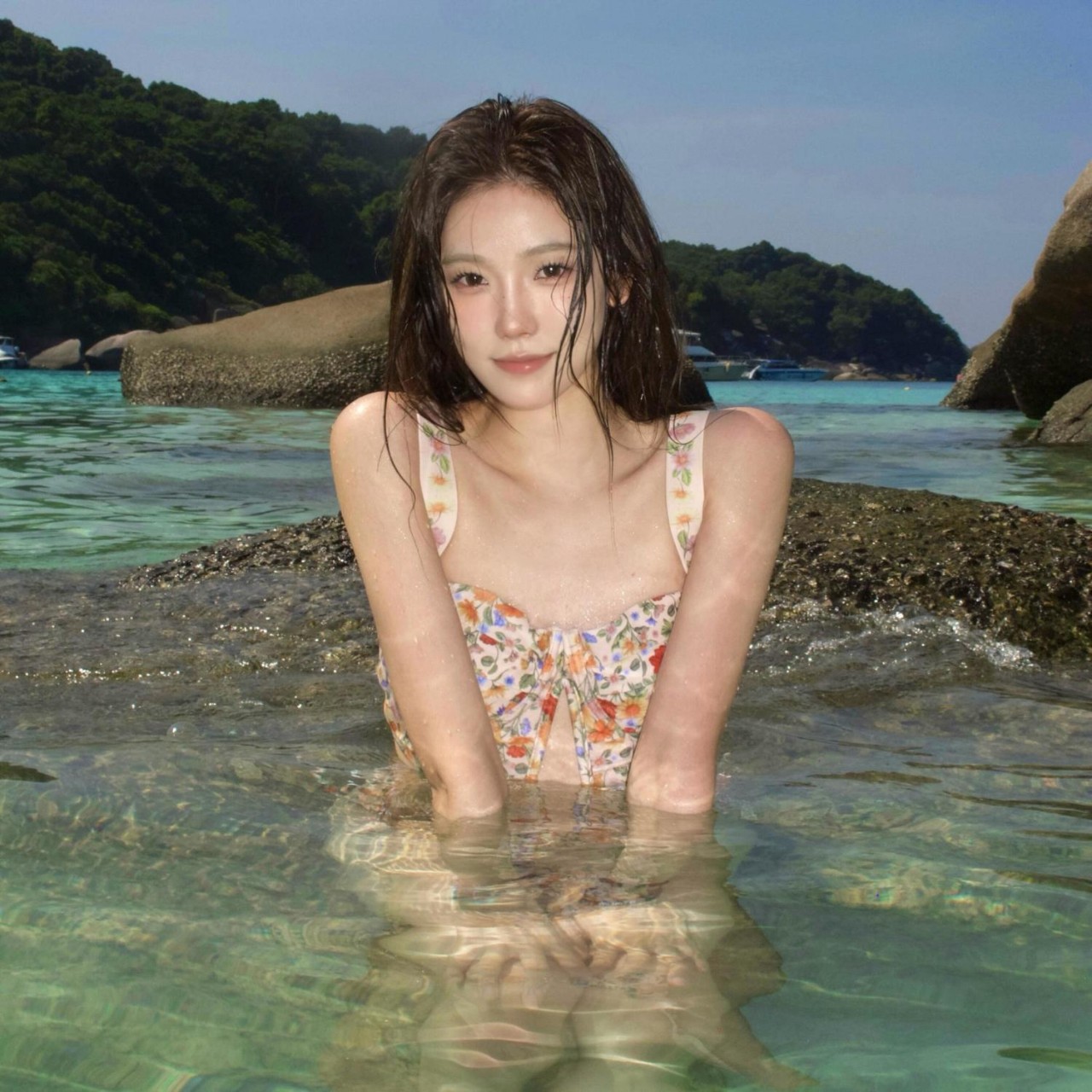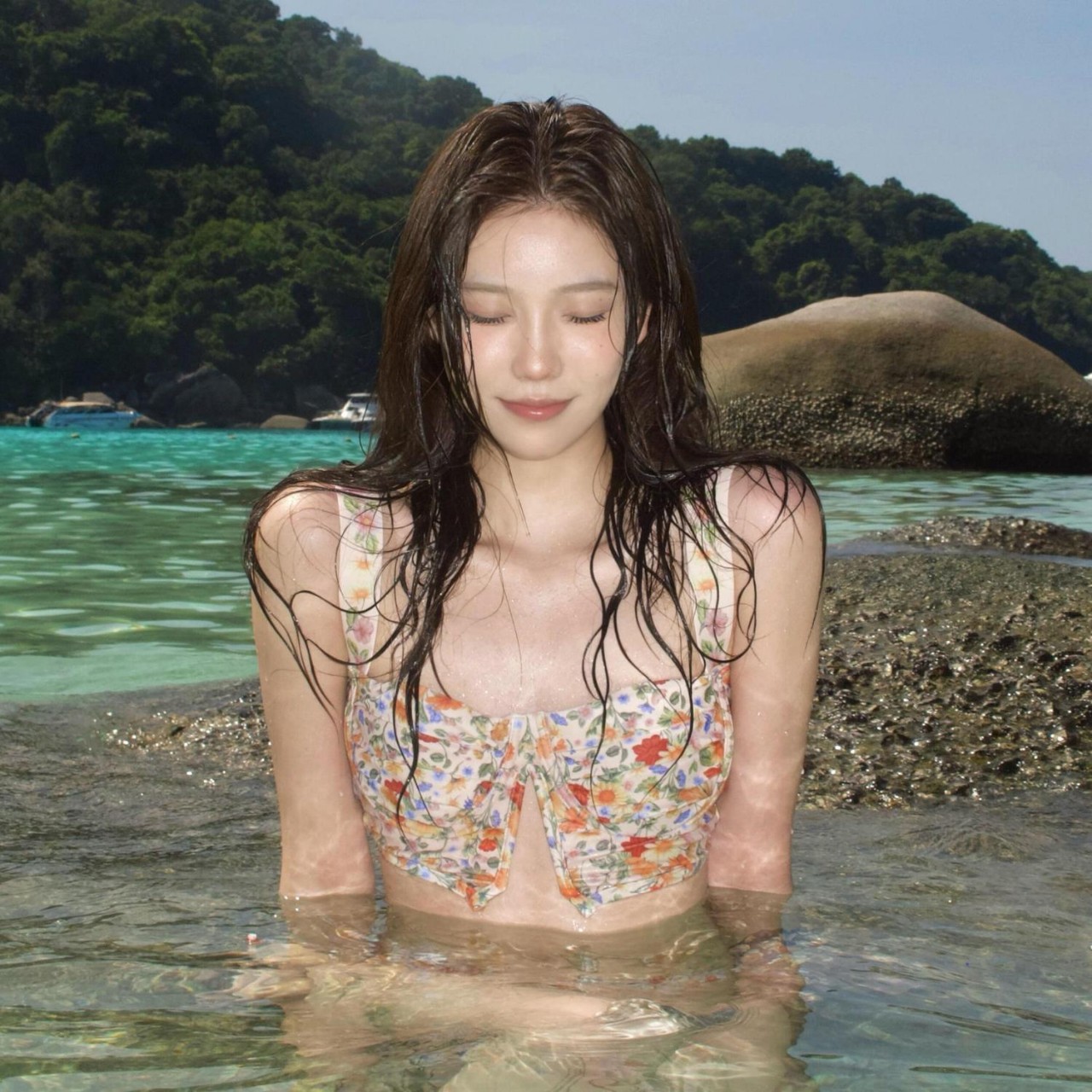 소스 제조업체 신선한 꽃무늬 스플릿 작은 가슴 푸시업 순수한 욕망 휴가 비키니 여성용 3피스 수영복 해변 온천