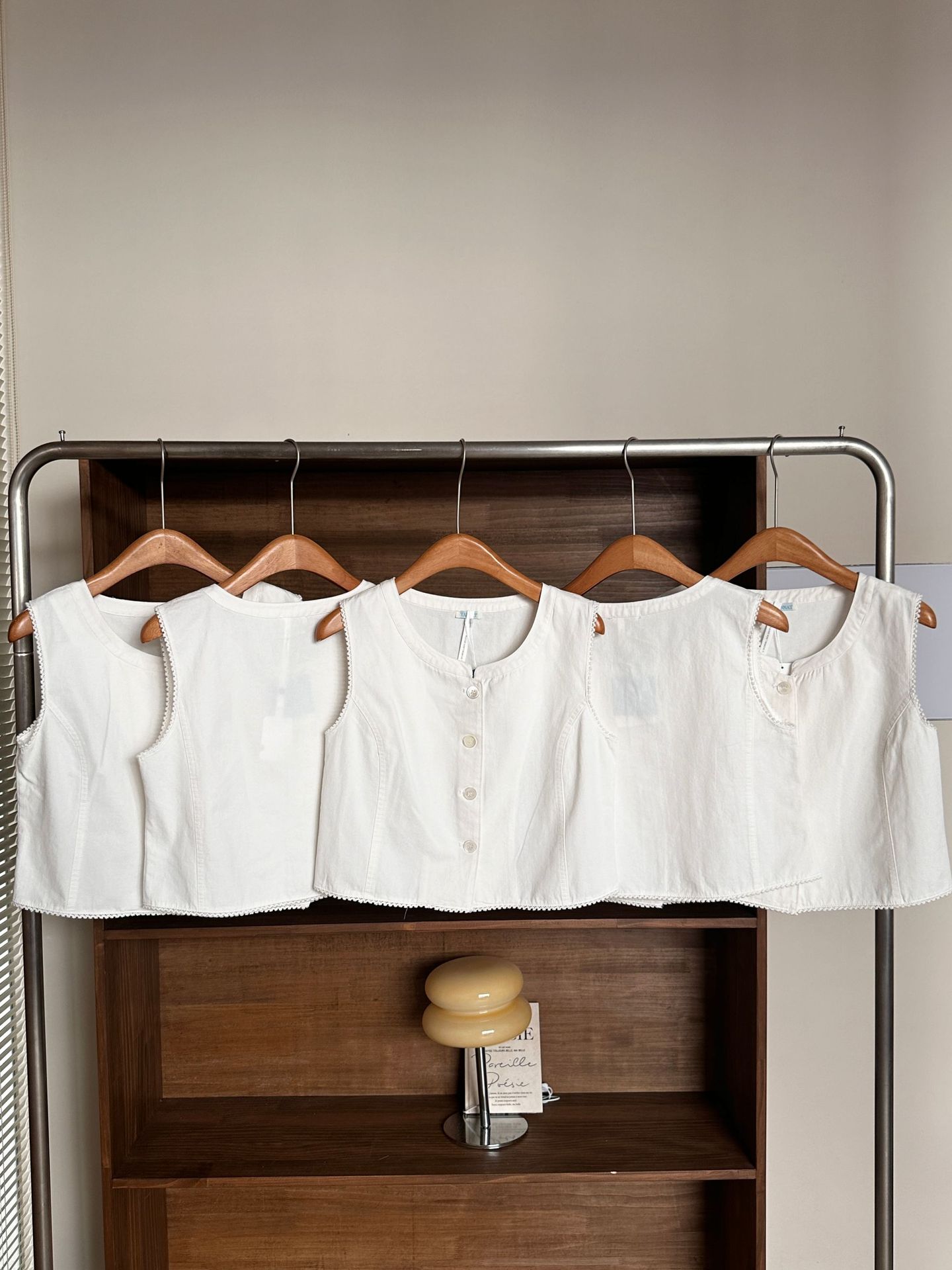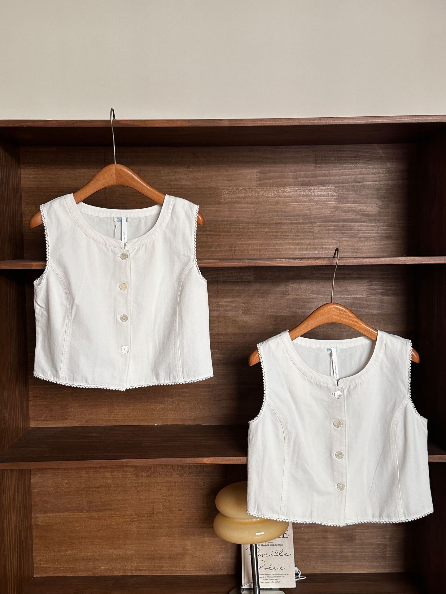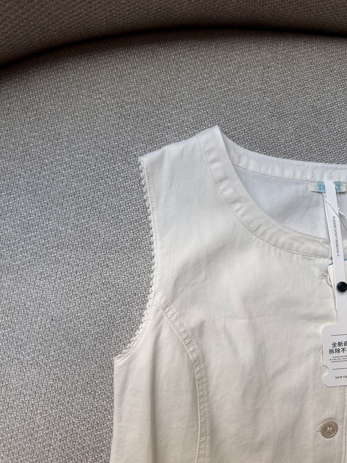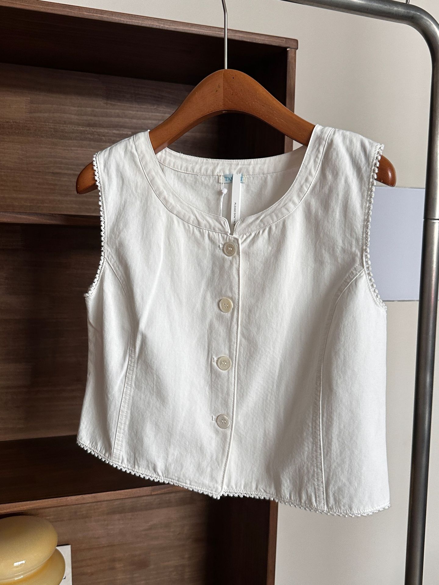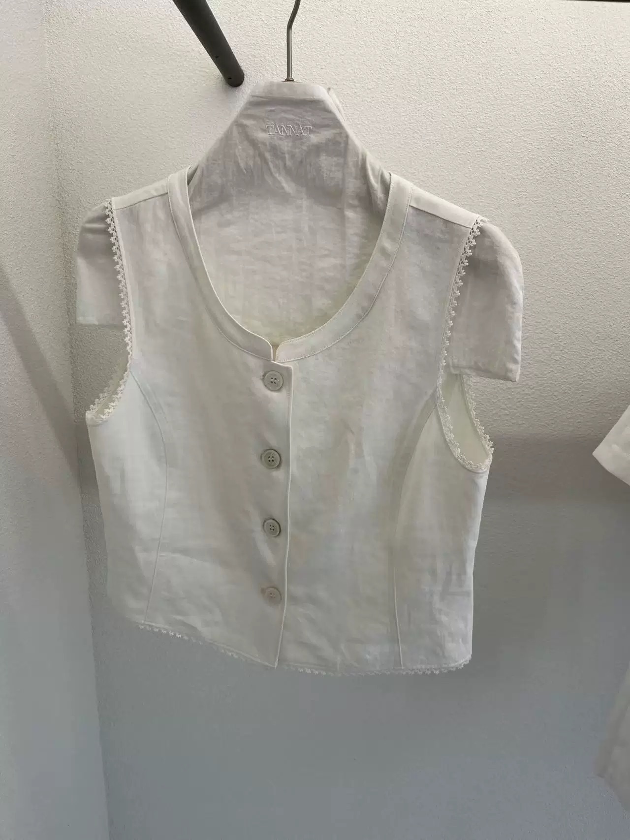 여성용 Now H 린넨 더블 브레스트 조끼 2025 여름 미니멀리스트 한국 스타일 하이 엔드 반팔 탑 Tan*t