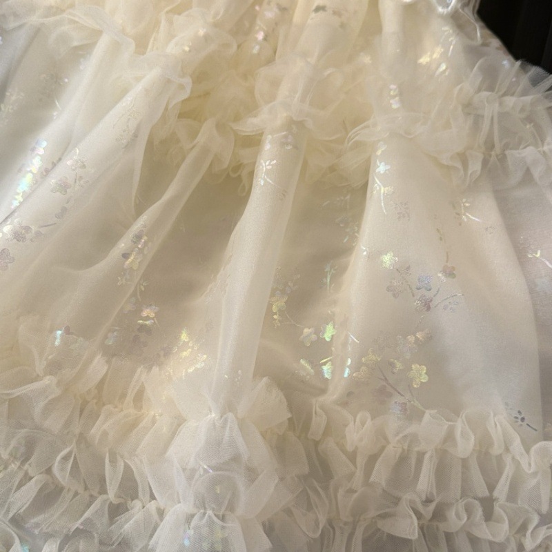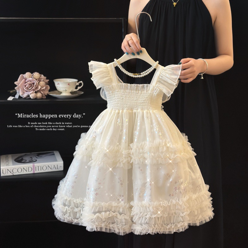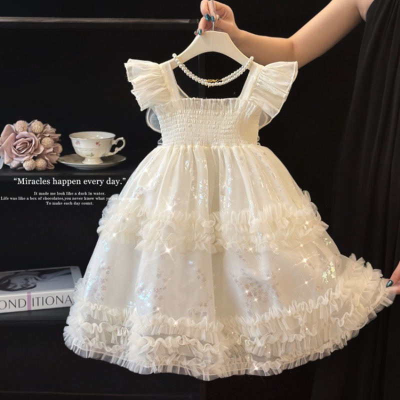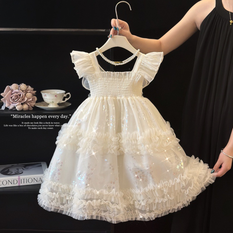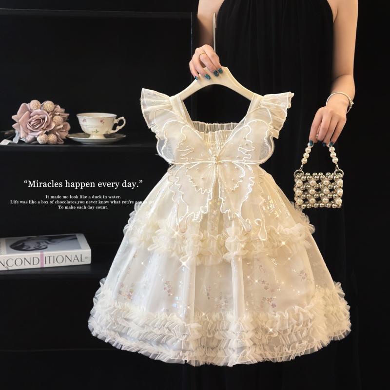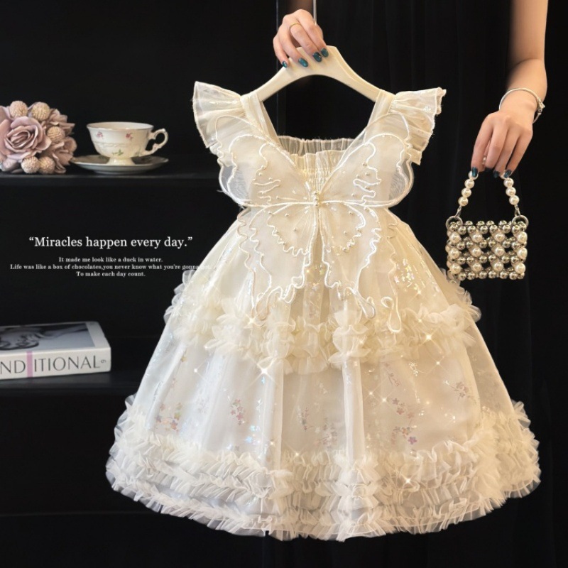여자 공주 드레스 여름 2025 새로운 스타일 아름다운 서양식 여자 흰 드레스 어린이 나비 날개 드레스