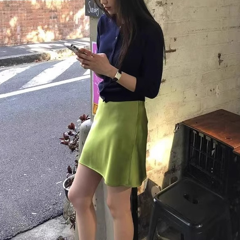 여성을위한 과일 녹색 새틴 광택 아세테이트 짧은 치마 여름 새로운 하이 웨이스트 바이어스 컷 a 라인 스커트 미니 피쉬 테일 스커트스토어 가기