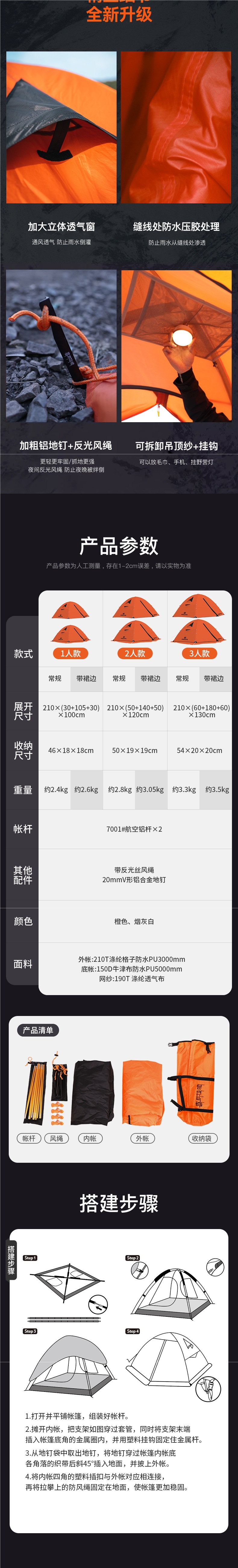 야외 캠핑용 여행 텐트, 겨울철 따뜻하고 두꺼운 야외 사계절 캠핑 장비, 1인용 완전 세트, 확장 오렌지