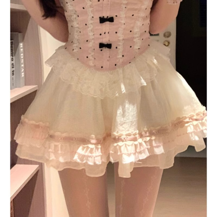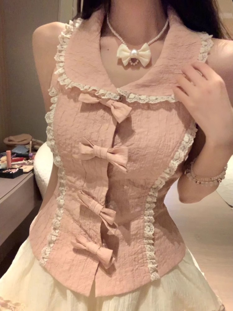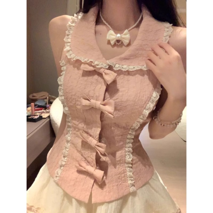 Bowknot 레이스 핑크 인형 칼라 조끼 탑 스위트 슈트 여성 여름 퍼프 스커트 투피스 세트