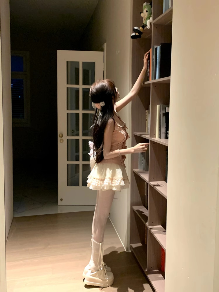 Bowknot 레이스 핑크 인형 칼라 조끼 탑 스위트 슈트 여성 여름 퍼프 스커트 투피스 세트스토어 가기