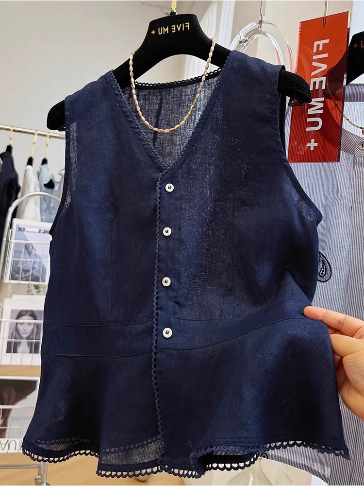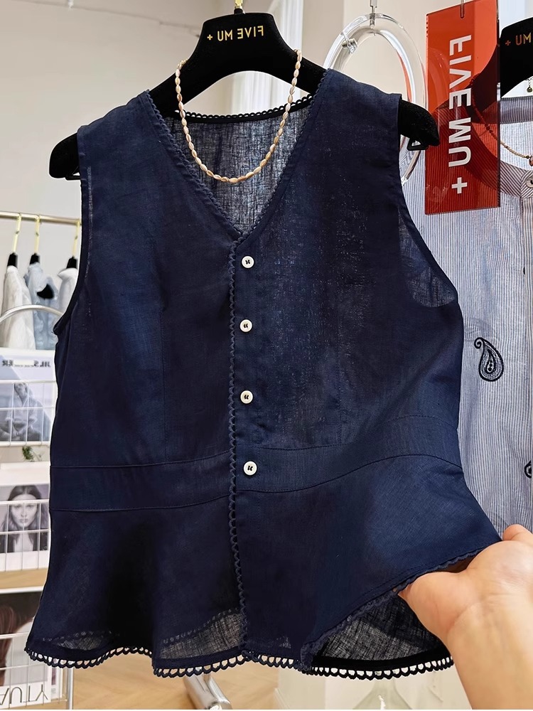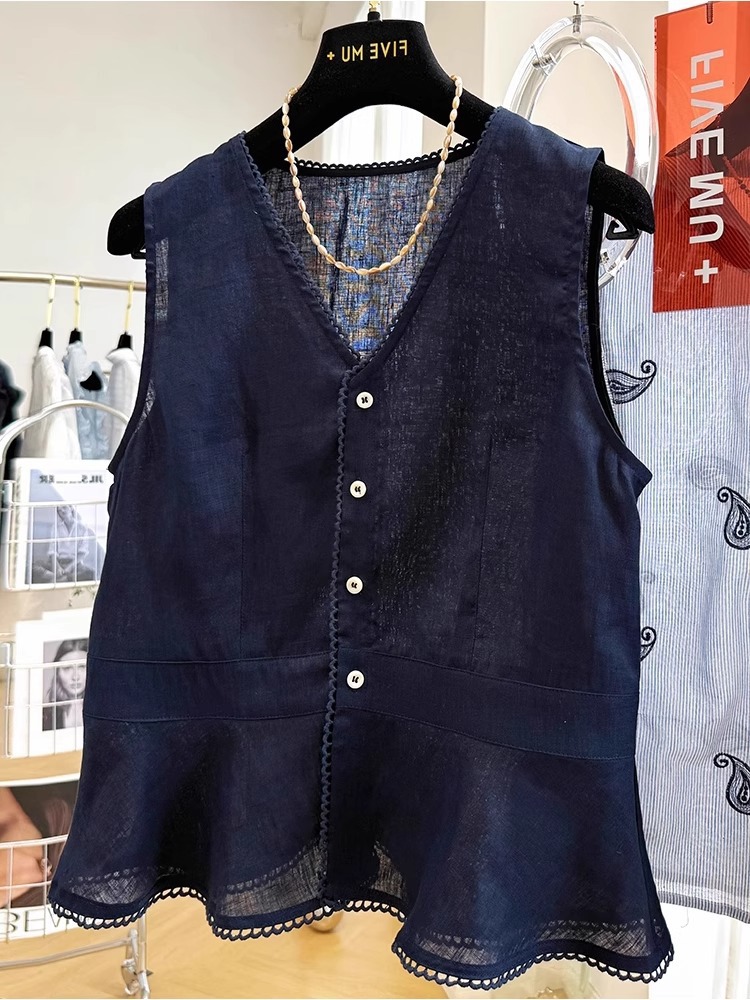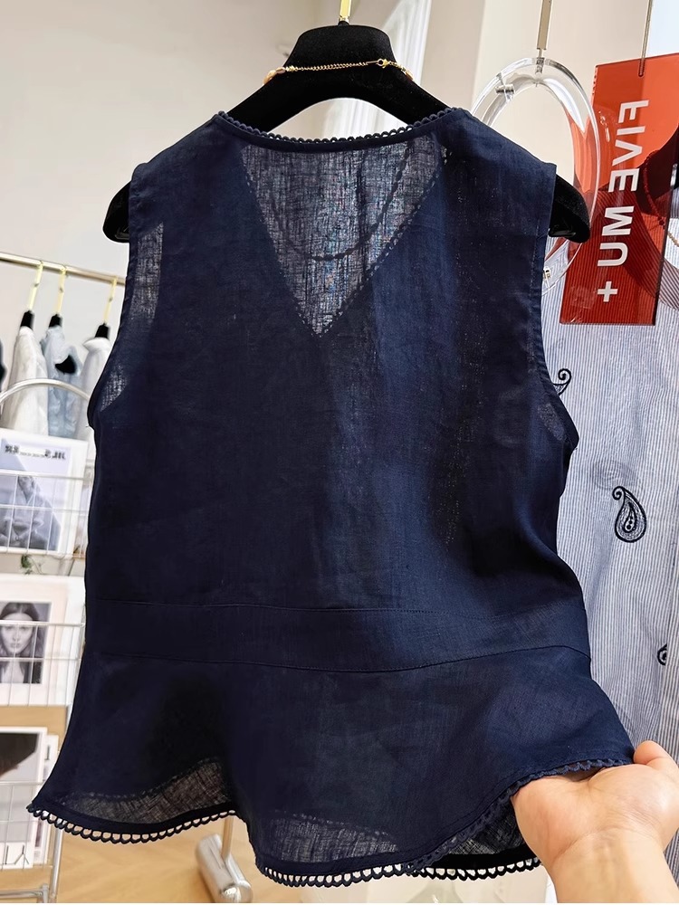 여성을위한 하이 엔드 네이비 블루 v 넥 민소매 프릴 스커트 탑 2025 여름 아우터 조끼 탑스토어 가기