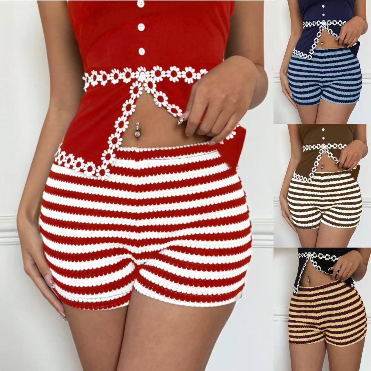 2025 유럽 및 미국 여성 의류 바지 아마존 크로스보더 봄 여름 신상 패션 스트라이프 핫걸 로우 웨이스트 고탄력 여성 반바지