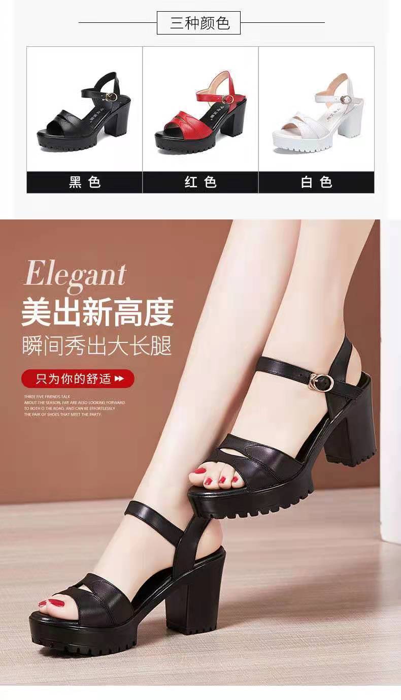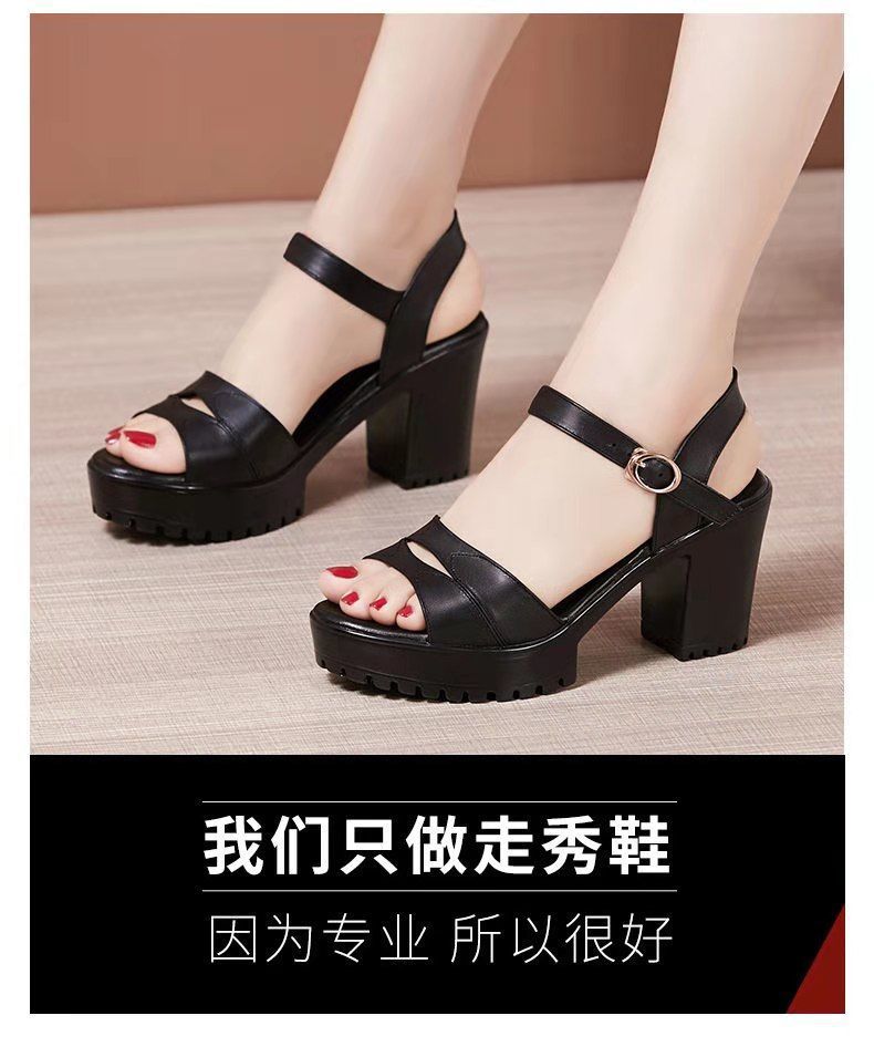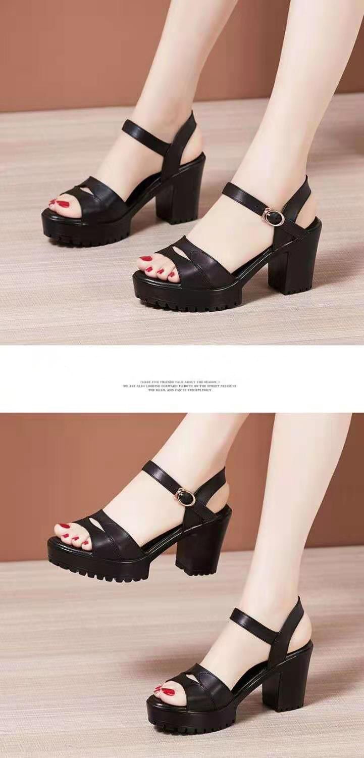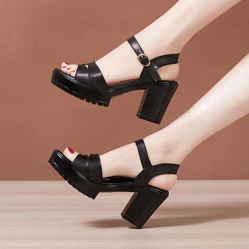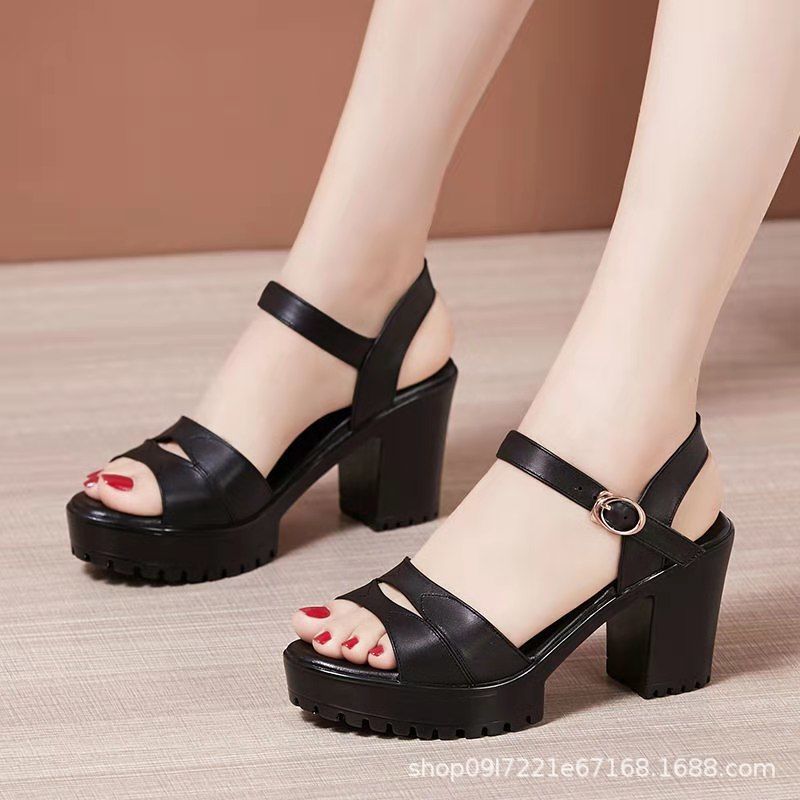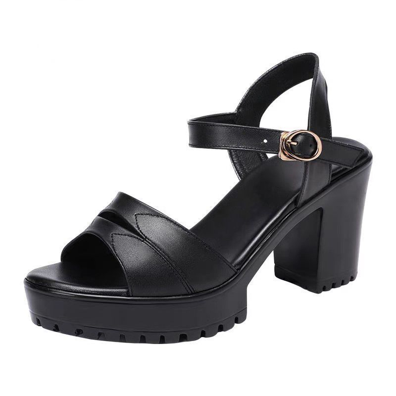 여성을위한 부드러운 가죽 하이힐 샌들 2025 여름 새로운 스타일 중간 굽 두꺼운 굽 버클 스트랩 어머니 신발 유행 여성 신발스토어 가기