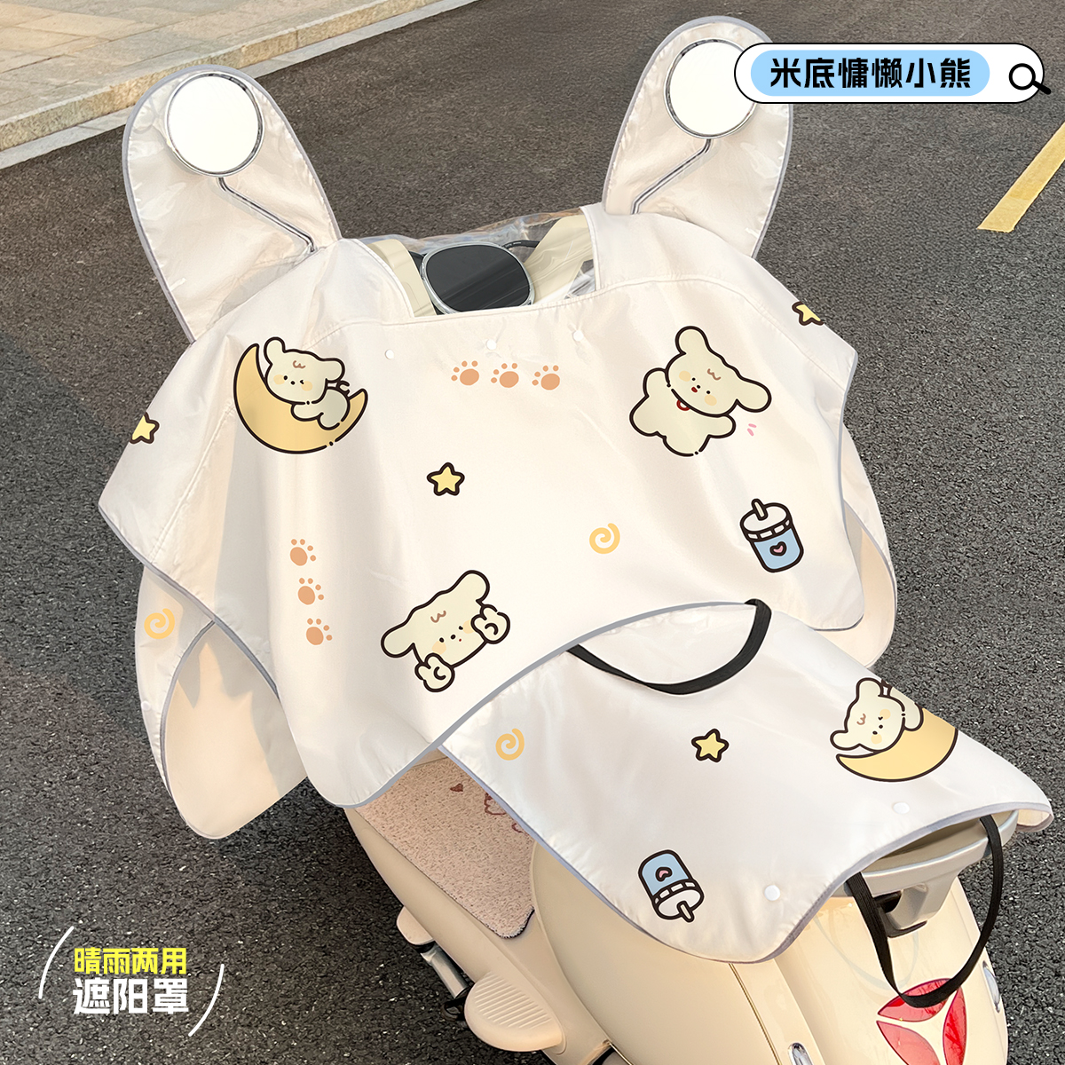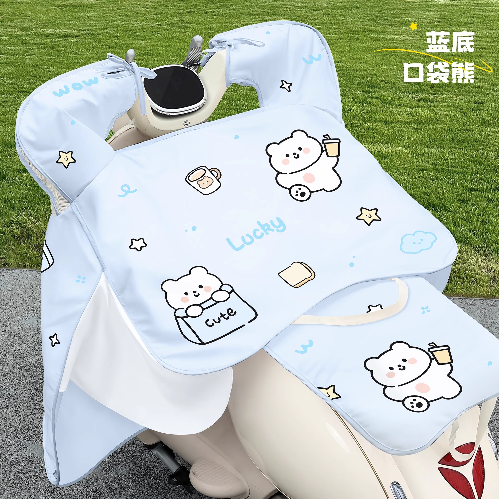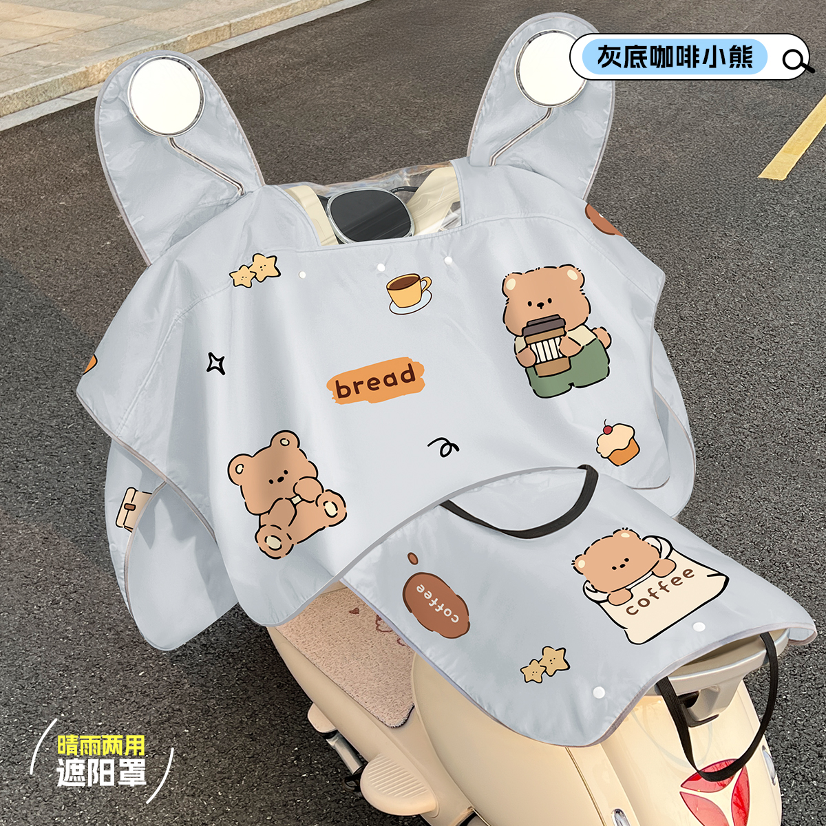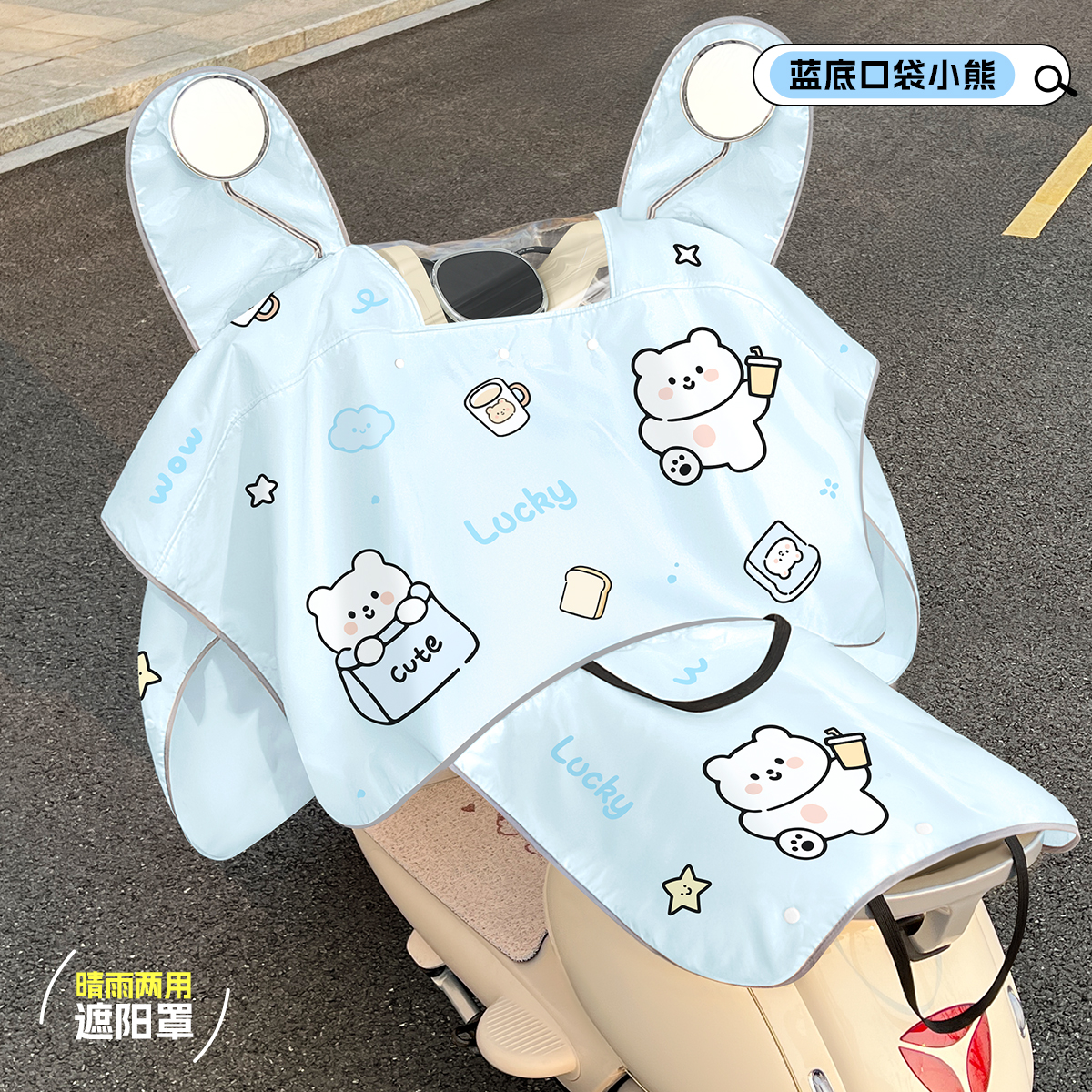 • [태양, 비 보호 2-in-1 + 거울 + 뒷좌석 커버] 파란색 배경 밀크티 베어
