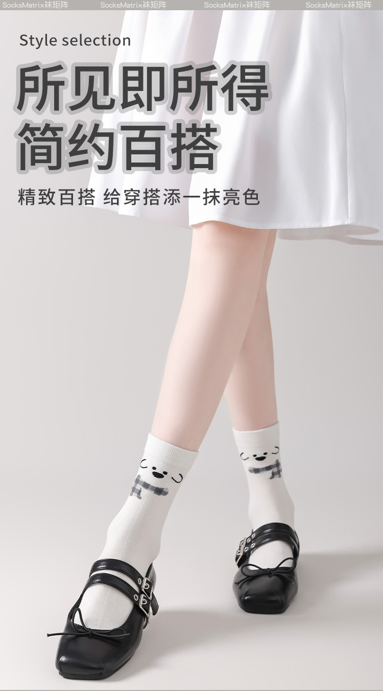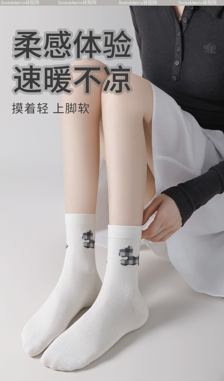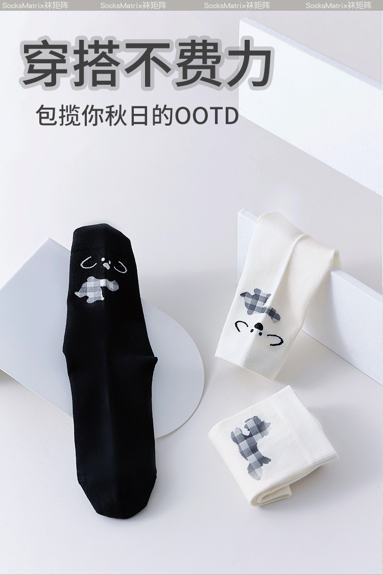 [체크무늬 강아지] 3켤레 세트 봄/가을 여성용 중목 양말, 만화 캐릭터 무봉제 면 양말, 통기성 좋은 얇은 중목 양말스토어 가기