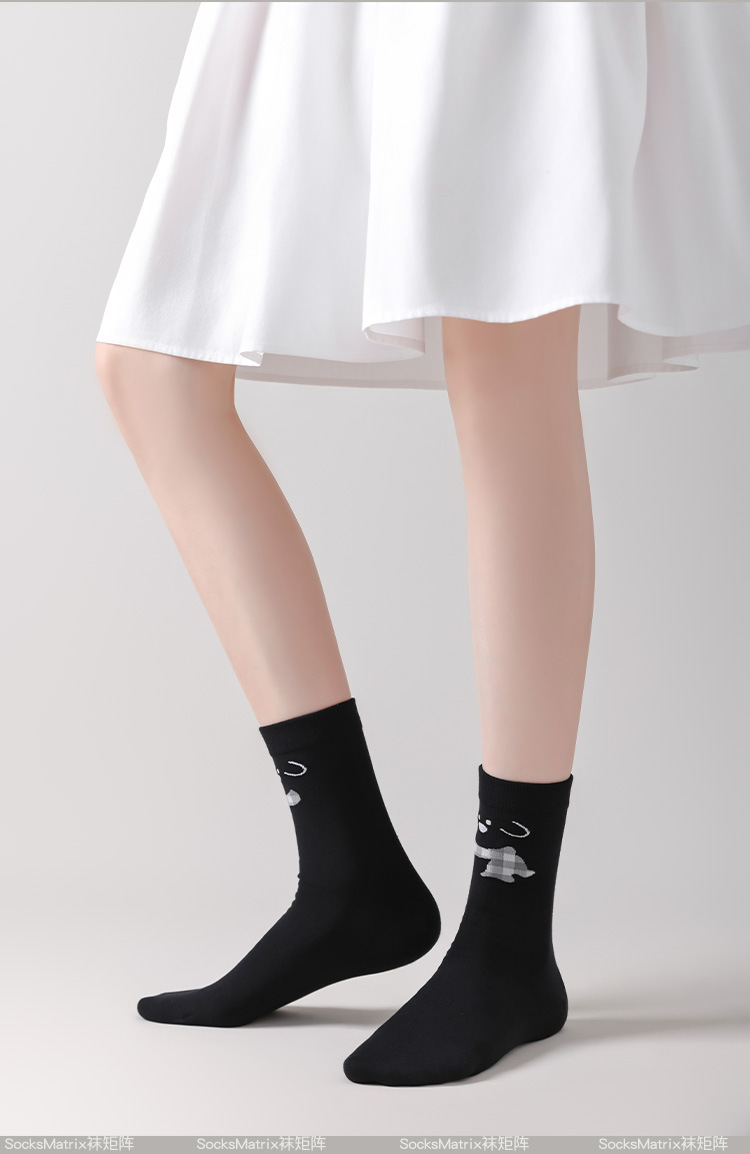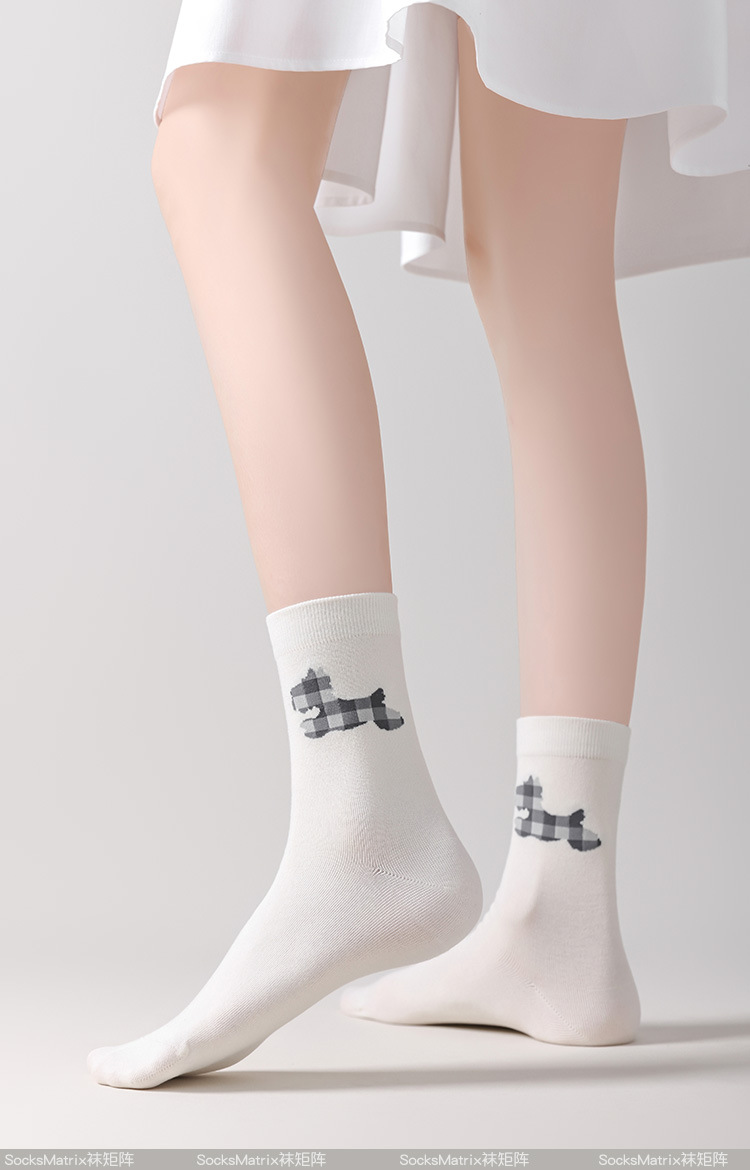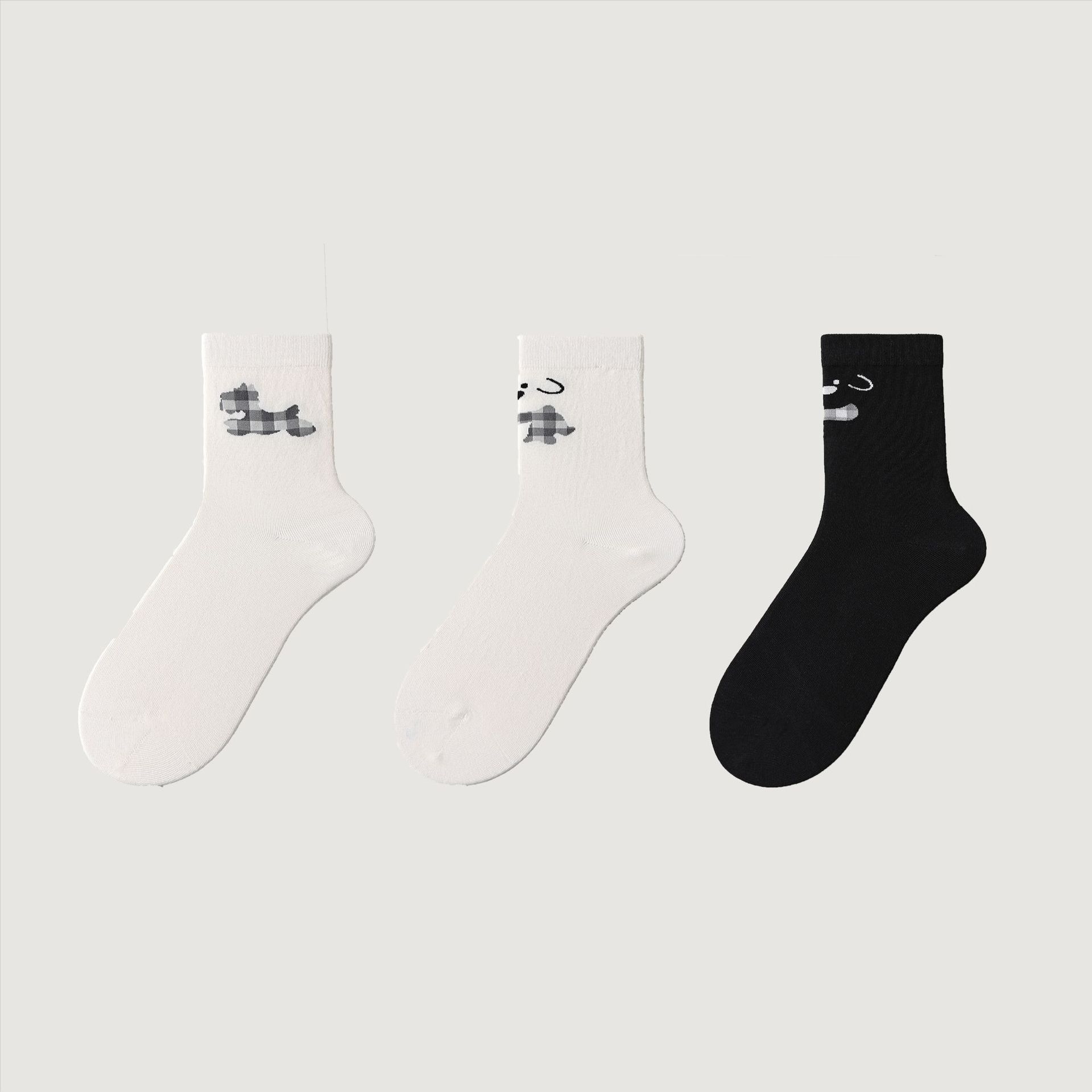 [체크무늬 강아지] 3켤레 세트 봄/가을 여성용 중목 양말, 만화 캐릭터 무봉제 면 양말, 통기성 좋은 얇은 중목 양말