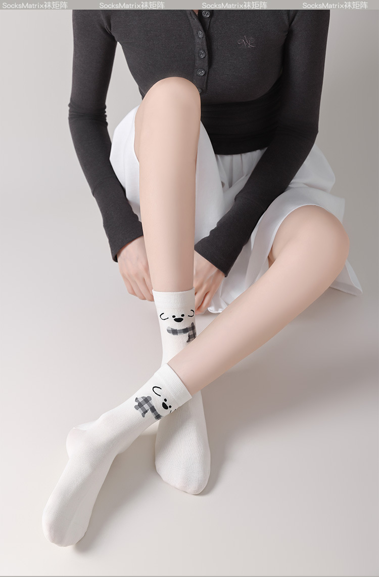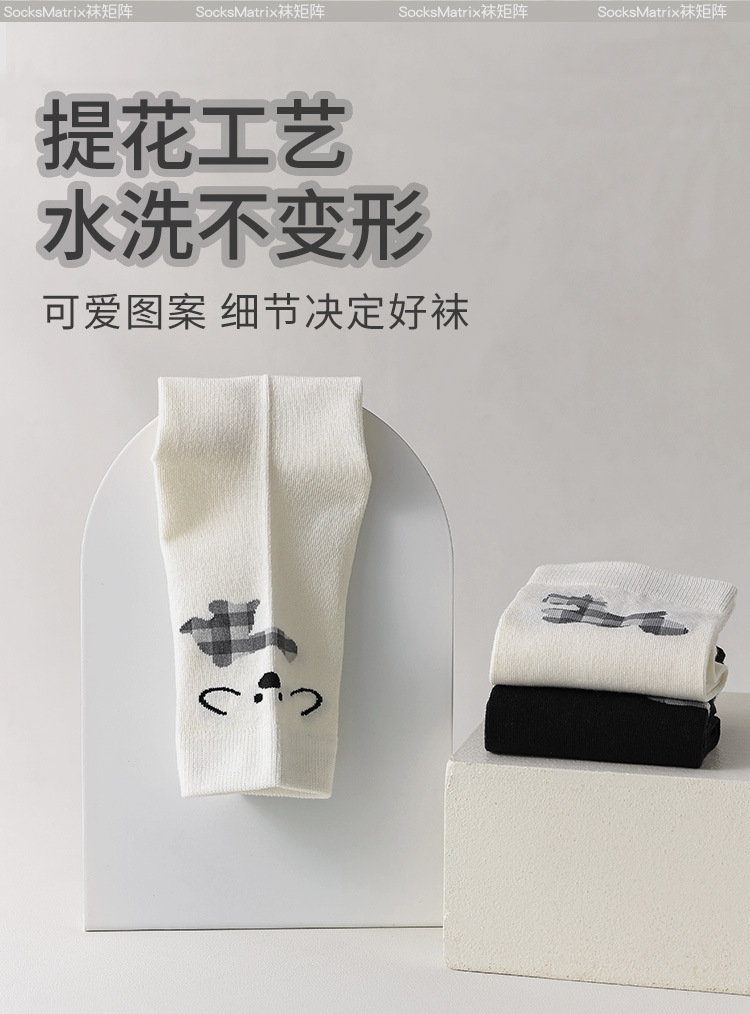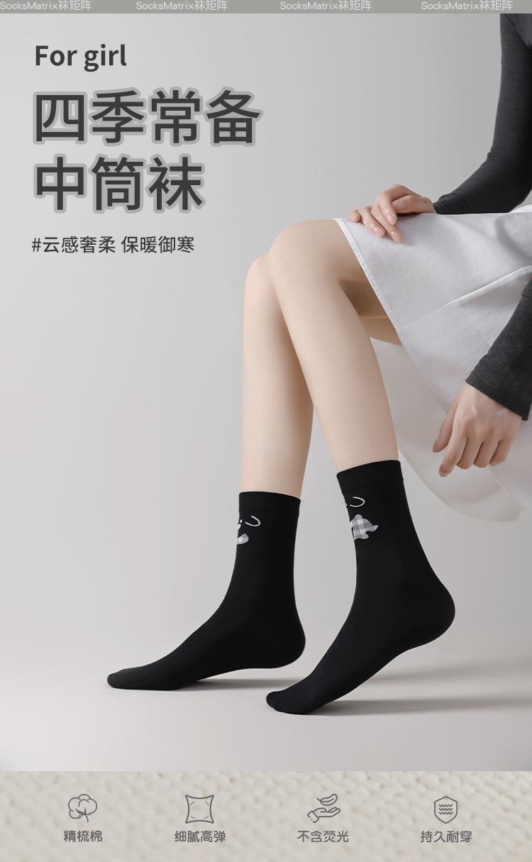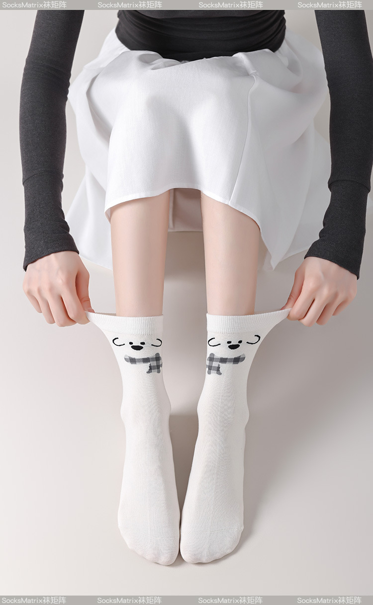 [체크무늬 강아지] 3켤레 세트 봄/가을 여성용 중목 양말, 만화 캐릭터 무봉제 면 양말, 통기성 좋은 얇은 중목 양말