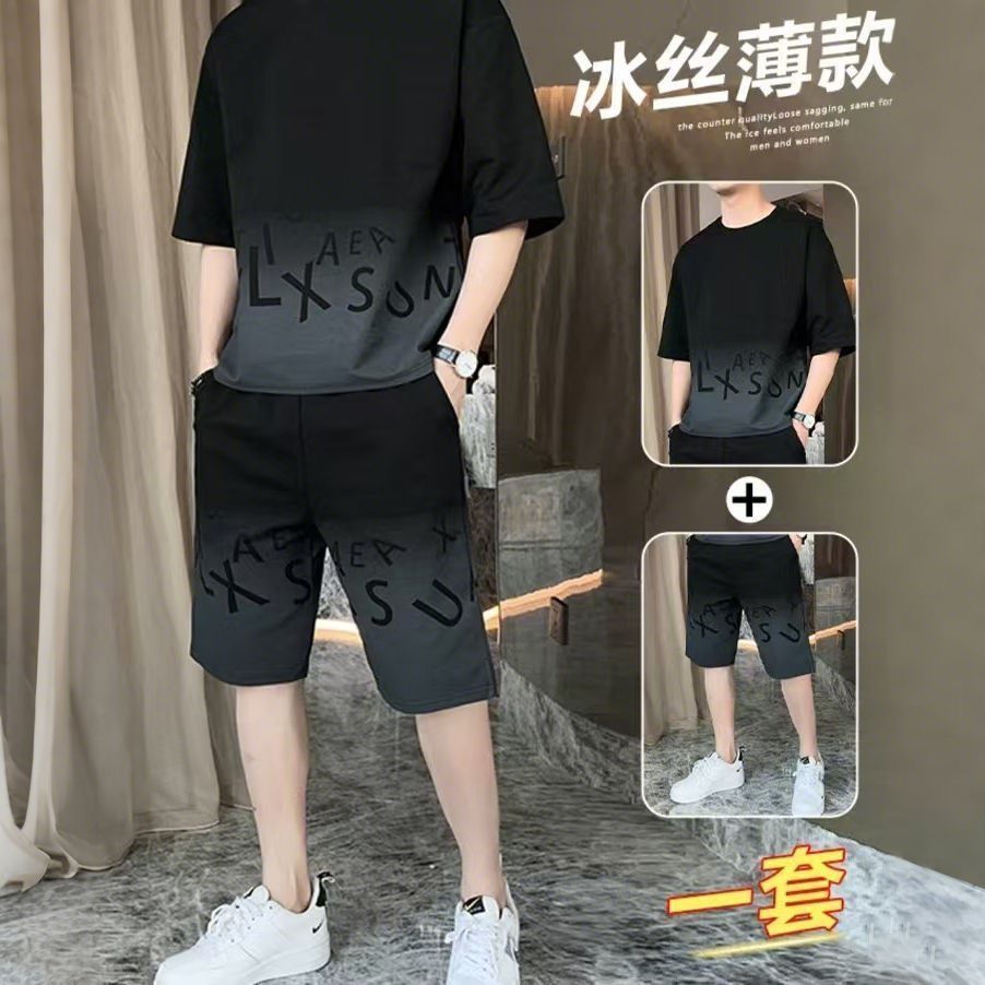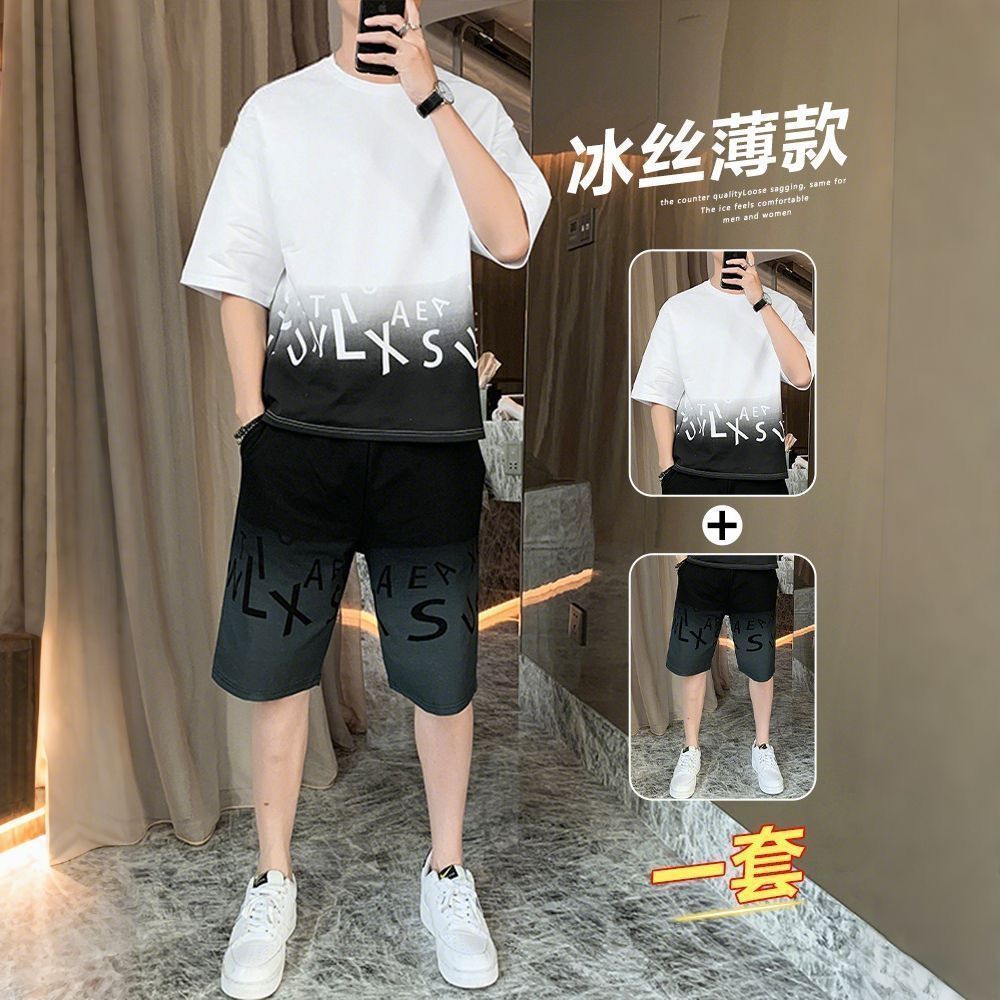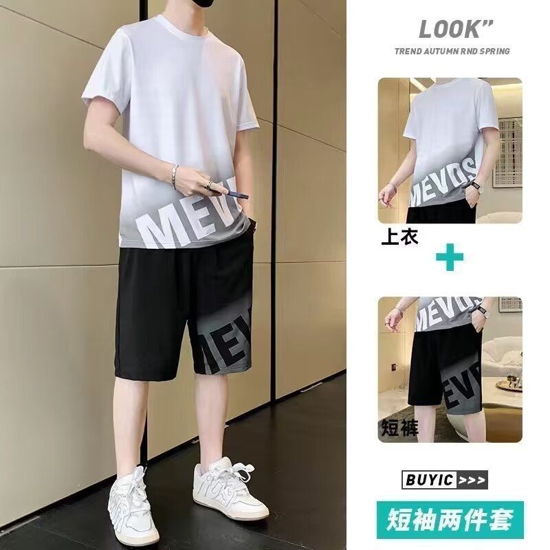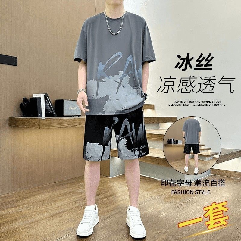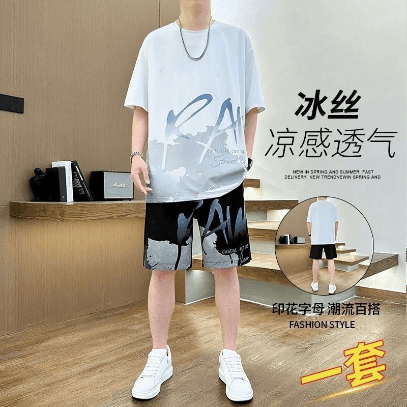 남성용 여름 아이스 실크 얇은 속건성 반팔 티셔츠 반바지 캐주얼 운동복 잘생긴 의상 세트