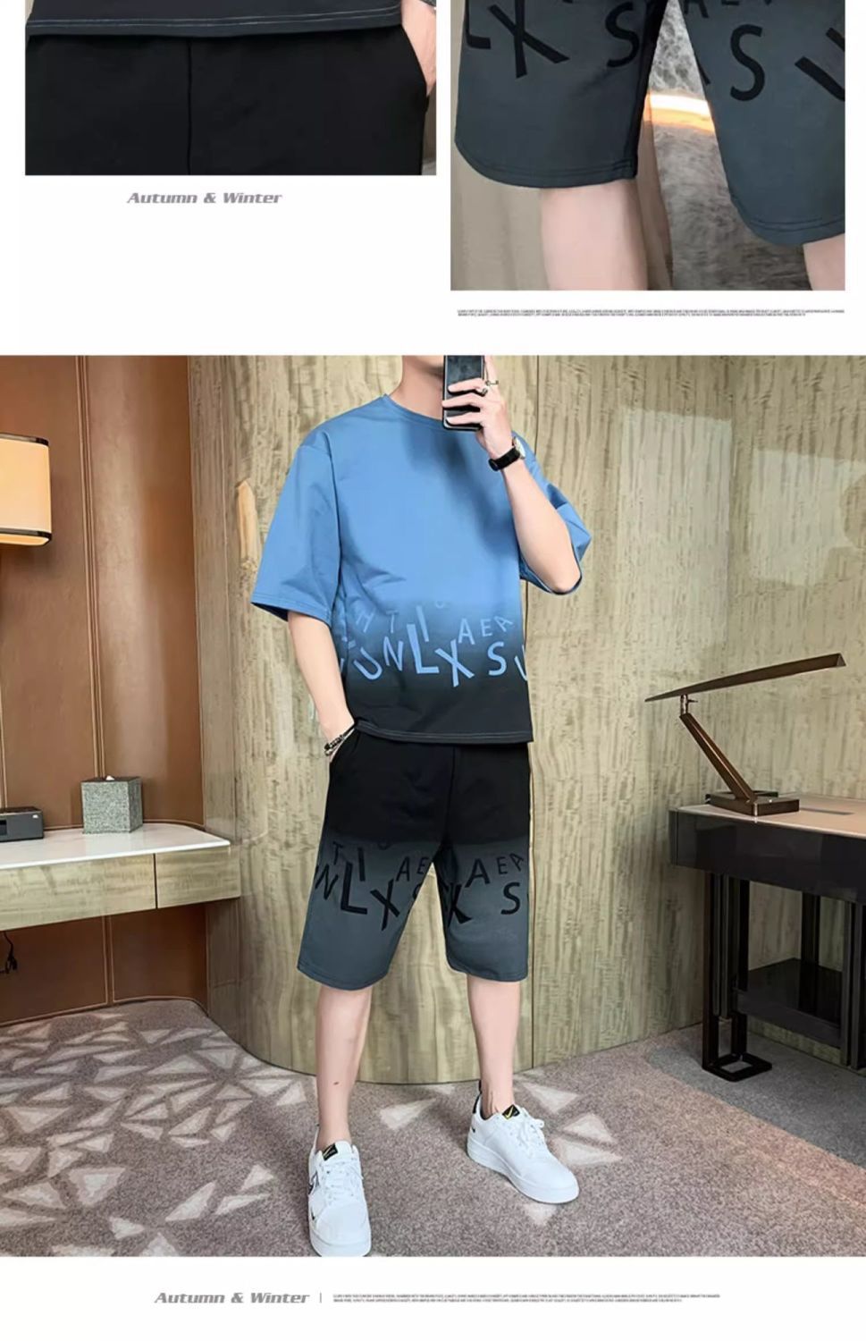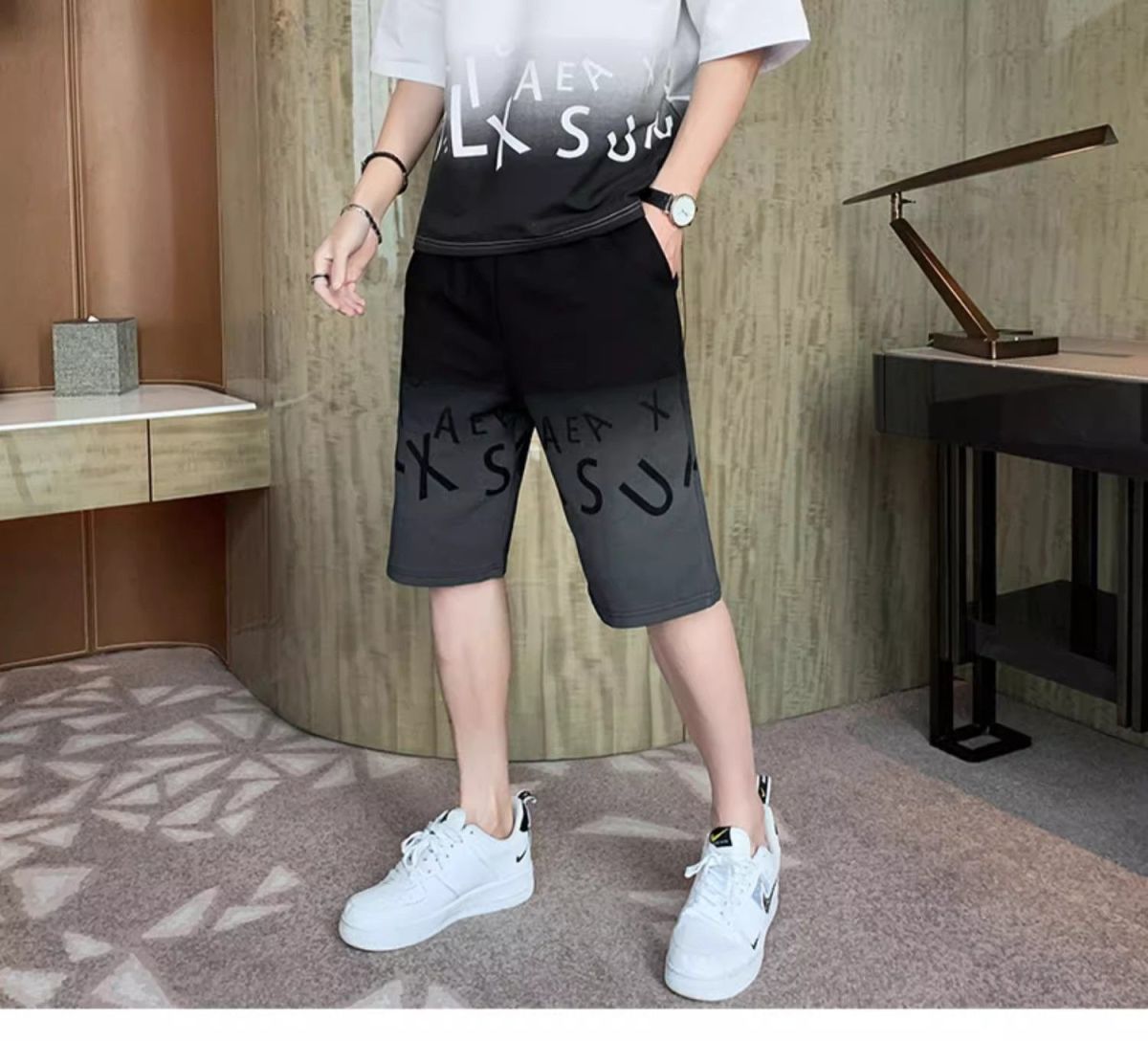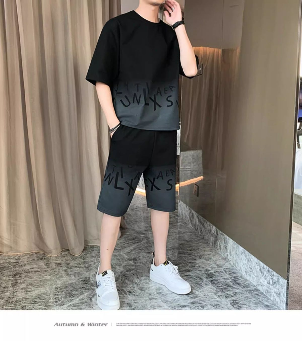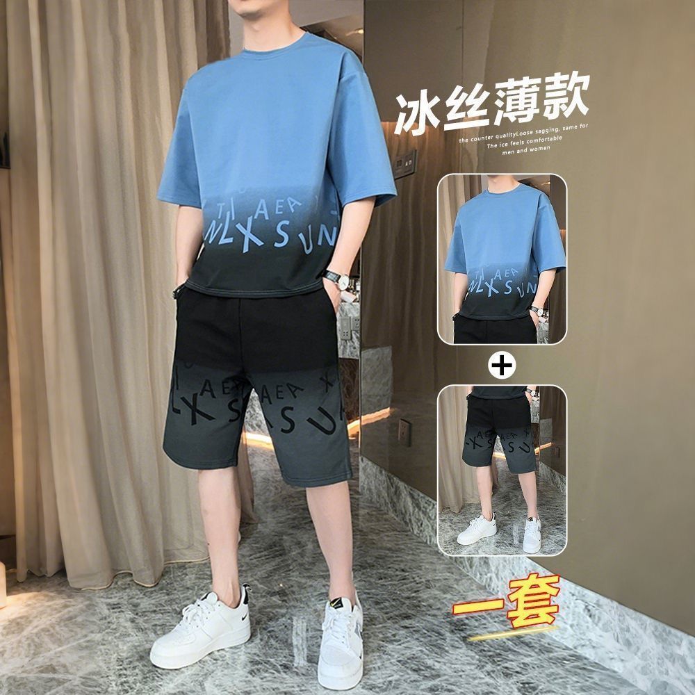 남성용 여름 아이스 실크 얇은 속건성 반팔 티셔츠 반바지 캐주얼 운동복 잘생긴 의상 세트