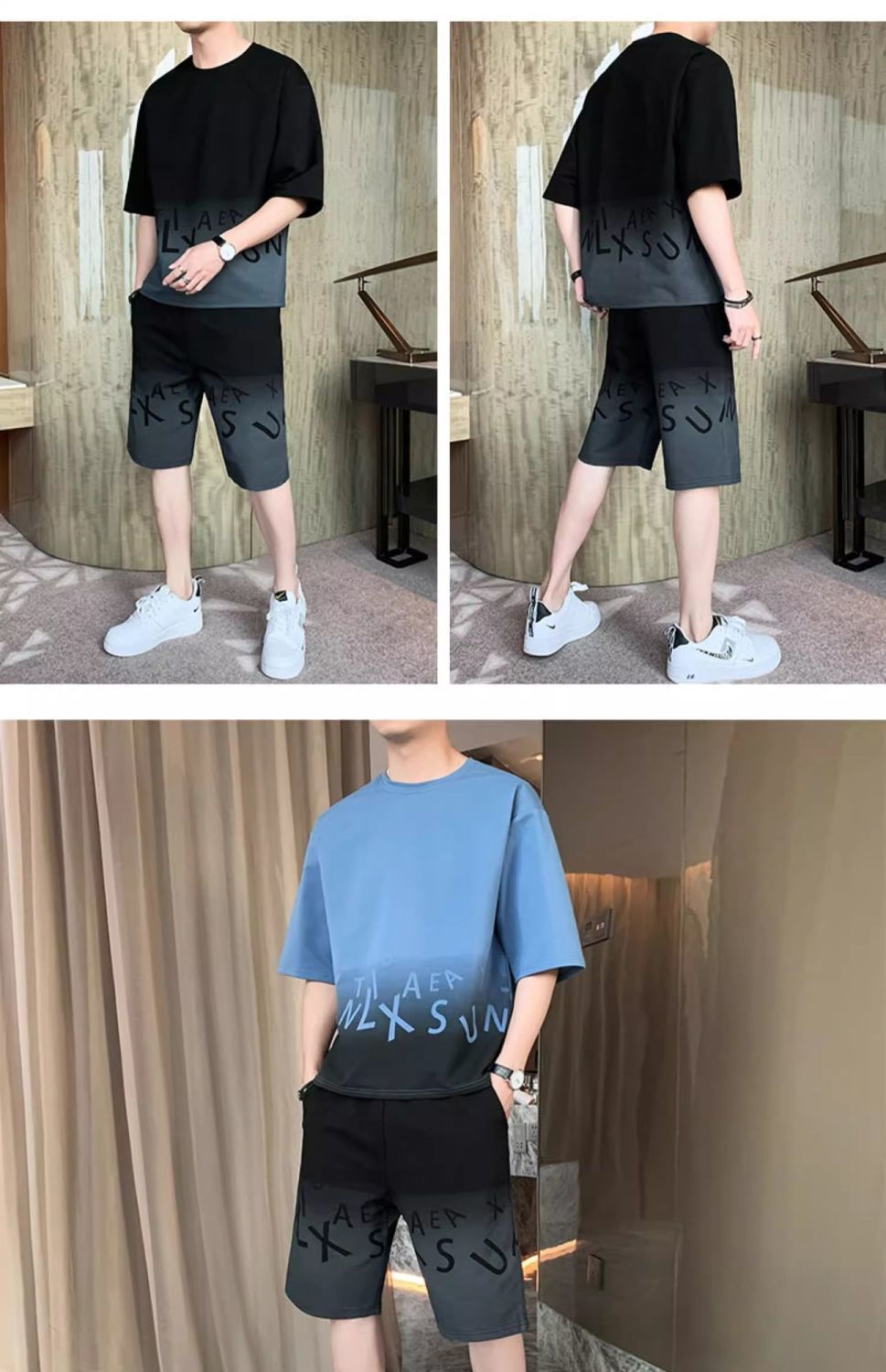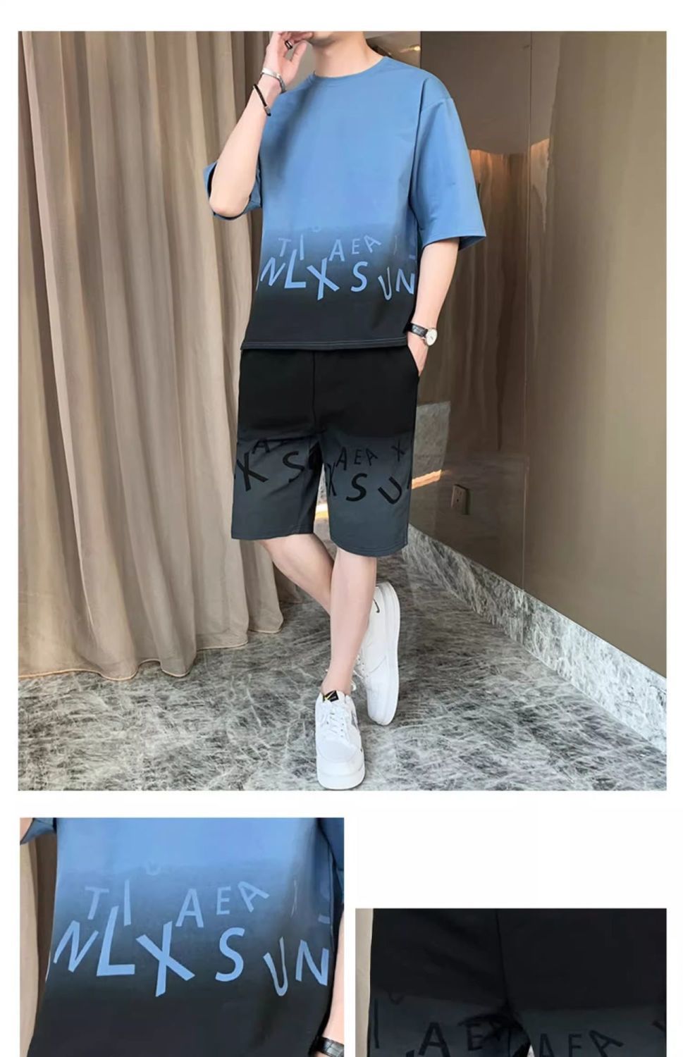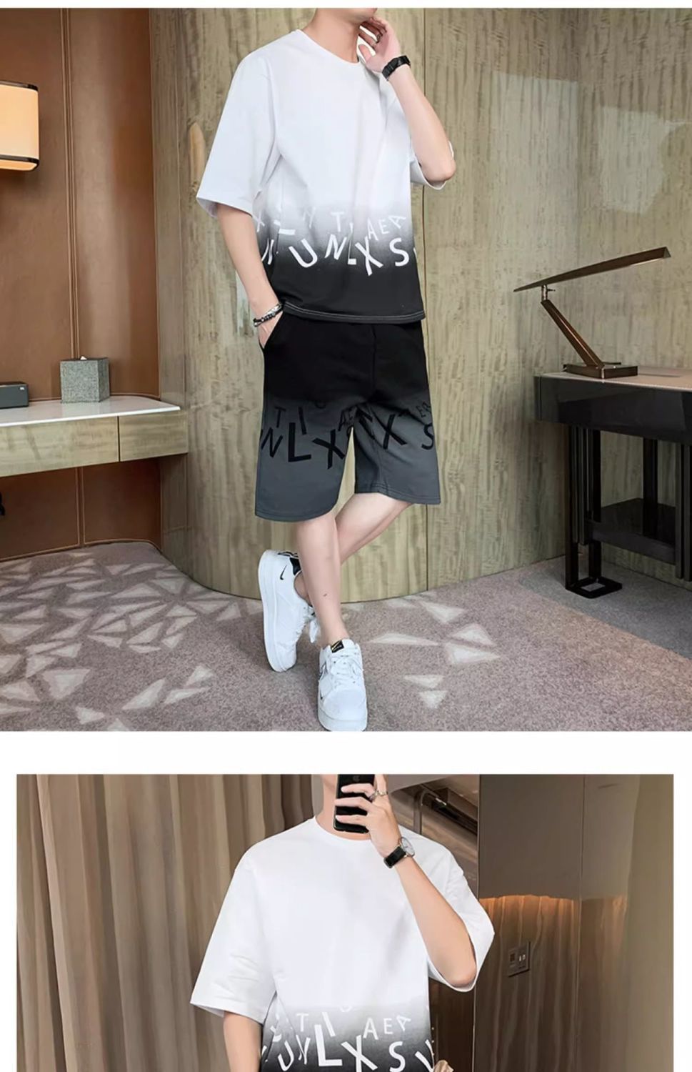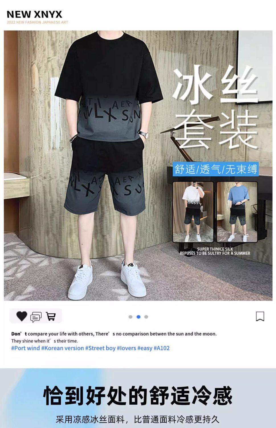 남성용 여름 아이스 실크 얇은 속건성 반팔 티셔츠 반바지 캐주얼 운동복 잘생긴 의상 세트스토어 가기