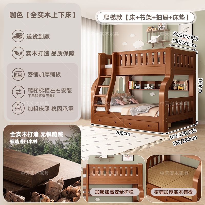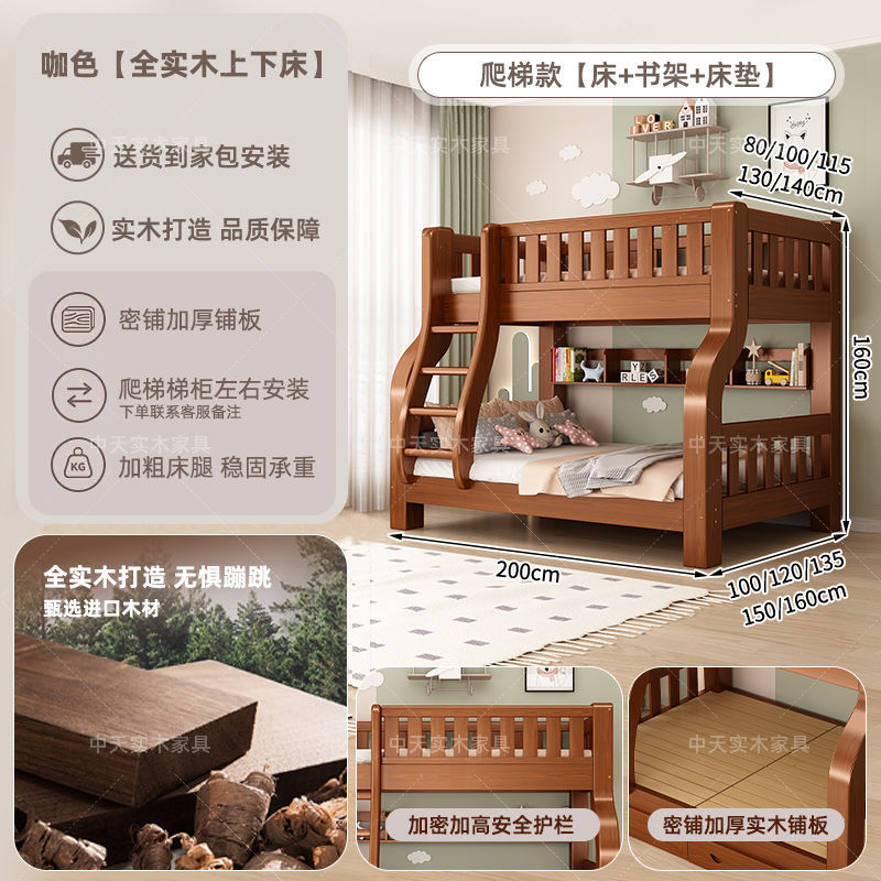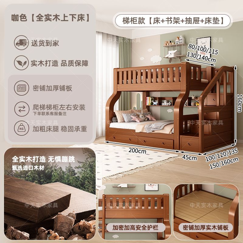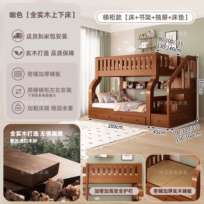• 카멜 색상 사다리형 침대 + 책장 + 서랍 + 매트리스 - 2층 ✓☆
