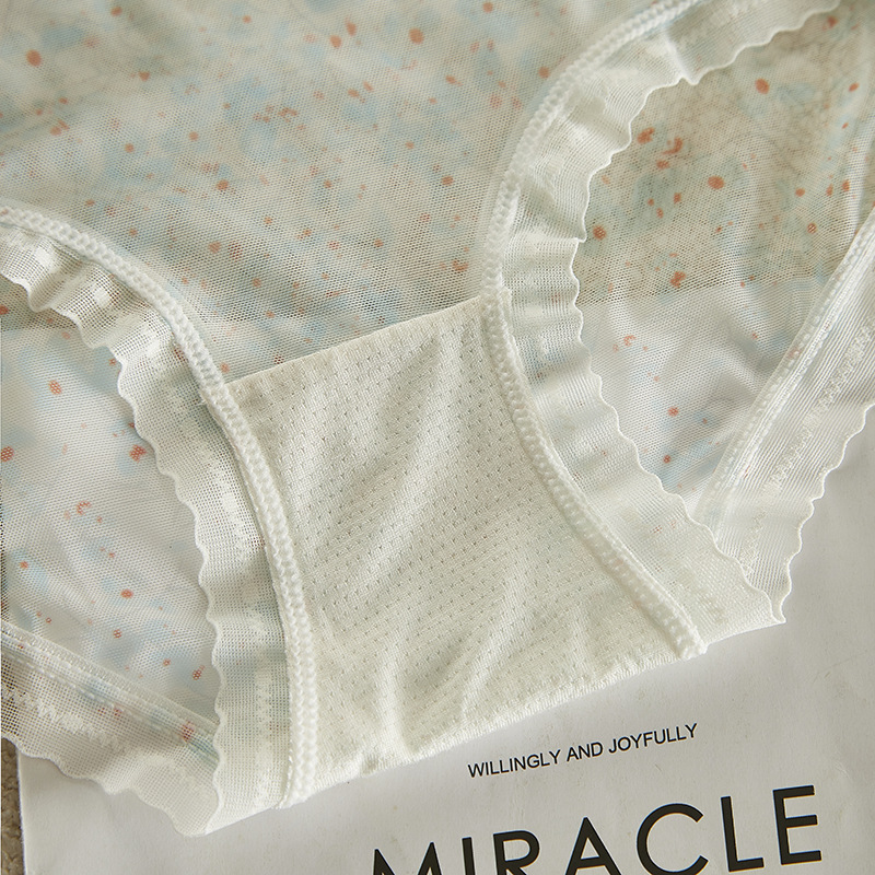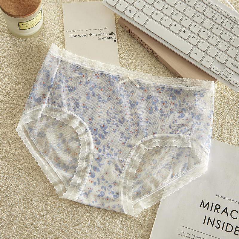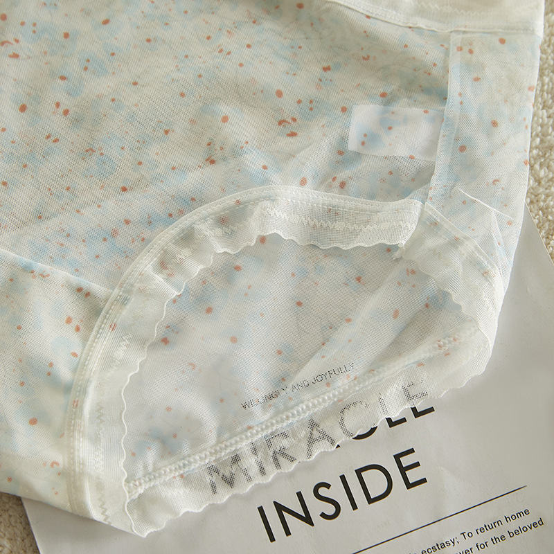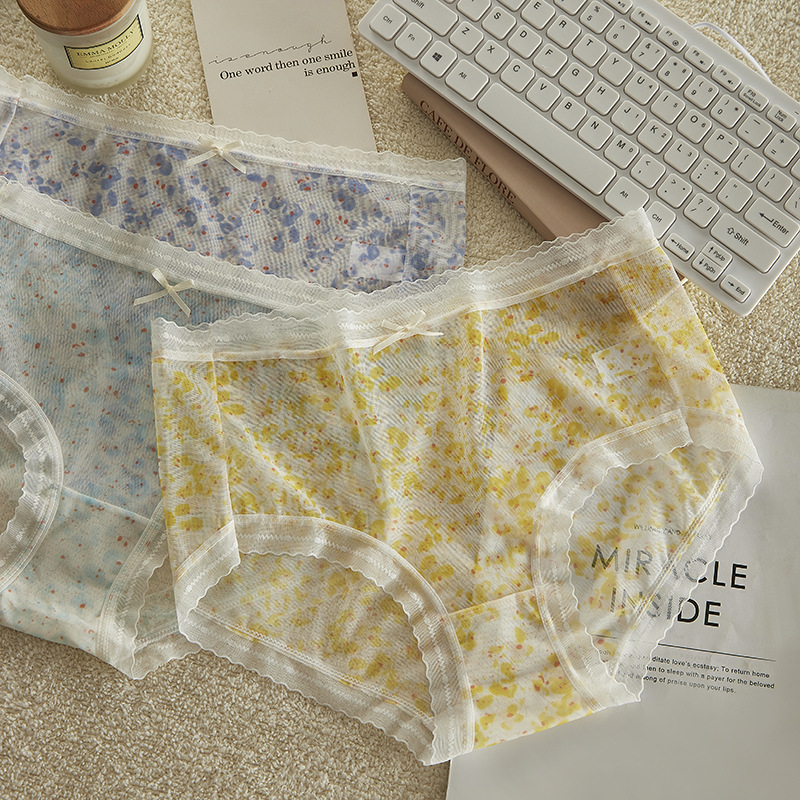 여름 달콤한 소녀 속옷 작은 꽃 무늬 가볍고 얇은 고탄성 통기성 누드 느낌 뽕나무 실크 바닥 가랑이 팬티 여성용 메쉬