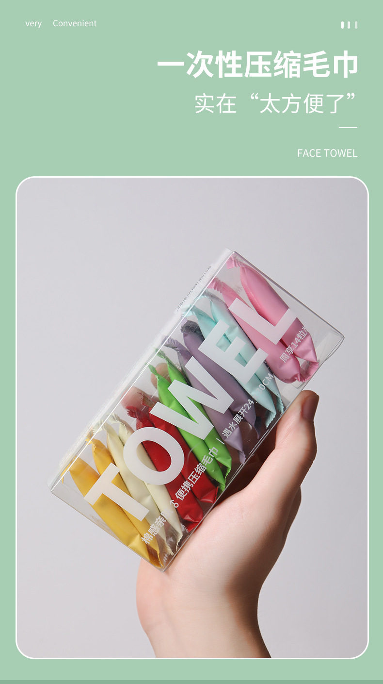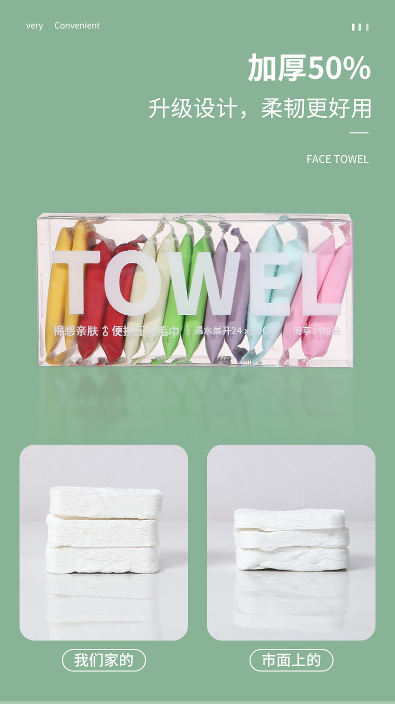 • 다채로운 상자에 14개의 압축 수건이 들어 있습니다.