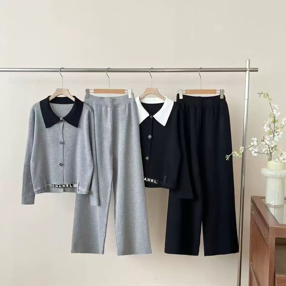 크로스보더 유럽과 미국의 컬러 블록 라펠 탑 니트 가디건 슈트 여성스러운 패셔너블한 와이드 팬츠 통근 투피스 세트스토어 가기