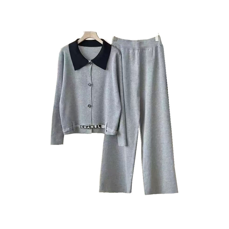 크로스보더 유럽과 미국의 컬러 블록 라펠 탑 니트 가디건 슈트 여성스러운 패셔너블한 와이드 팬츠 통근 투피스 세트