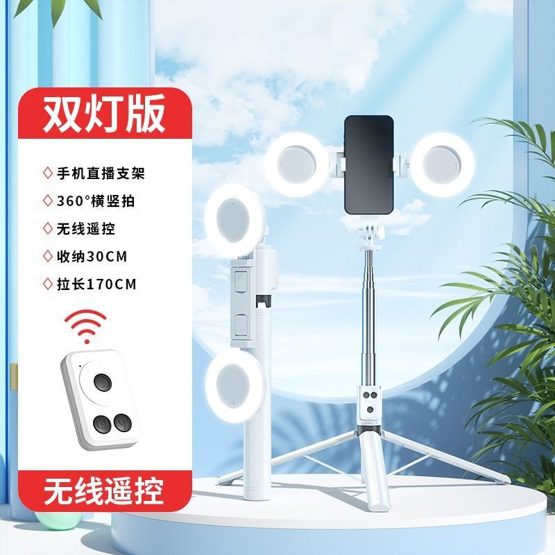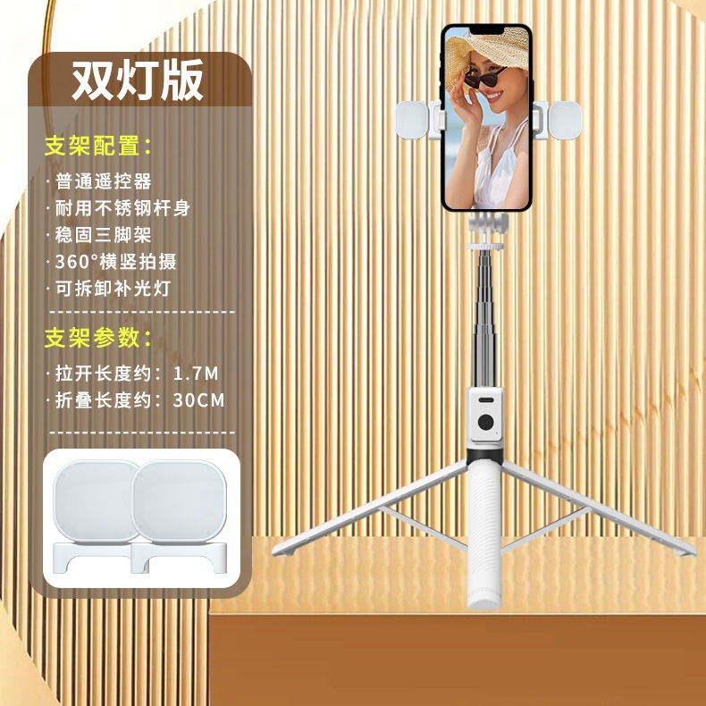 • 더블 헤드라이트 모델 화이트 [1.7m 스테인리스 스틸 튜브 일체형 셀카봉 + 충전 다기능 블루투스 리모컨 + 대형 원형 필라이트 2개]