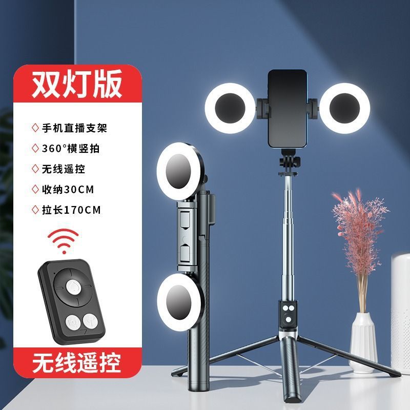 • 더블 헤드라이트 모델 블랙 [1.7m 스테인레스 스틸 튜브 일체형 셀카봉 + 충전 다기능 블루투스 리모컨 + 대형 원형 필라이트 2개]