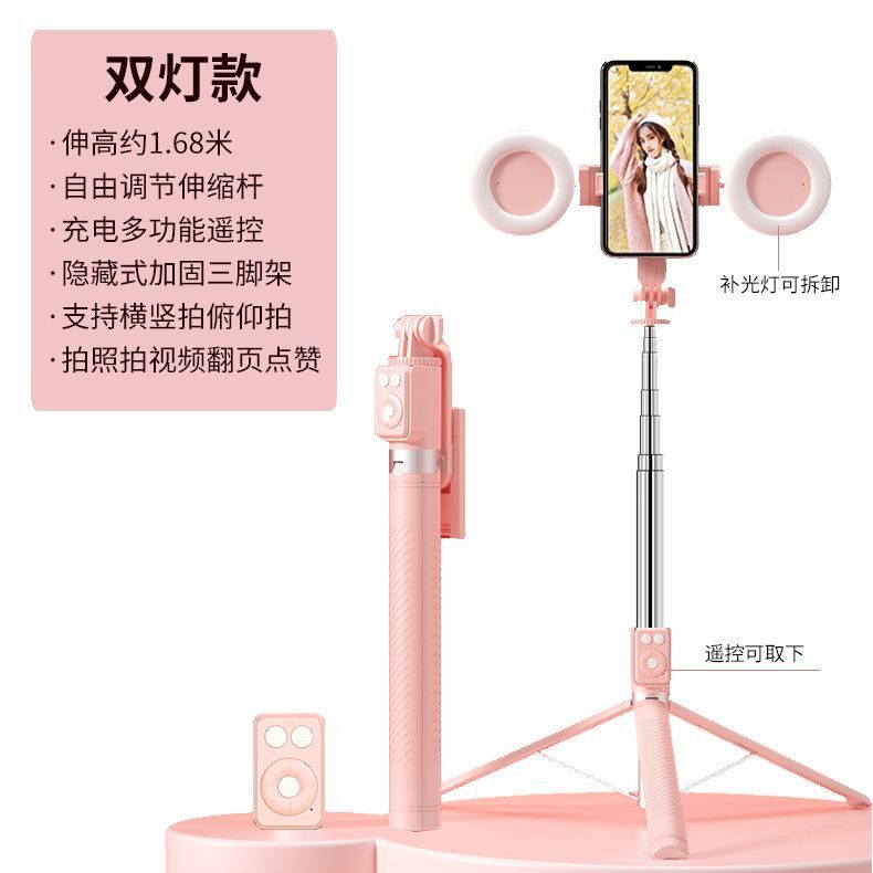• 더블 헤드라이트 모델 핑크 [1.7m 스테인레스 스틸 튜브 일체형 셀카봉 + 충전 다기능 블루투스 리모컨 + 대형 원형 필라이트 2개]