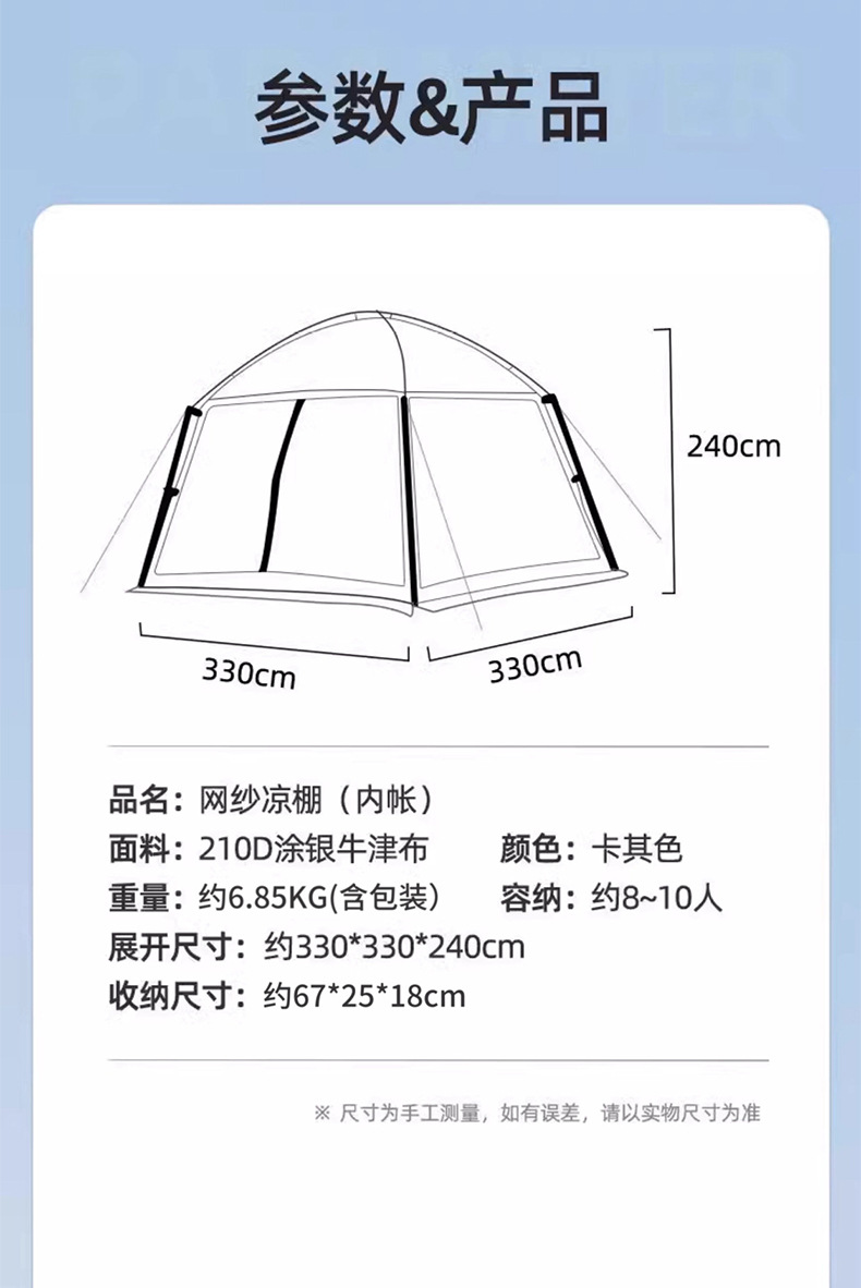 • 철 파이프 모델: 대형: 퍼걸러 + 외부 텐트 1개 + 현관 기둥 1쌍