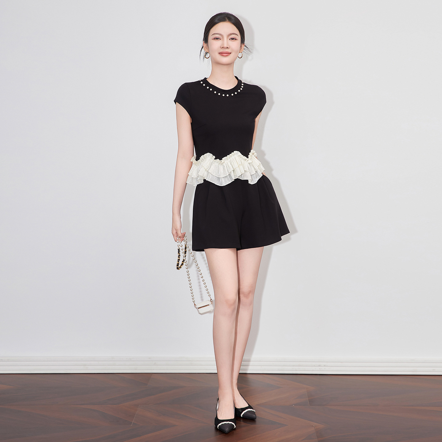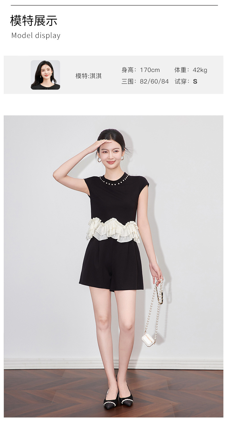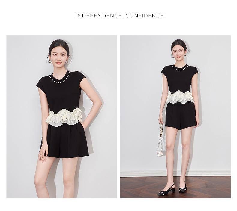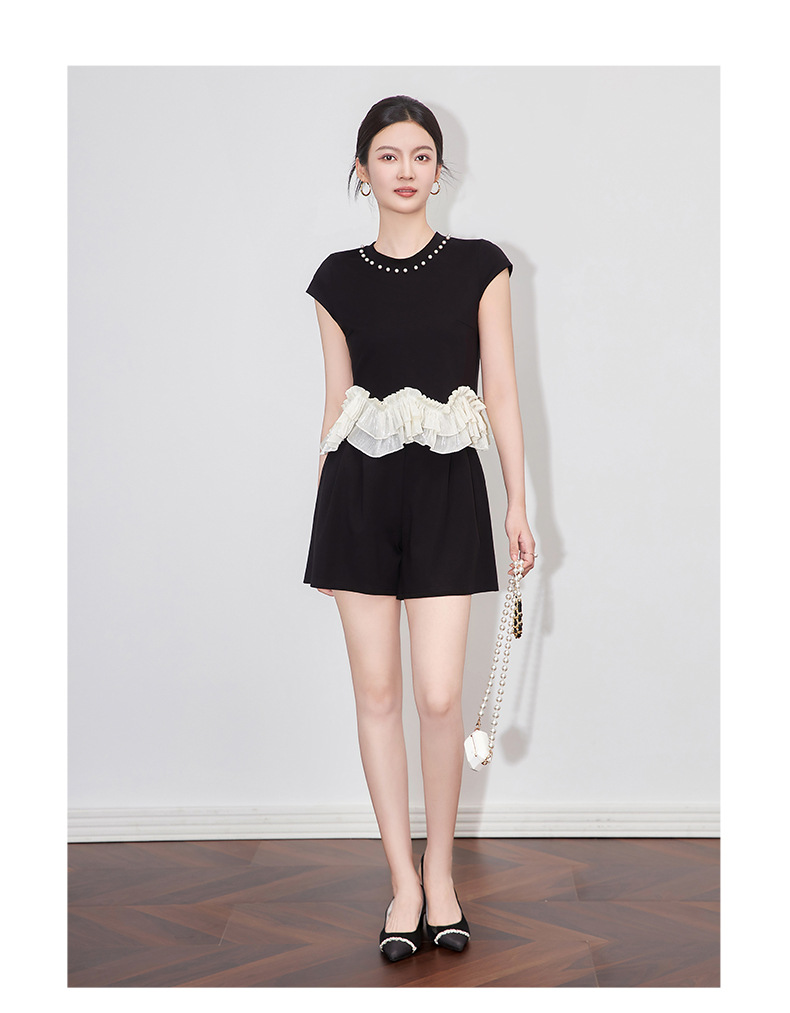 2509308-샤오샹펑 비즈 라운드넥 러플탑+패셔너블한 연령감소 반바지 세트 난유여성 여름스토어 가기