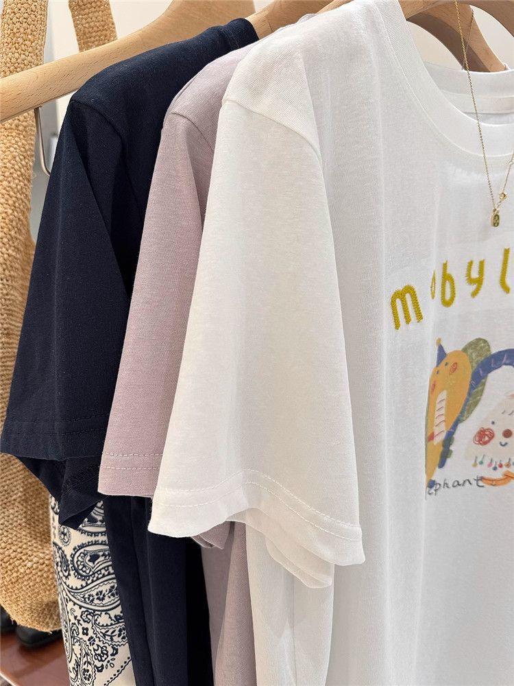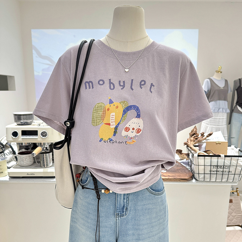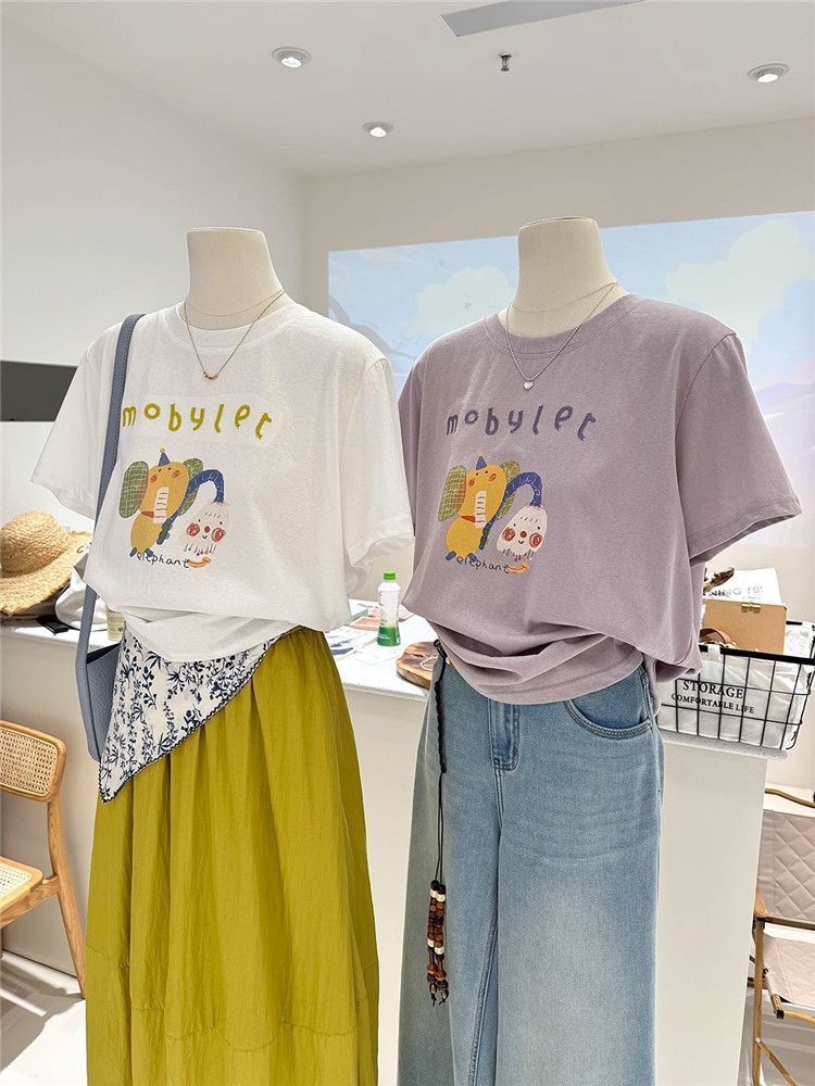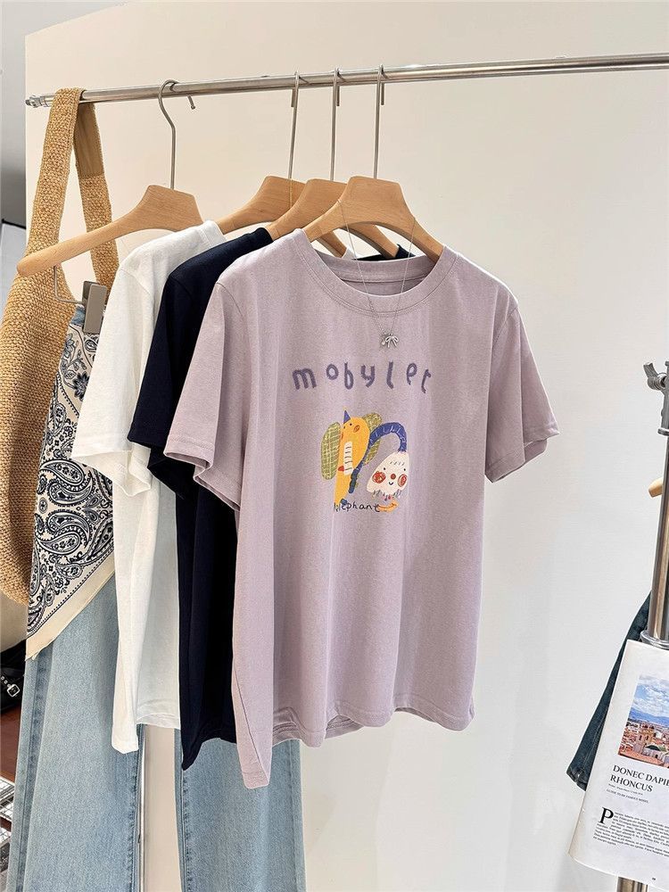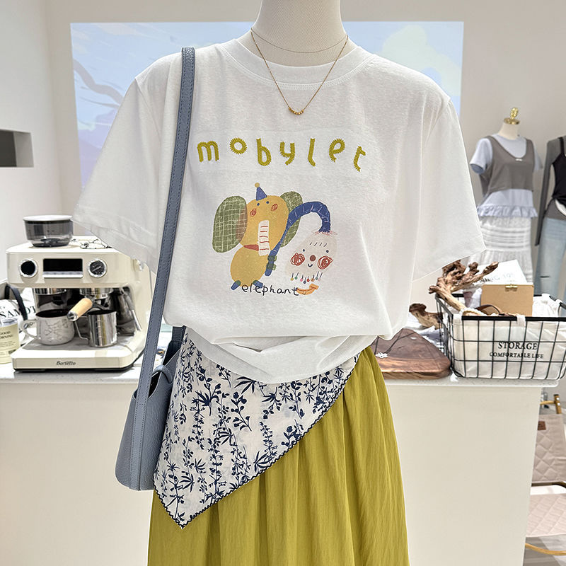 여름 신작 루즈하고 슬림한 반팔 한국 스타일 다용도 만화 연령 감소 프린트 바닥 셔츠 얇은 티셔츠 여성상의