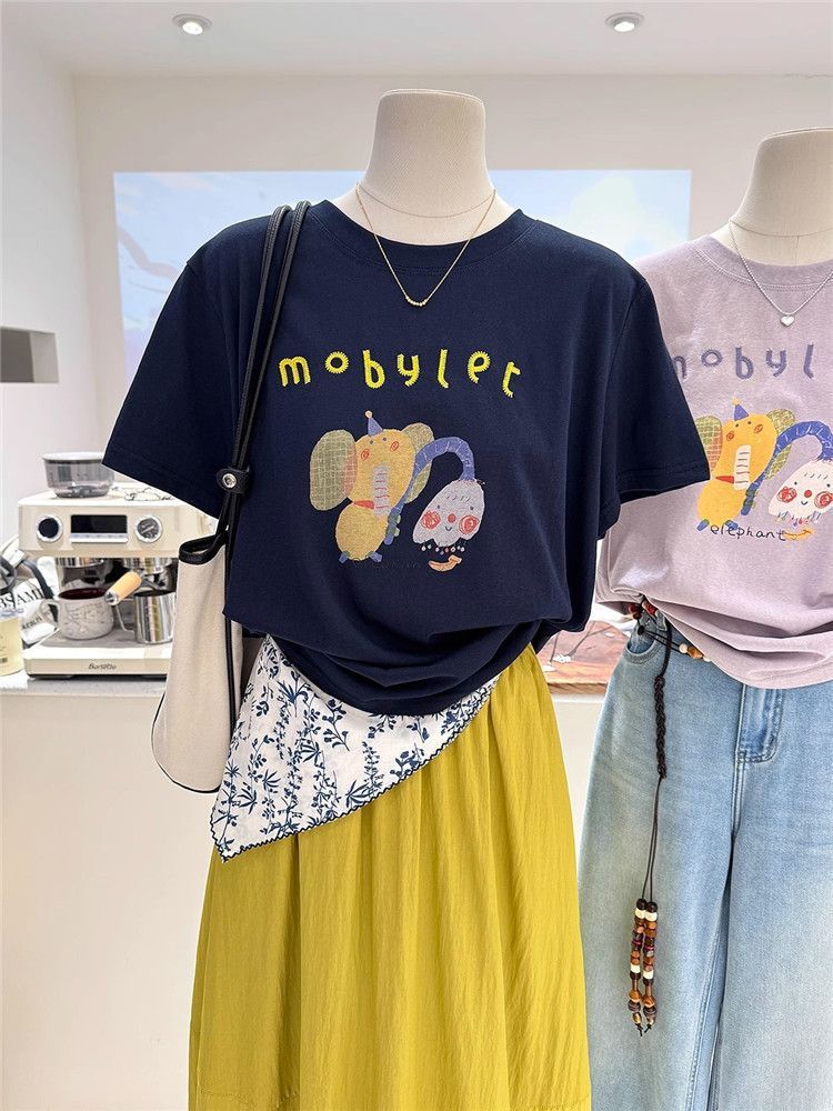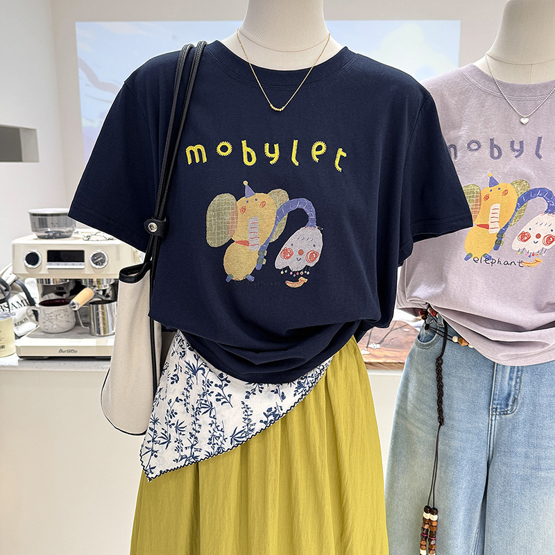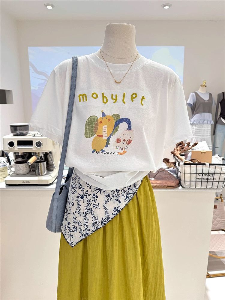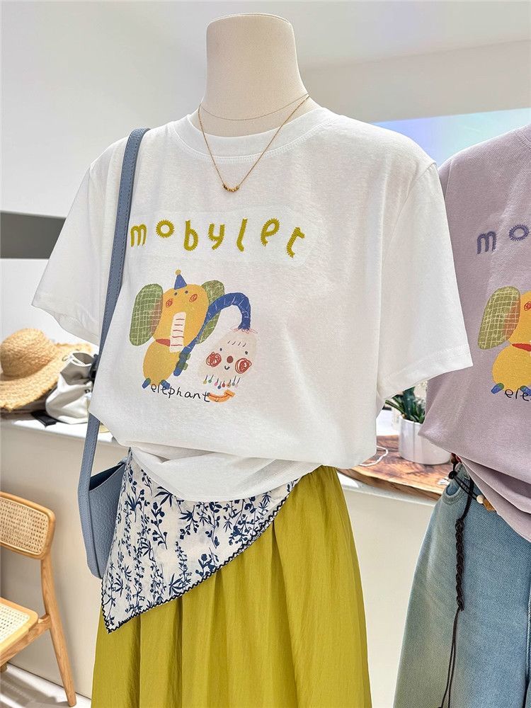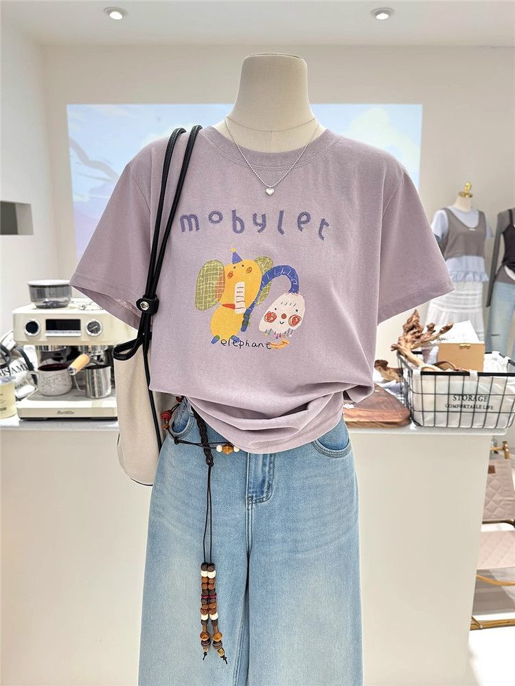 여름 신작 루즈하고 슬림한 반팔 한국 스타일 다용도 만화 연령 감소 프린트 바닥 셔츠 얇은 티셔츠 여성상의