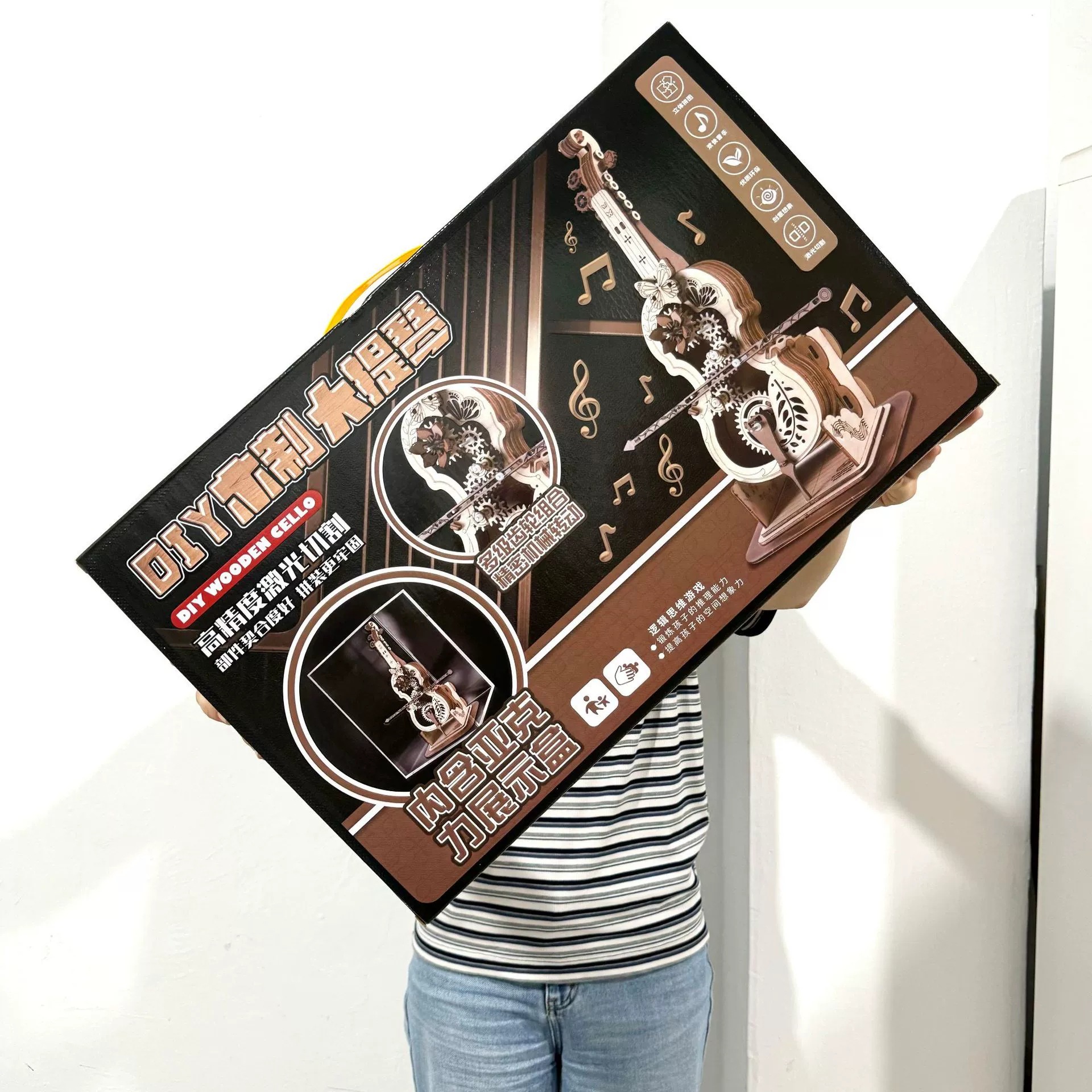 소녀 생일 선물을위한 아크릴 디스플레이 상자가있는 오르골 첼로 나무 바이올린 조립 크리 에이 티브 장식품스토어 가기