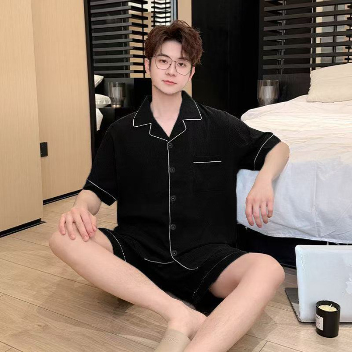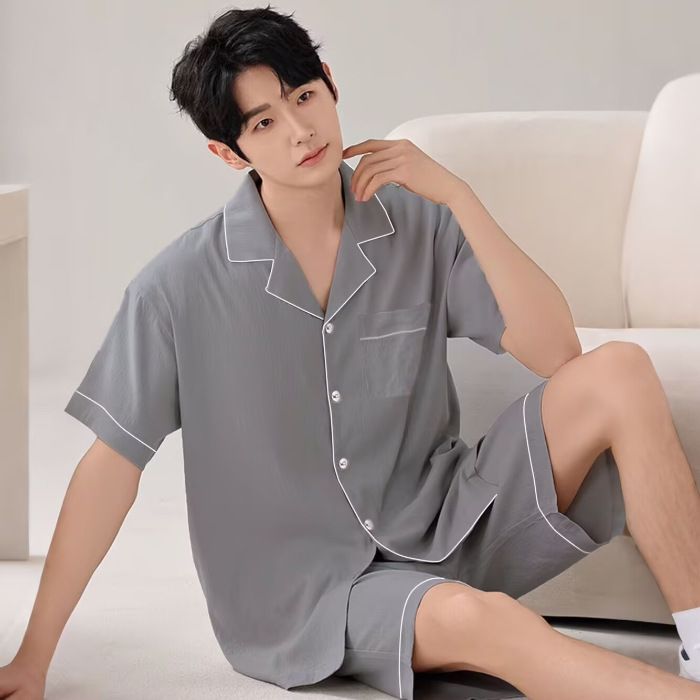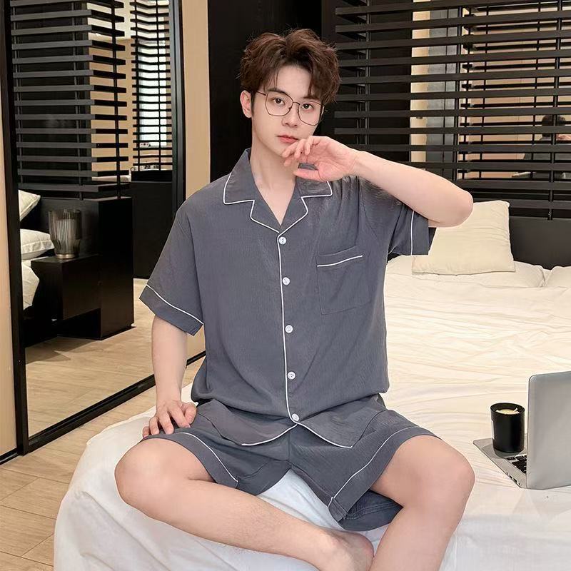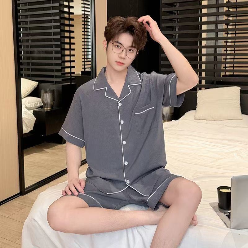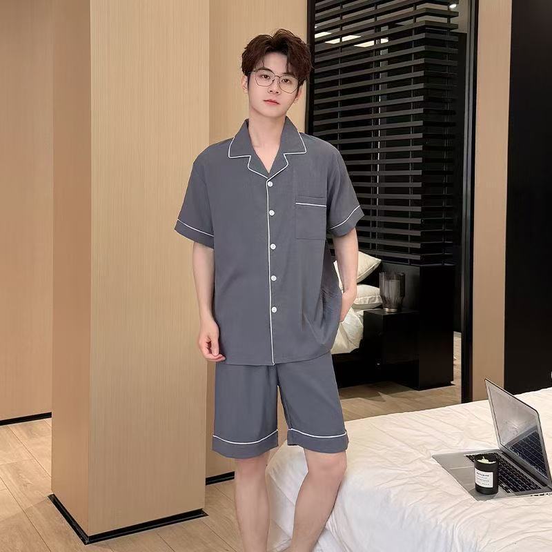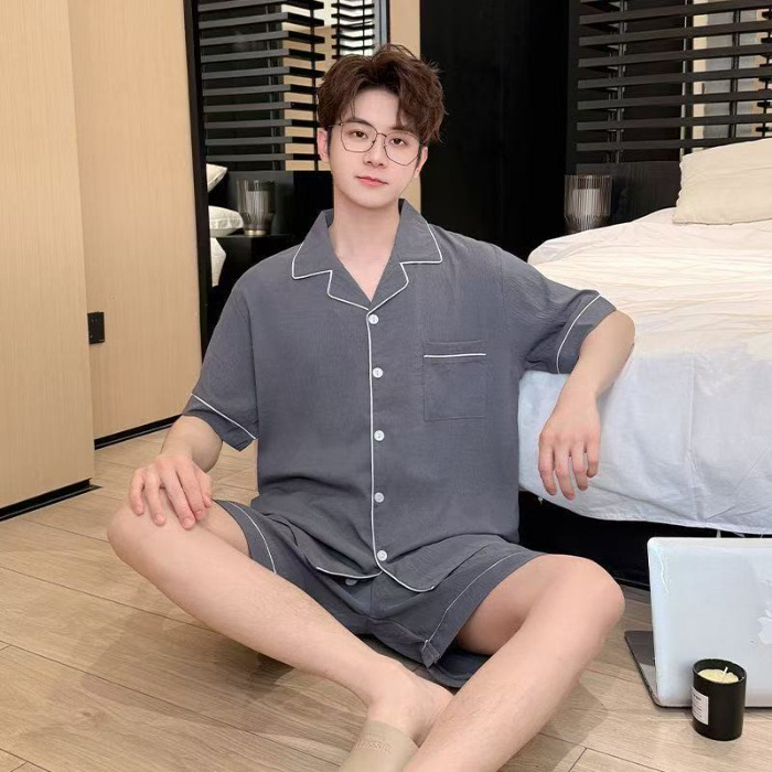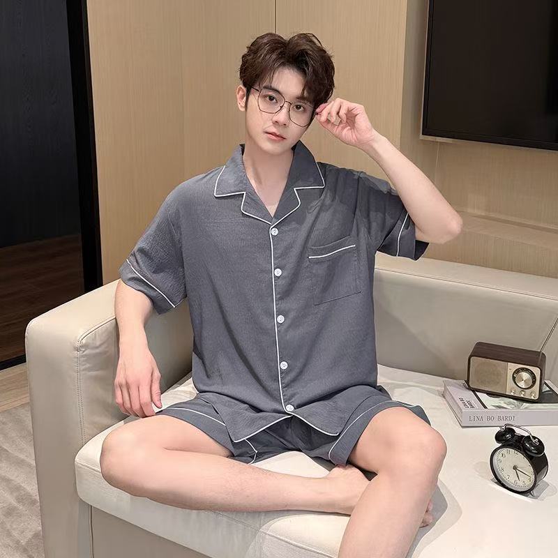 Yunduo 면 잠옷 남성 여름 카디건 반팔 반바지 캐주얼 심플 Douyin Xiaohongshu 인기 홈웨어 세트